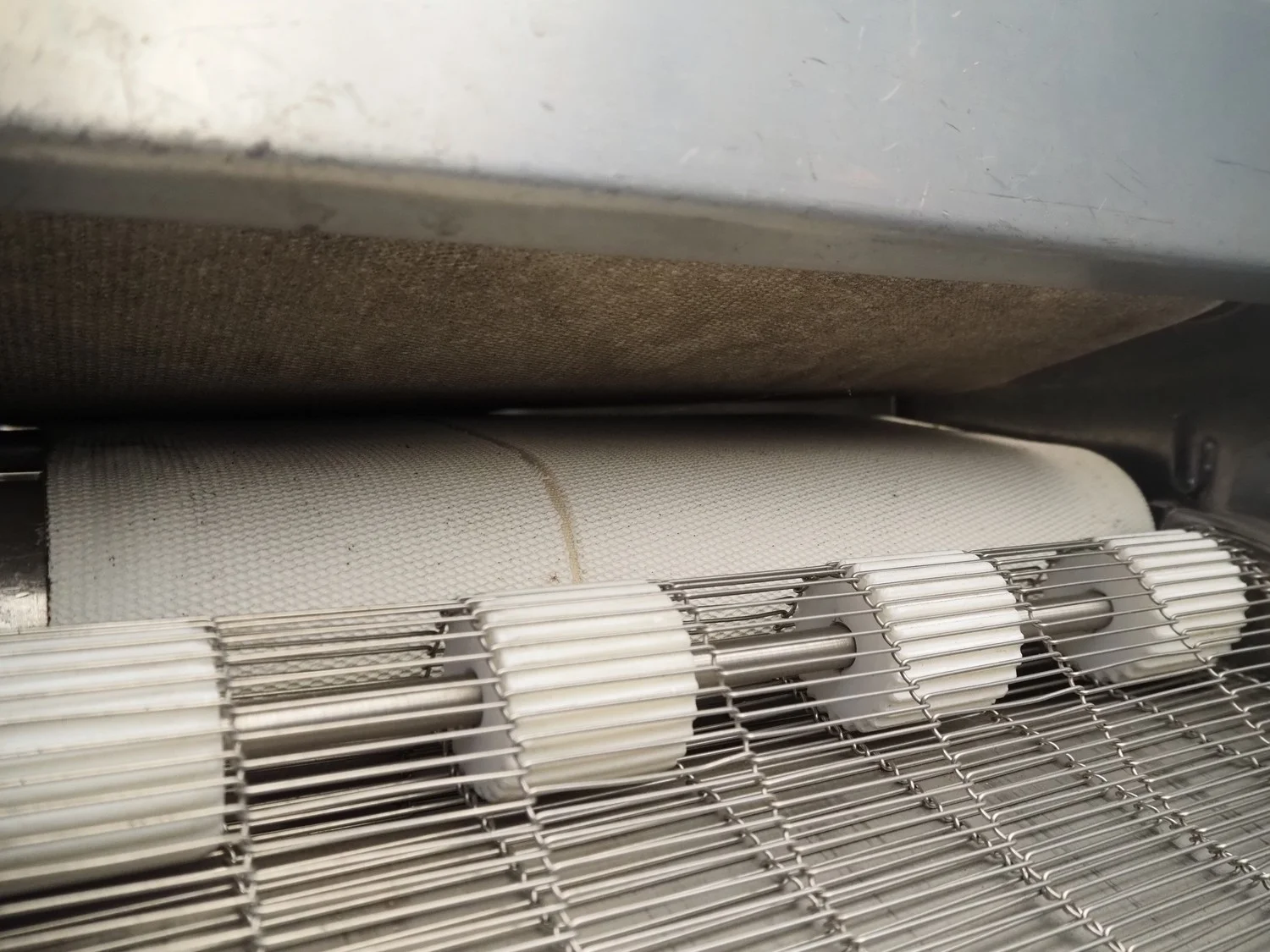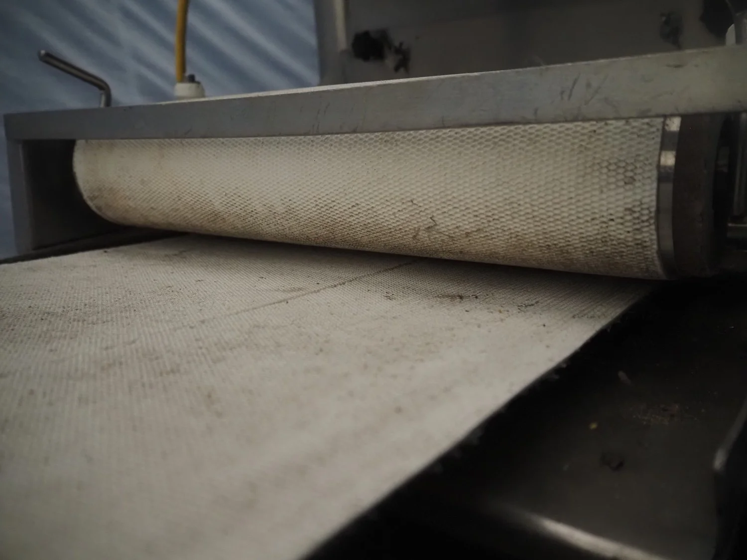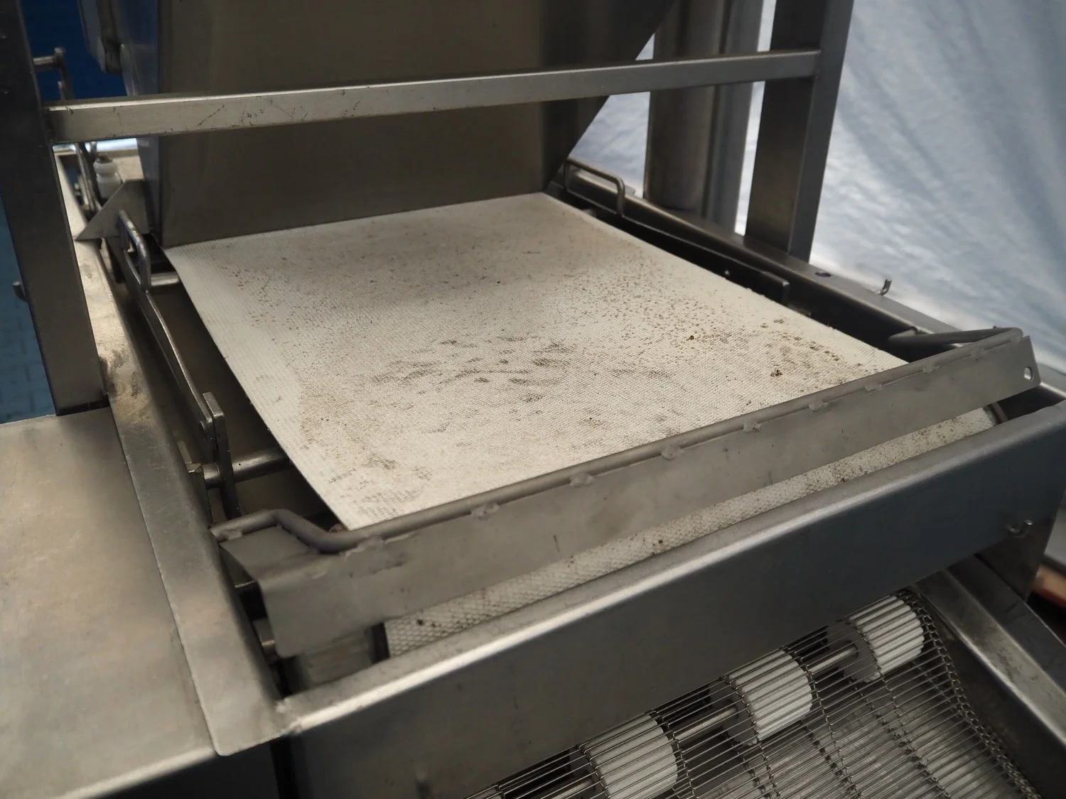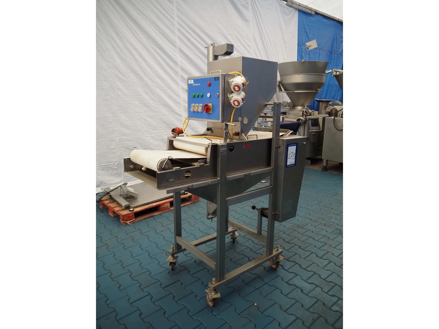 Koppens mobile croquette rolling machine, type: CR 400, machine number: CR400-21, 380 V, 3 Ph, 50 Hz, 3 A, plastic belt, belt width: 400 mm, s/s mesh outfeed belt, belt width: 400 mm, total dimensions: 1750 mm x 750 mm x 2000 mm. Incomplete.