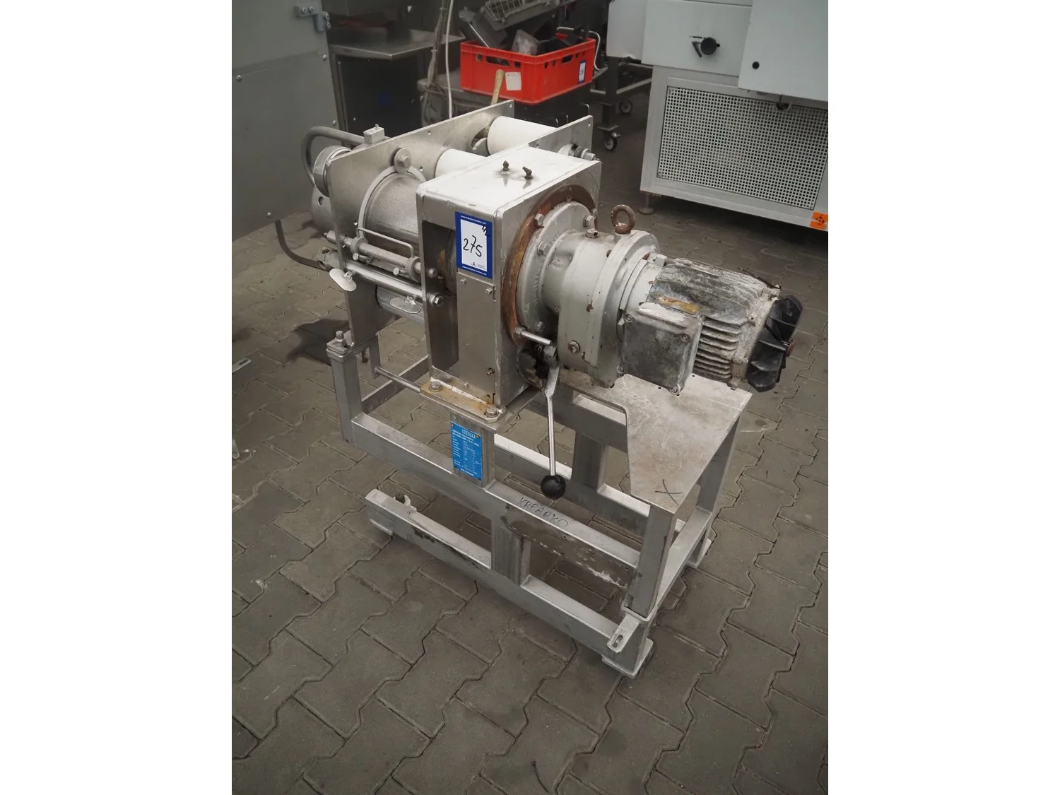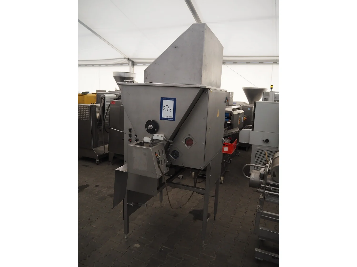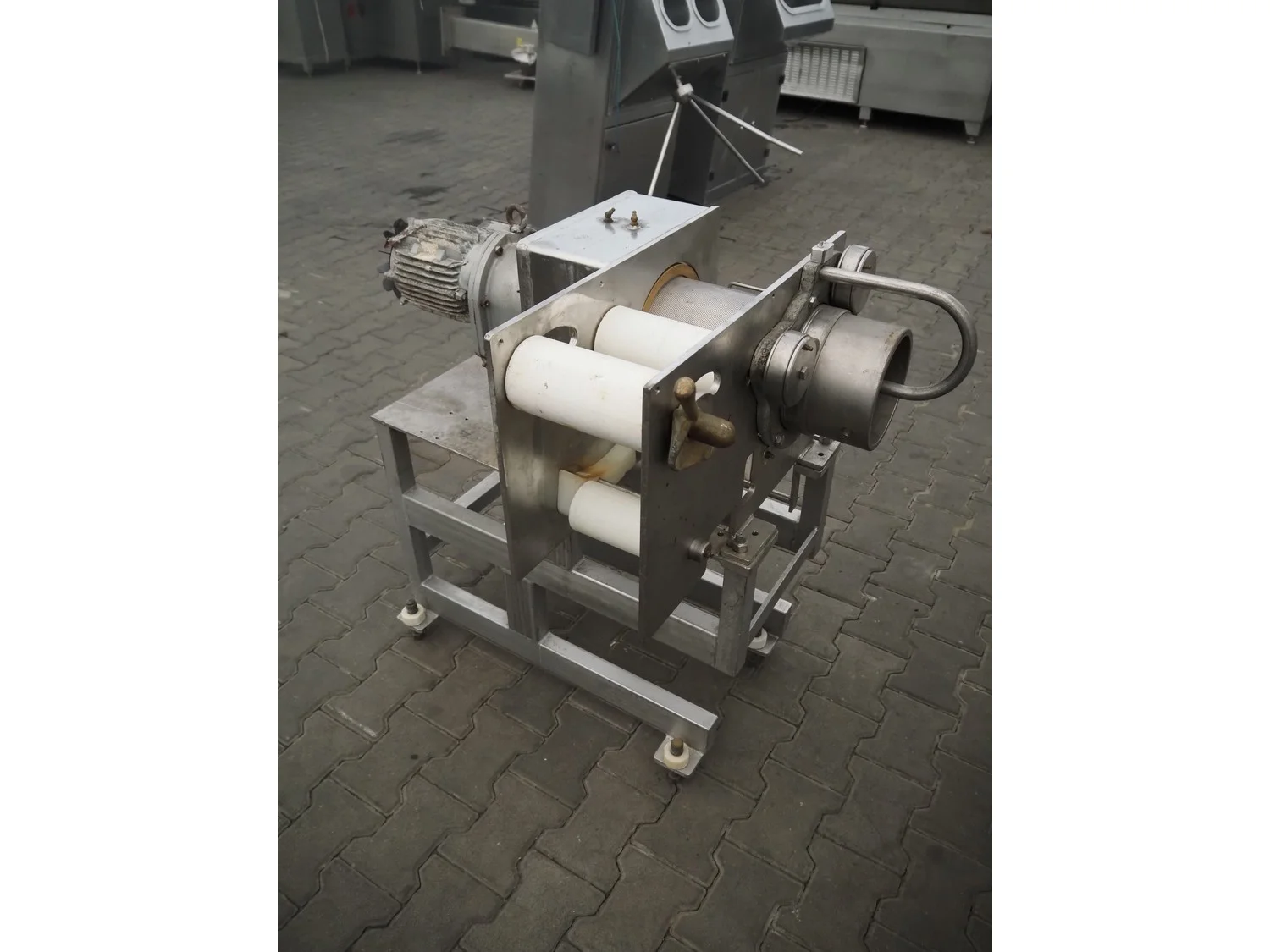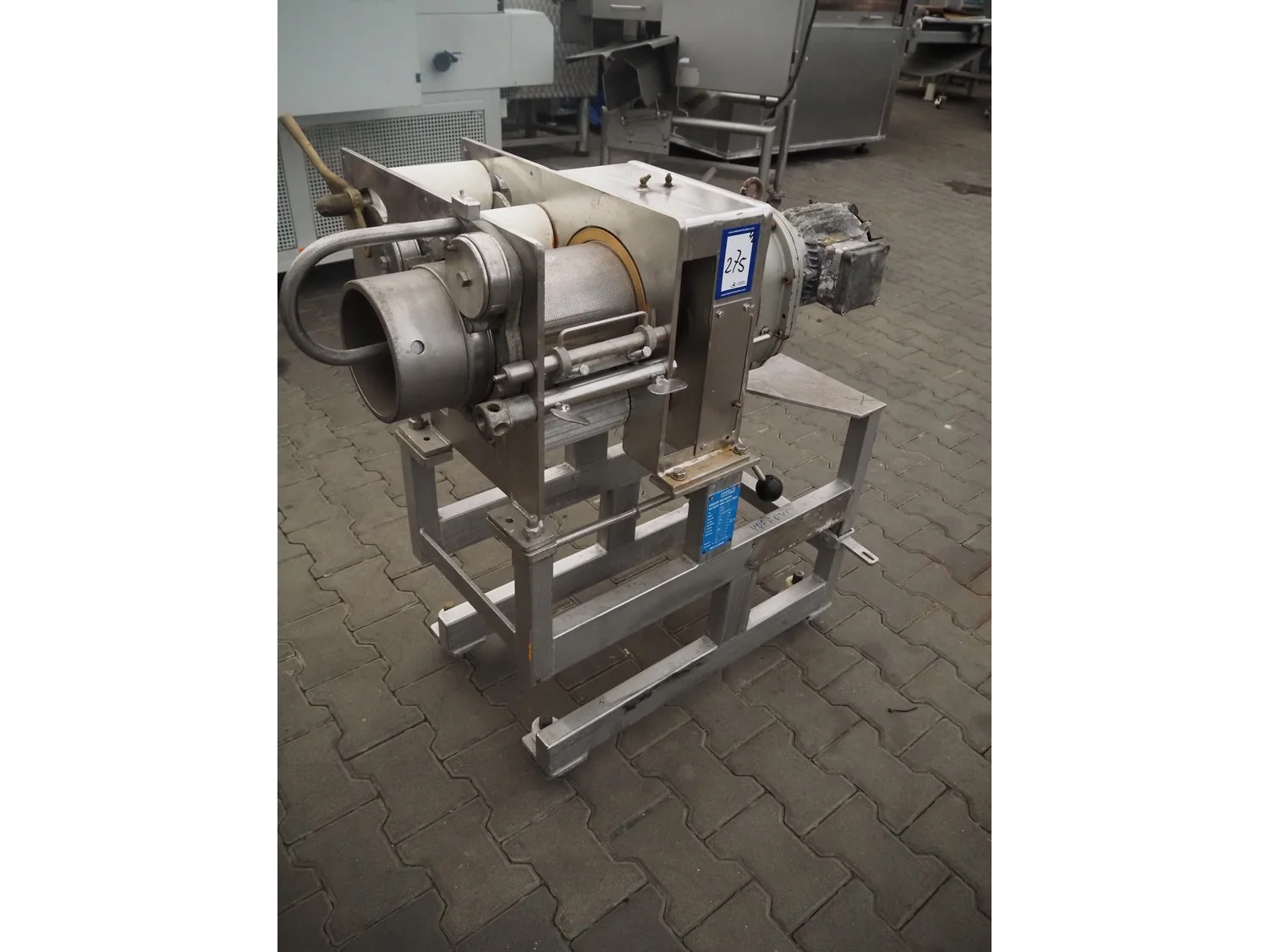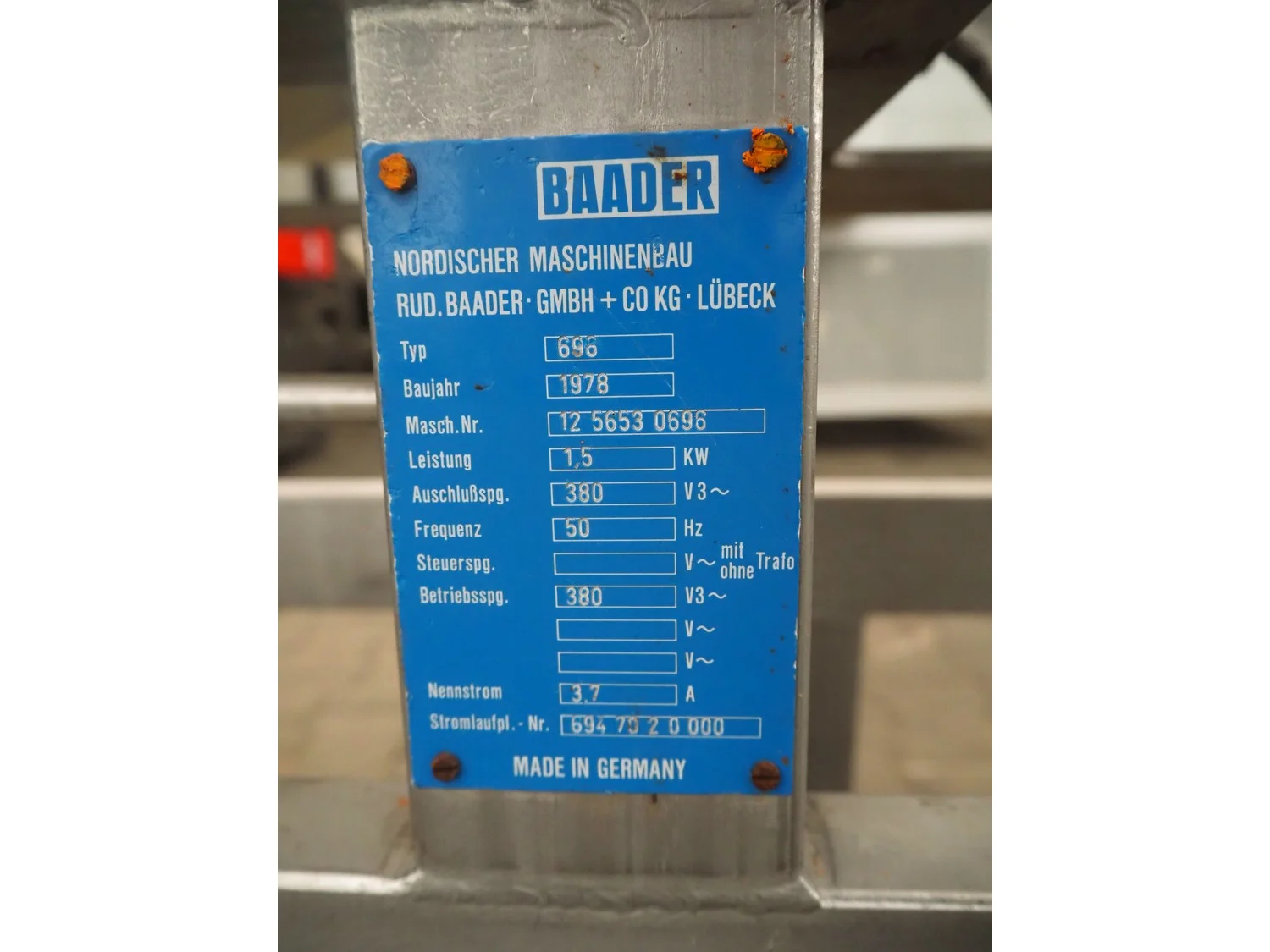 Baader mobile separator, type: 696, machine number: 12 5653 0696, year of construction: 1978, 380 V, 3 Ph, 50 Hz, 3.7 A, perforations drum: 1 mm and 3 mm, total dimensions: 1100 mm x 650 mm x 1040 mm. Including Baader infeed bunker, dimensions infeed bunker: 1350 mm x 900 mm x 2220 mm.