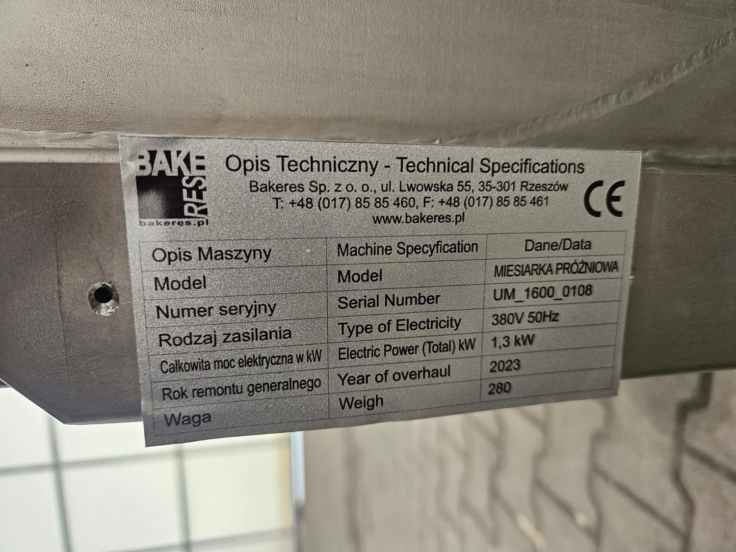 Bakeres Sp. z o.o. vacuum paddle mixer, model: MIESIARKA PRÓZNIOWA, serial number: UM_1600_0108, year of construction: 2023, 230 V, 50 Hz, 1.3 kW, weight: 280 kg, volume: 400 liter, dimensions: 1600 mm x 1150 mm x 1450 mm.