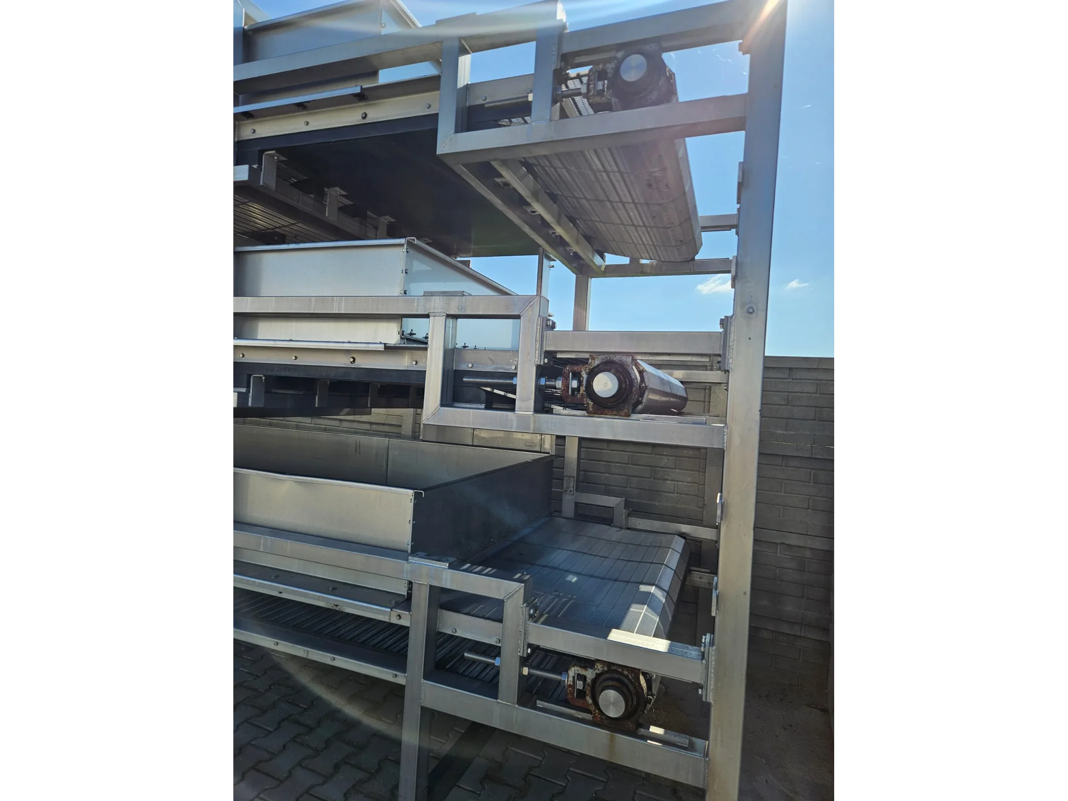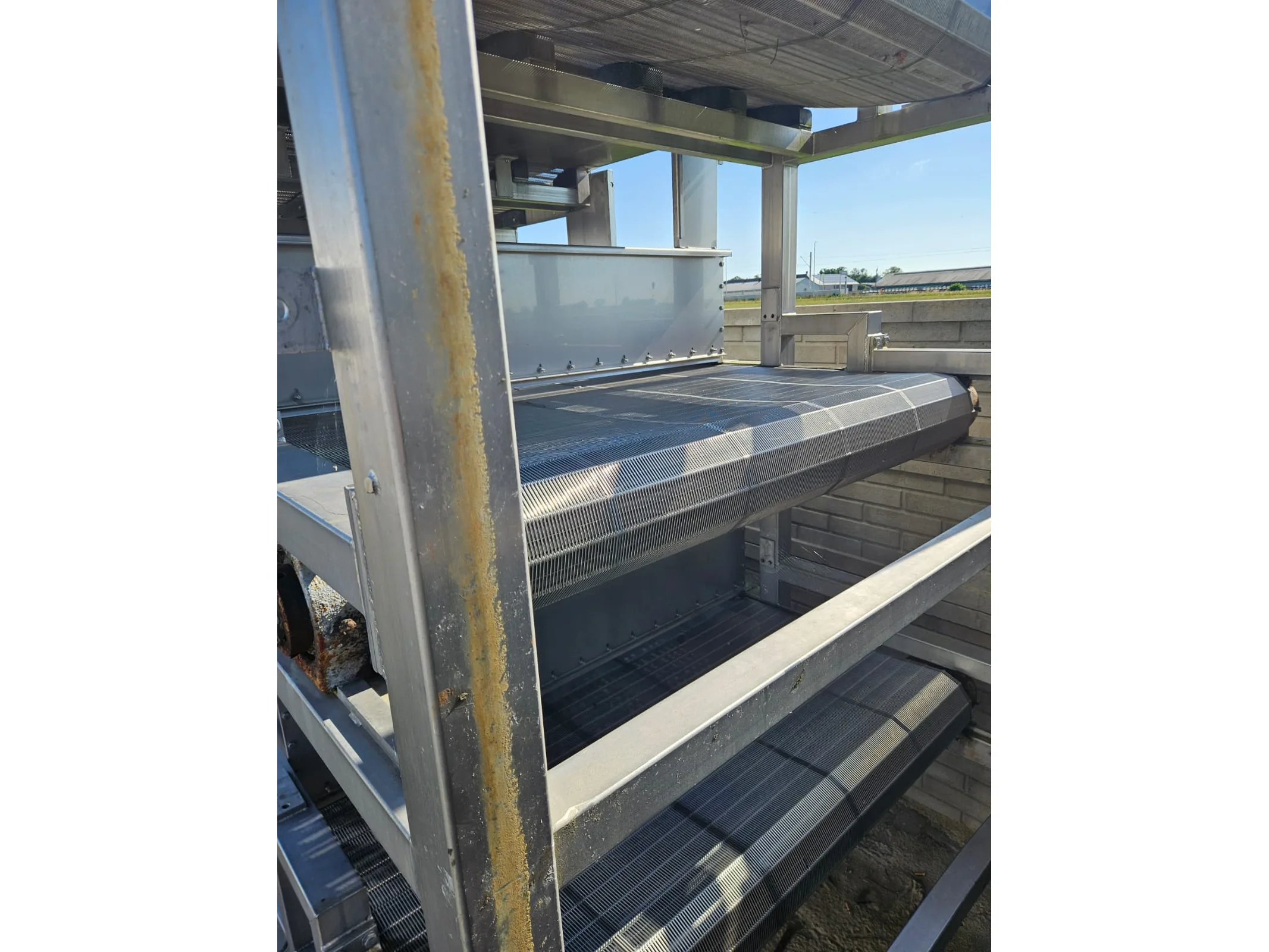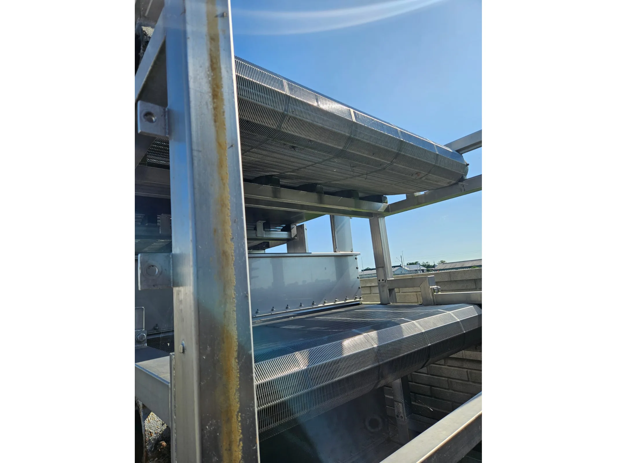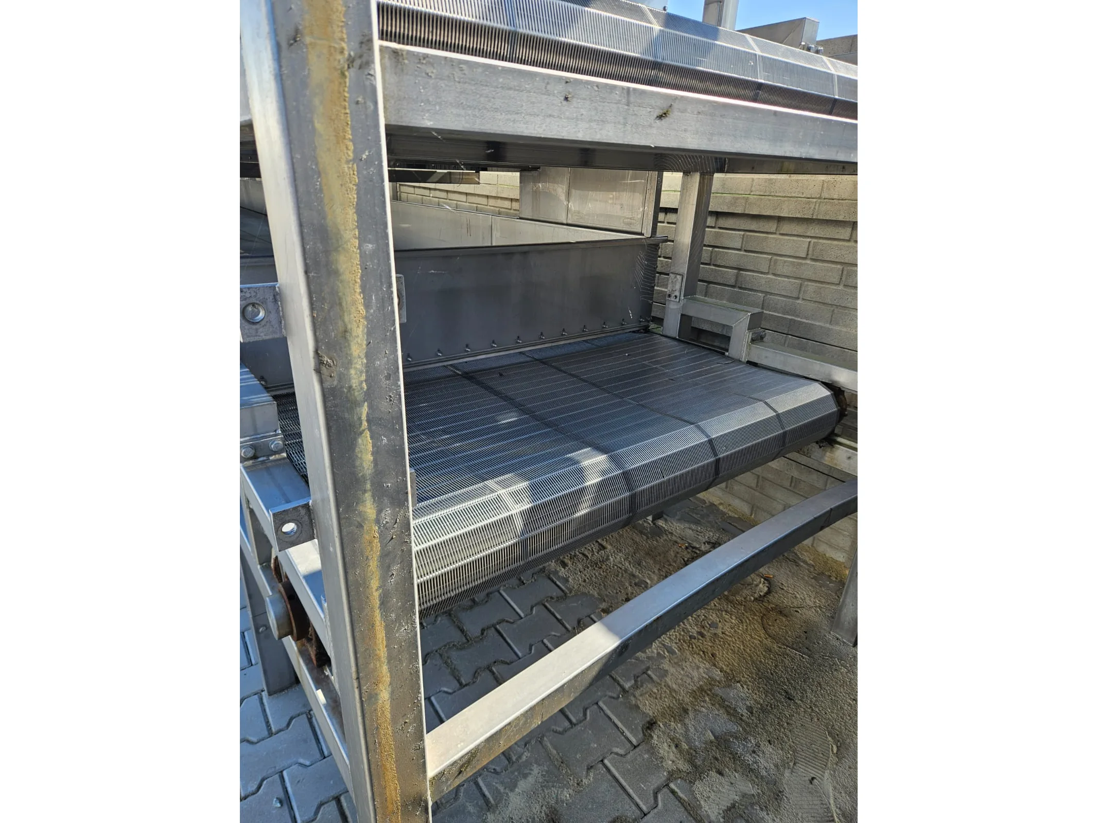 3 level conveyor, s/s mesh belt, belt width: 1500 mm, total dimensions: 16300 mm x 2400 mm x 3100 mm.