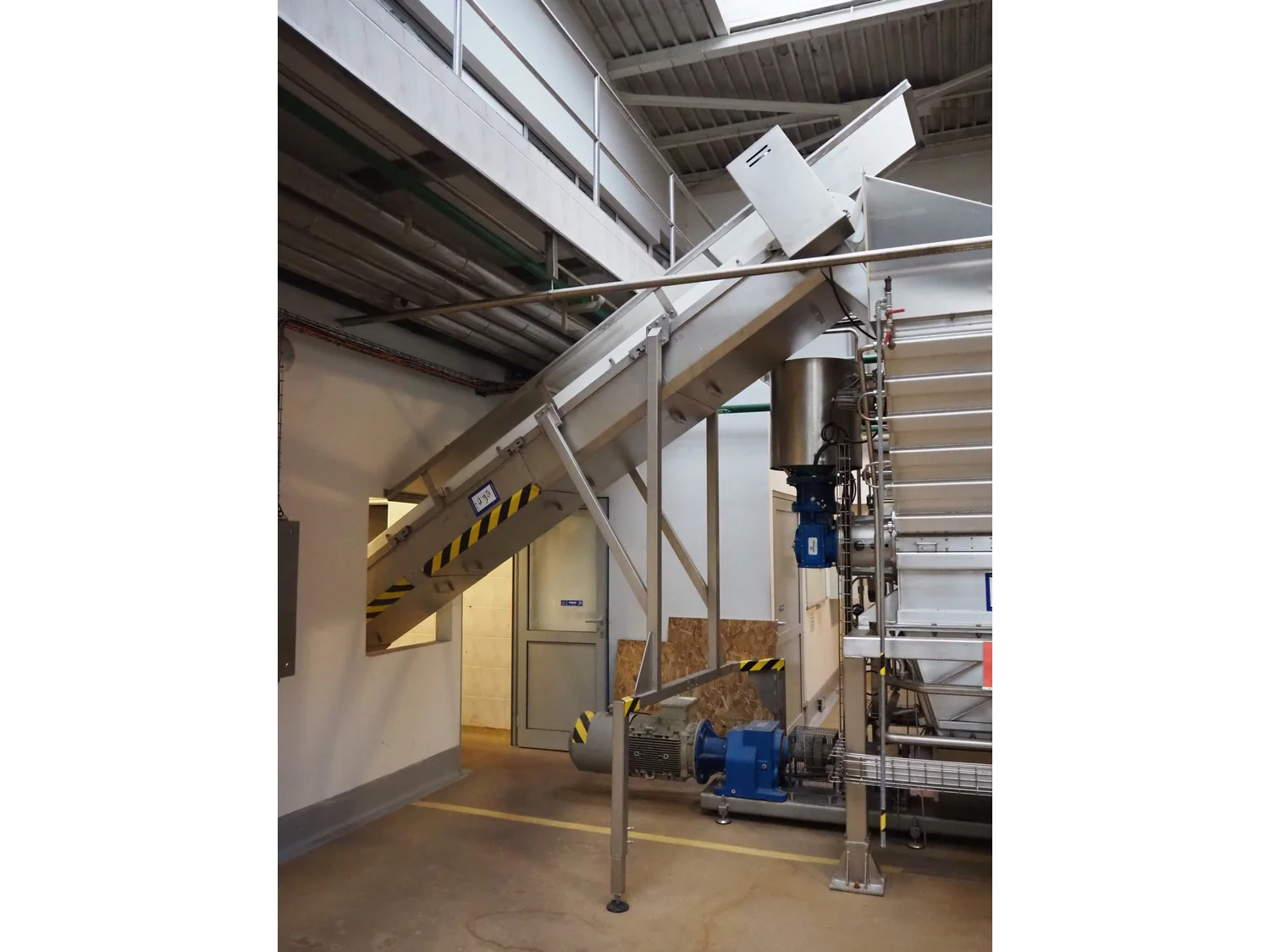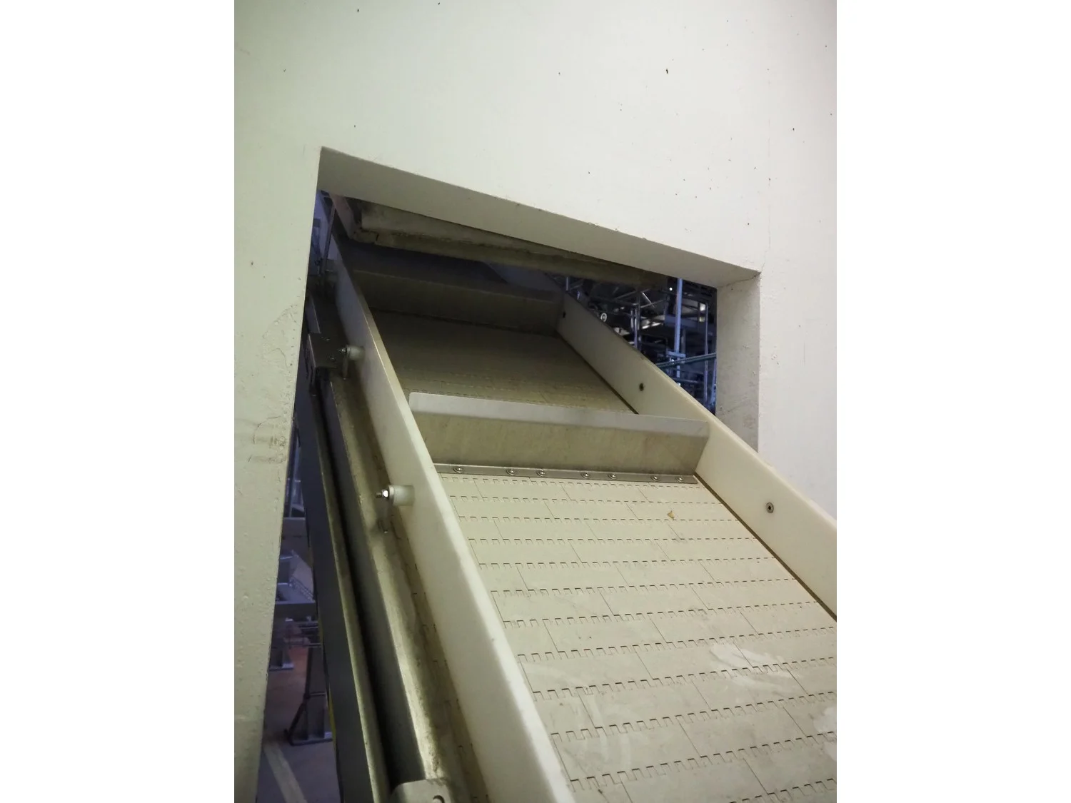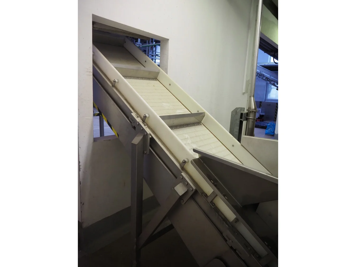 CFT S.p.A. elevating belt, plastic belt with dividers, belt width: 600 mm, divider height: 120 mm, distance between dividers: 700 mm, elevating height: 3100 mm, total dimensions: 5000 mm x 1900 mm x 3900 mm.