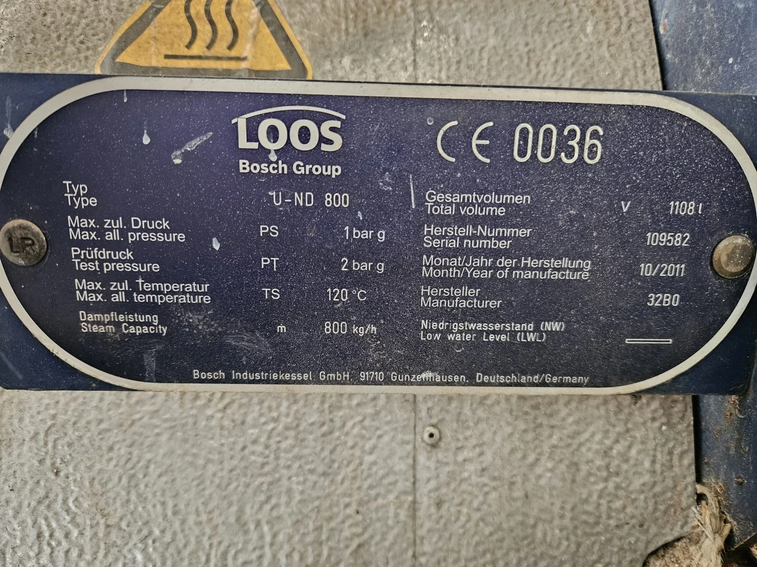 Loos Bosch Group steam boiler, type: U-ND 800, serial number: 109582, year of construction: 10/2011, total volume: 1108 liter, steam capacity: 800 kg per hour with Weishaupt GmbH burner, burner type: WM - L10/3-A, year of construction: 2011, minimum: 250 kW, maximum: 800 kW, dimensions steam boiler: 2500 mm x 1600 mm x 1900 mm, Achenbach GmbH storage tank, volume: 800 liter, dimensions: 1600 mm x 850 mm x 2600 mm and switch cabinet, dimensions: 1000 mm x 180 mm x 750 mm.