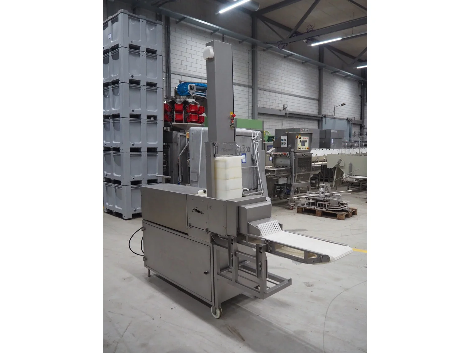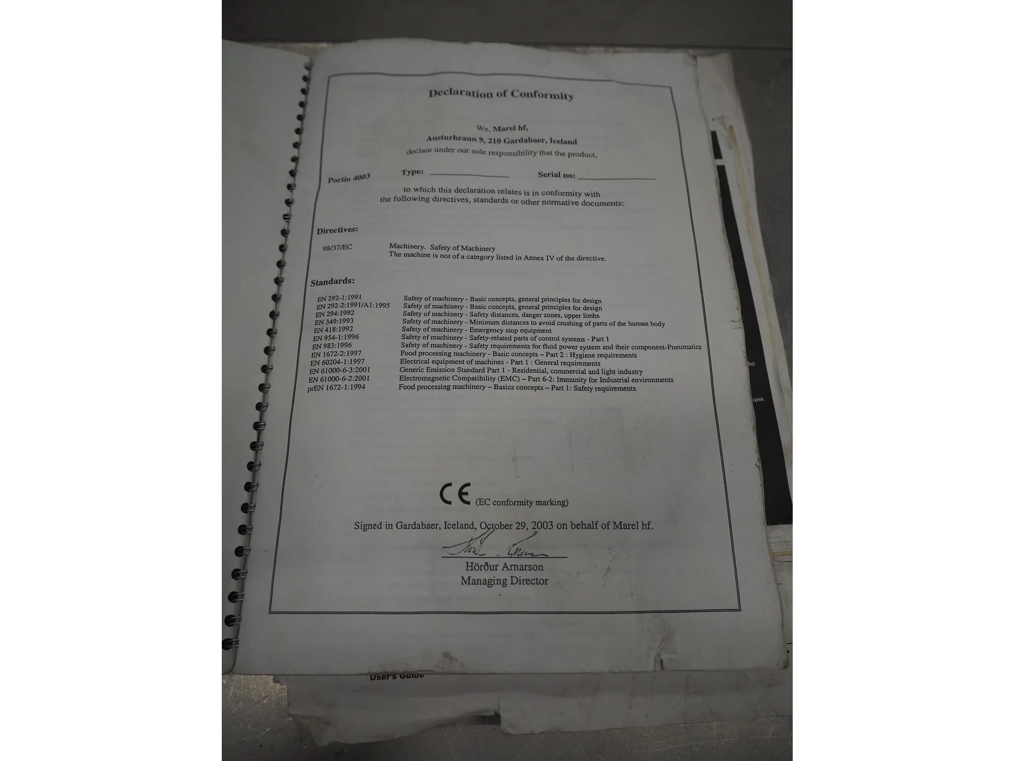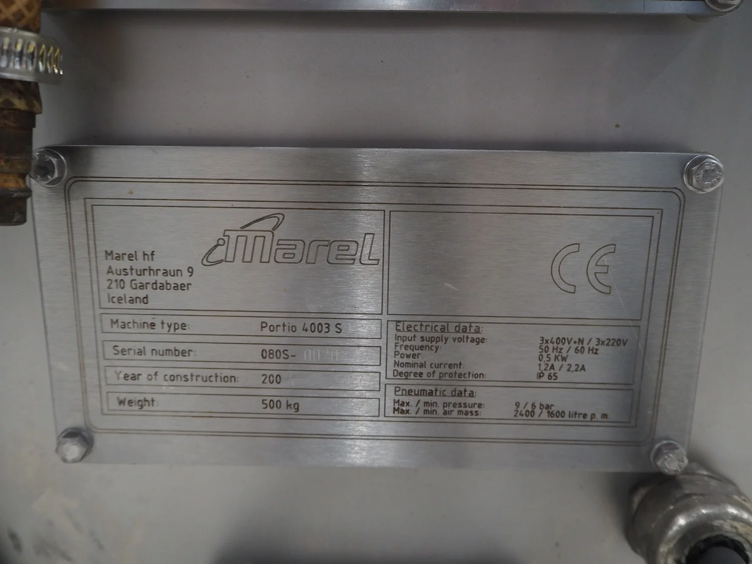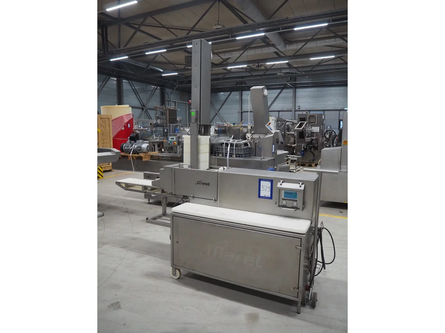 Marel mobile portioning machine, type: Portio 4003 S, serial number: 080S-0020, year of construction: 2004, 400/220 V, 3 Ph, 50/60 Hz, 1.2/2.2 A, 0.5 kW, weight: 500 kg, pressure: 6 / 9 bar, dye: (2x) 90 mm x 90 mm, plastic mesh outfeed belt, belt width: 250 mm, total dimensions: 2600 mm x 740 mm x 2550 mm. Including pallet with parts.