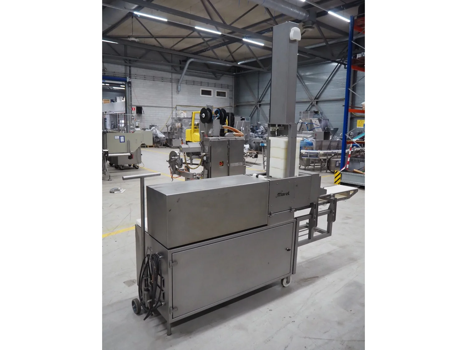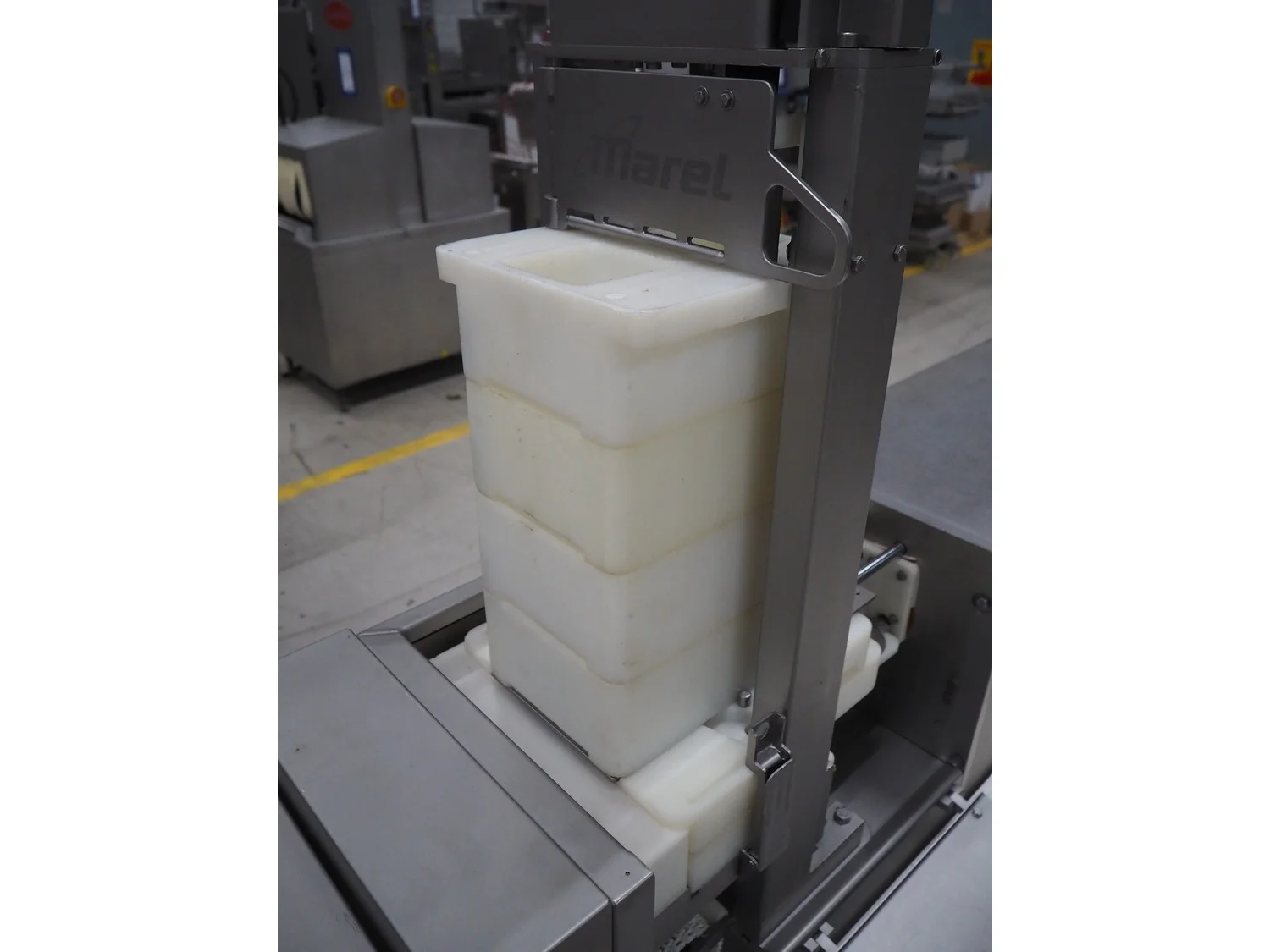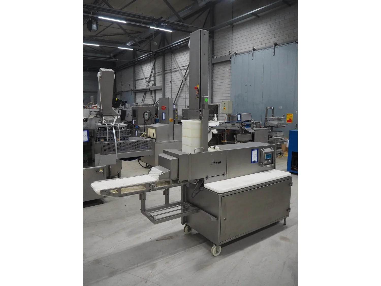 Marel mobile portioning machine, type: Portio 4003 S, serial number: 080S-0020, year of construction: 2004, 400/220 V, 3 Ph, 50/60 Hz, 1.2/2.2 A, 0.5 kW, weight: 500 kg, pressure: 6 / 9 bar, dye: (2x) 90 mm x 90 mm, plastic mesh outfeed belt, belt width: 250 mm, total dimensions: 2600 mm x 740 mm x 2550 mm. Including pallet with parts.