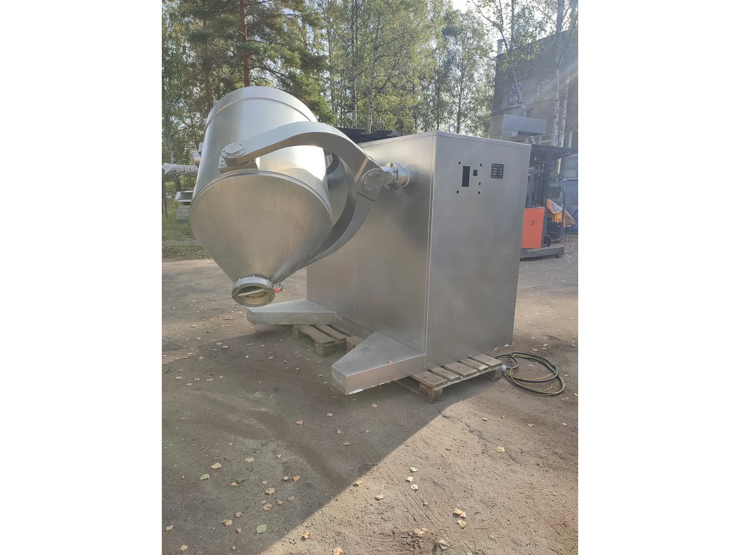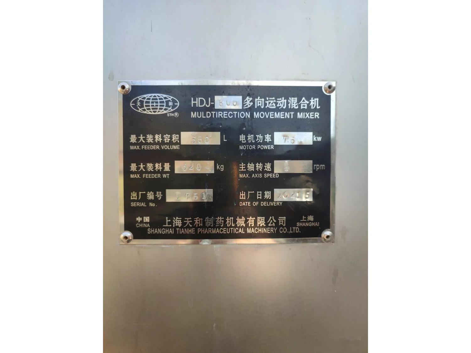 Shanghai Tianhe Pharmaceutical Machinery Co., Ltd muldtirection movement mixer, model: HDJ 800, serial number: 7751, year of construction: 05.2021, 7.5 kW, capacity: 560 litres, max. feeder 320 kg, dimensions: 2650 mm x 2300 mm x 1800 mm.