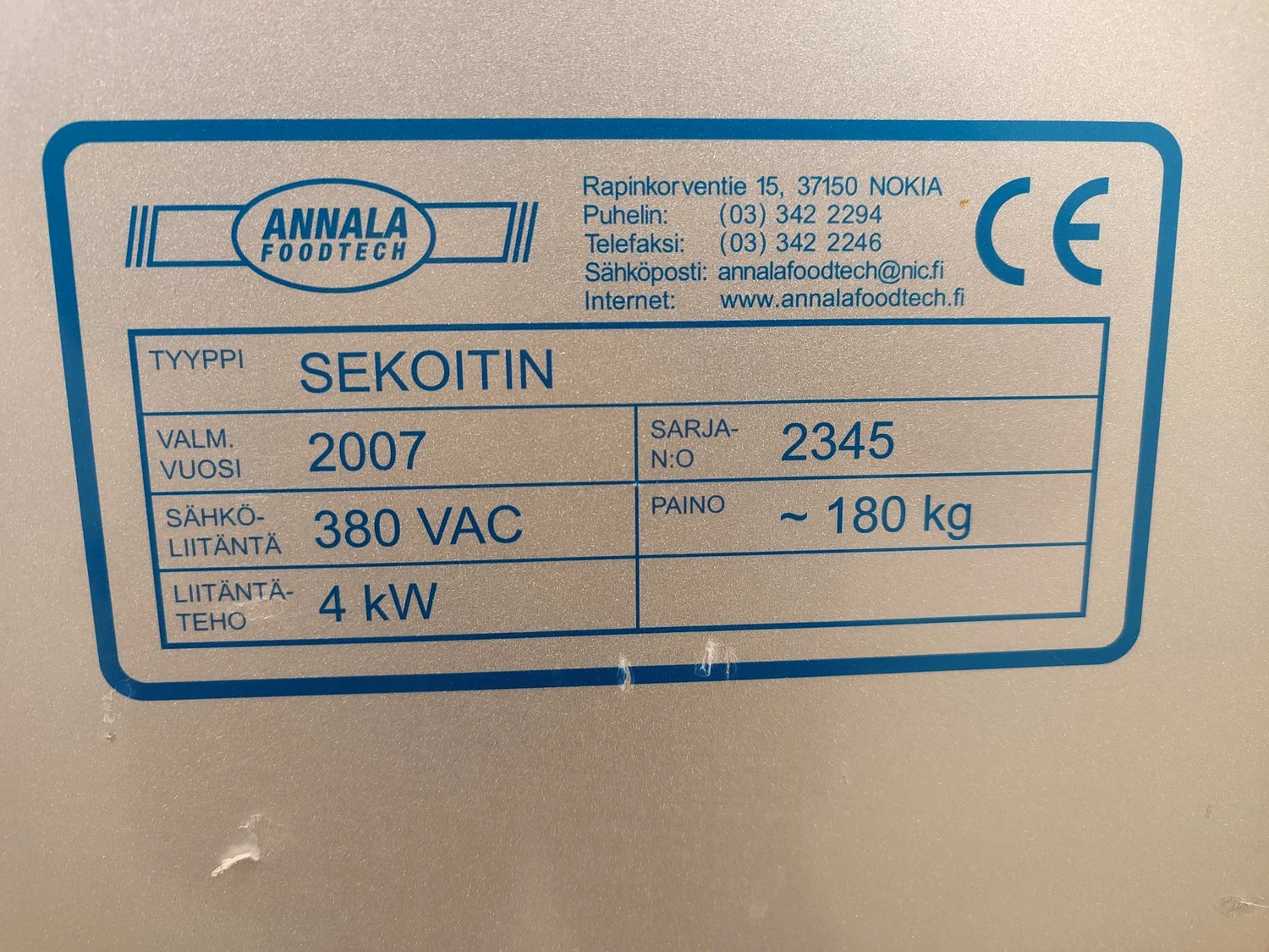 Annala Foodtech mixer, type: SEKOITIN, serial number: 2345, year of construction: 2007, 380 V, 4 kW, weight: 180 kg, dimensions: 1900 mm x 900 mm x 1620 mm.
