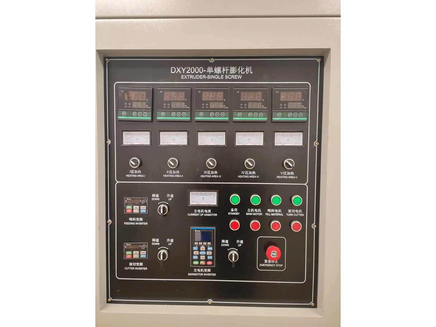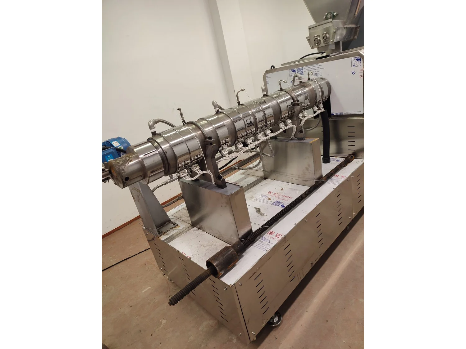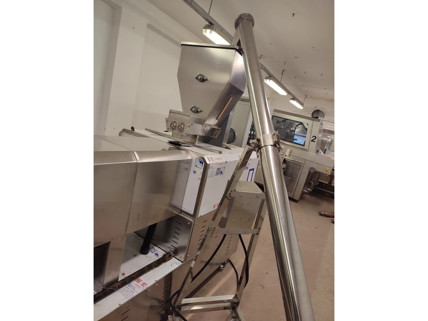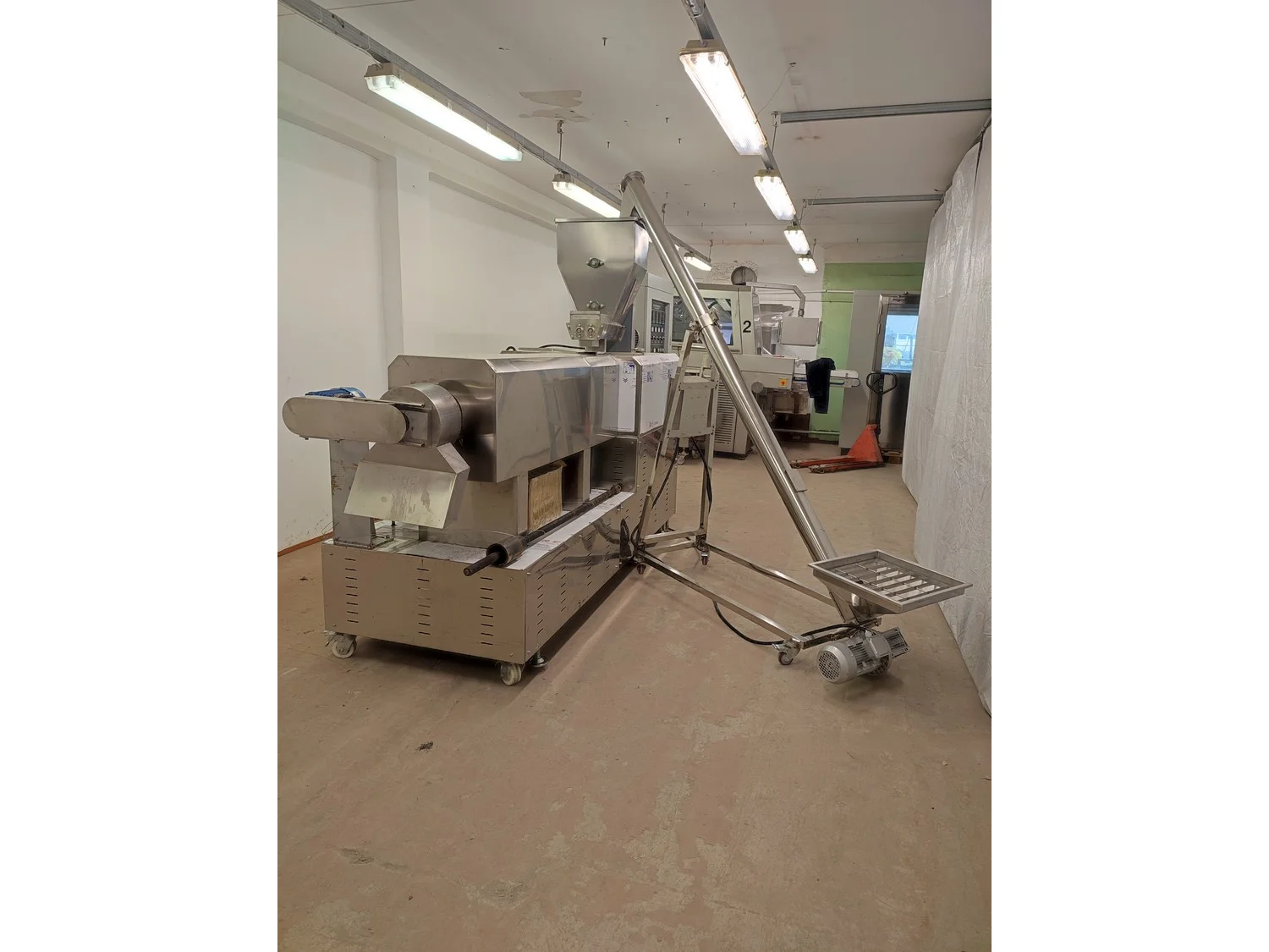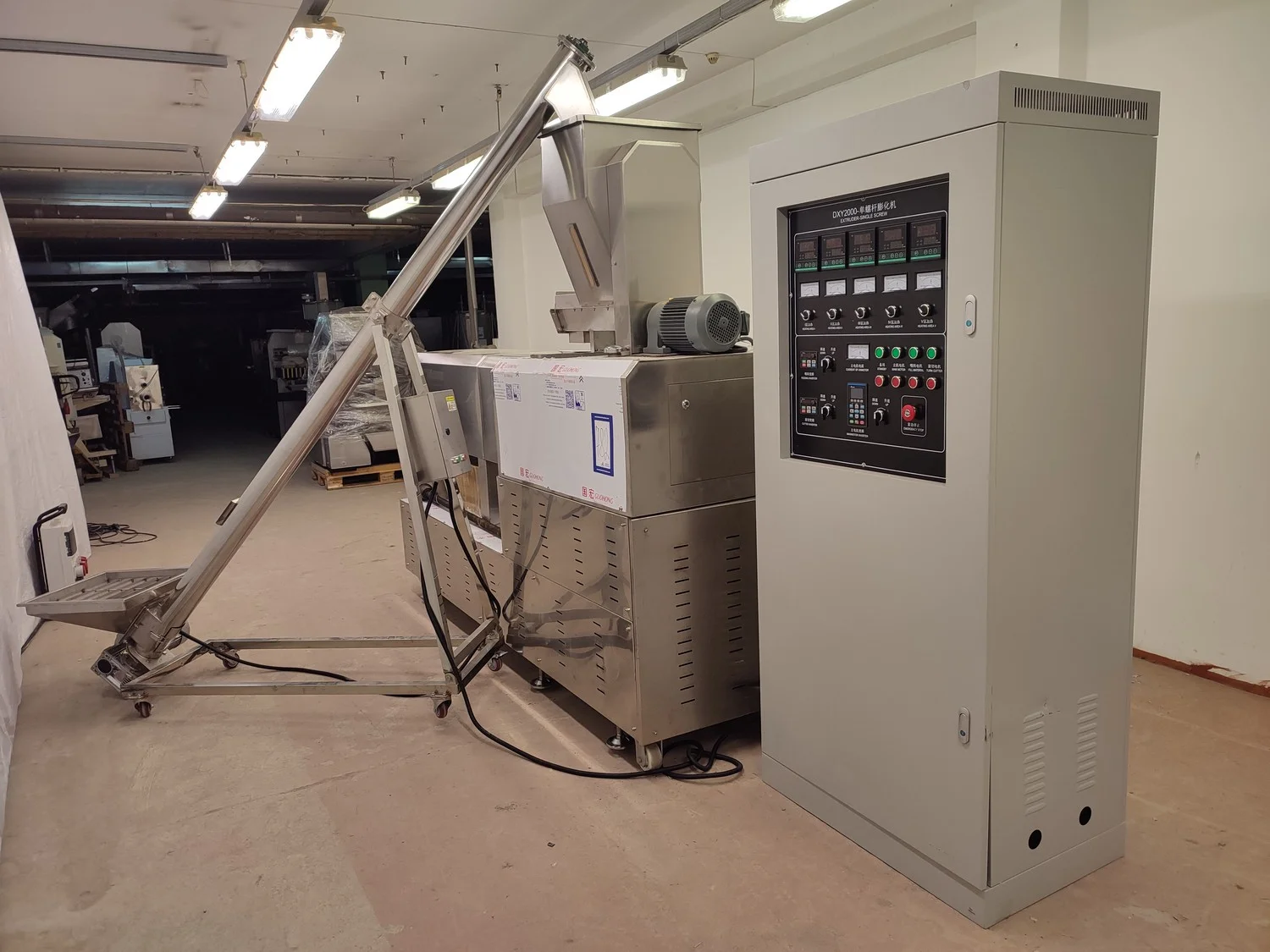 Mobile single screw extruder with elevating screw, model: DXY2000, dimensions extruder: 3000 mm x 950 mm x 2200 mm, dimensions elevating screw: 2800 mm x 600 mm x 2500 mm, dimensions switch cabinet: 855 mm x 560 mm x 1955 mm.