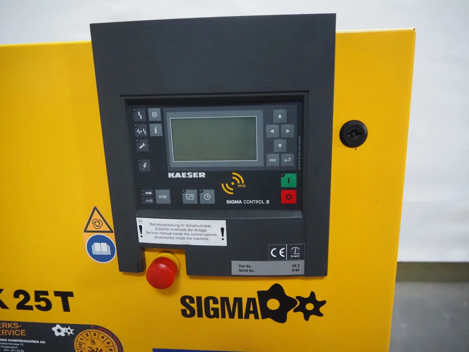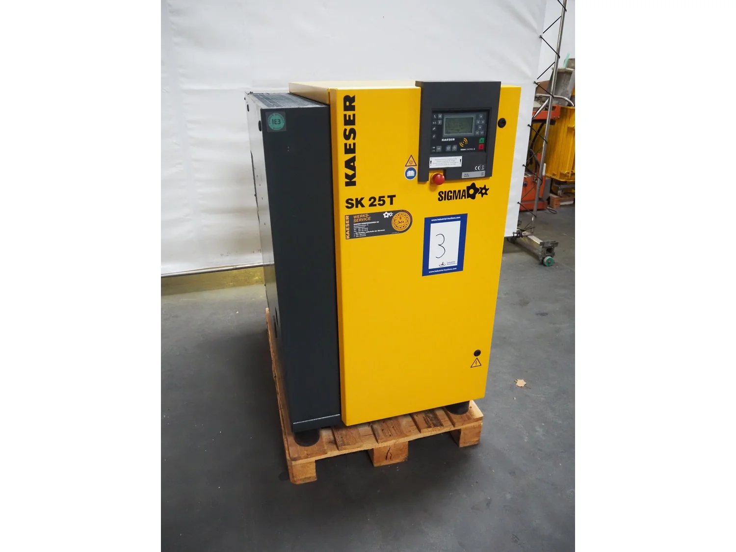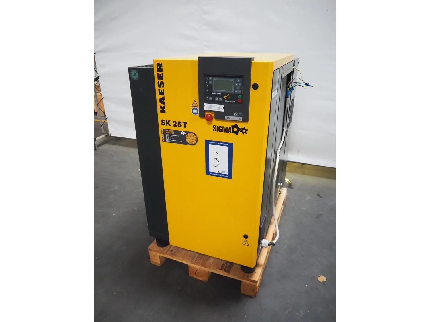 Kaeser screw compressor, type: SK 25 T, serial number: 5184, year of construction: 2014, 400 V, 3 Ph, 50 Hz, 32 A, 15 kW, 8.0 bar, type air-dryer, ABT 25, serial number: 1995, year of construction: 2011, 230 V, 1 Ph, 50/60 Hz, refrigerant: R134a/0.65 kg, dimensions: 750 mm x 1220 mm x 1240 mm.