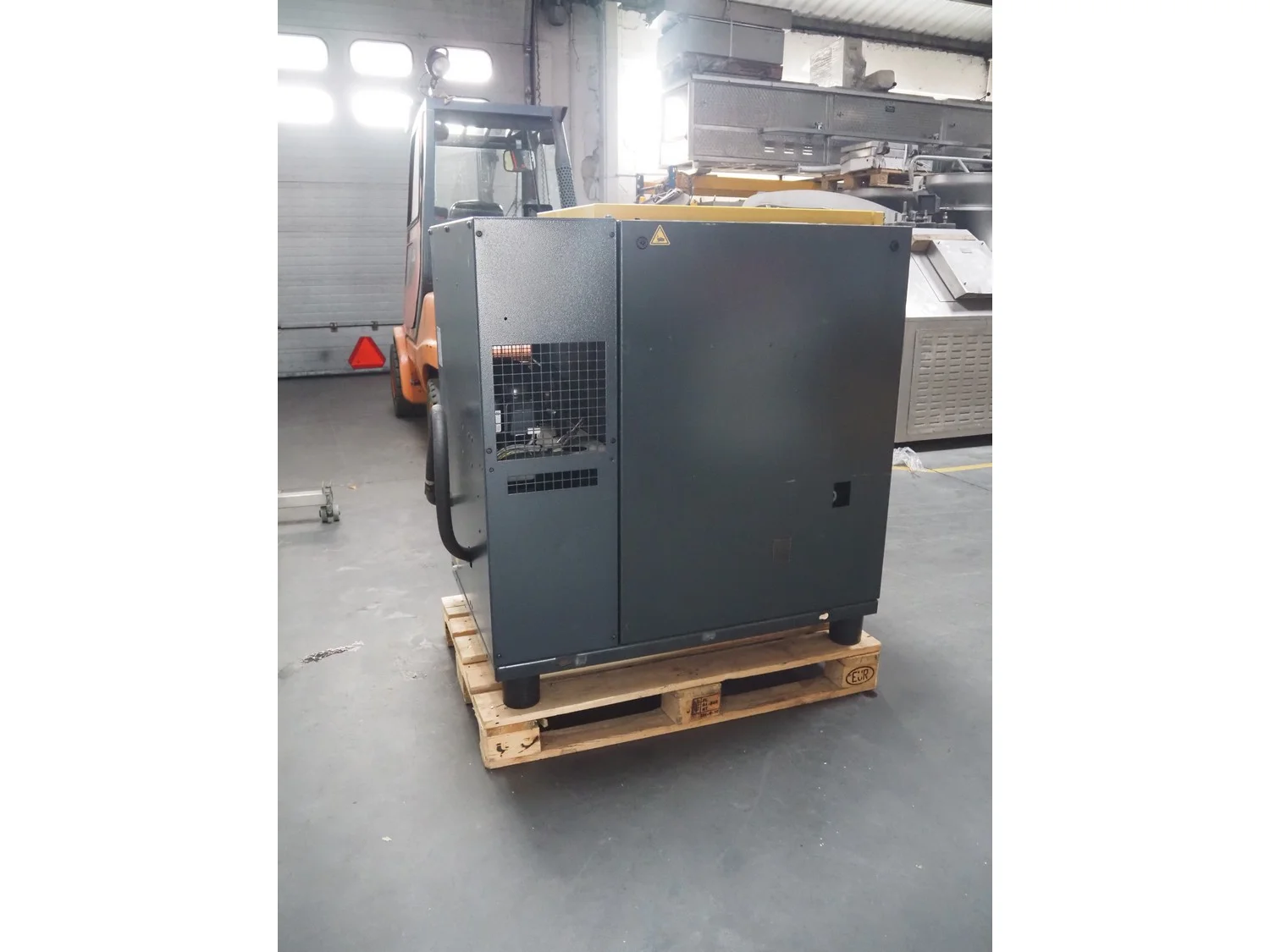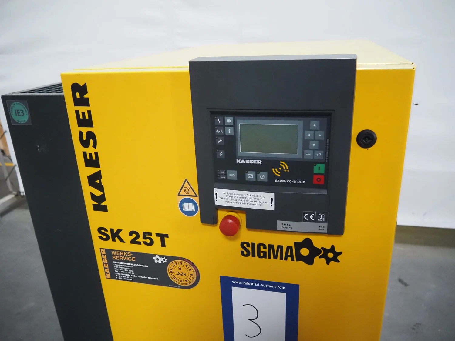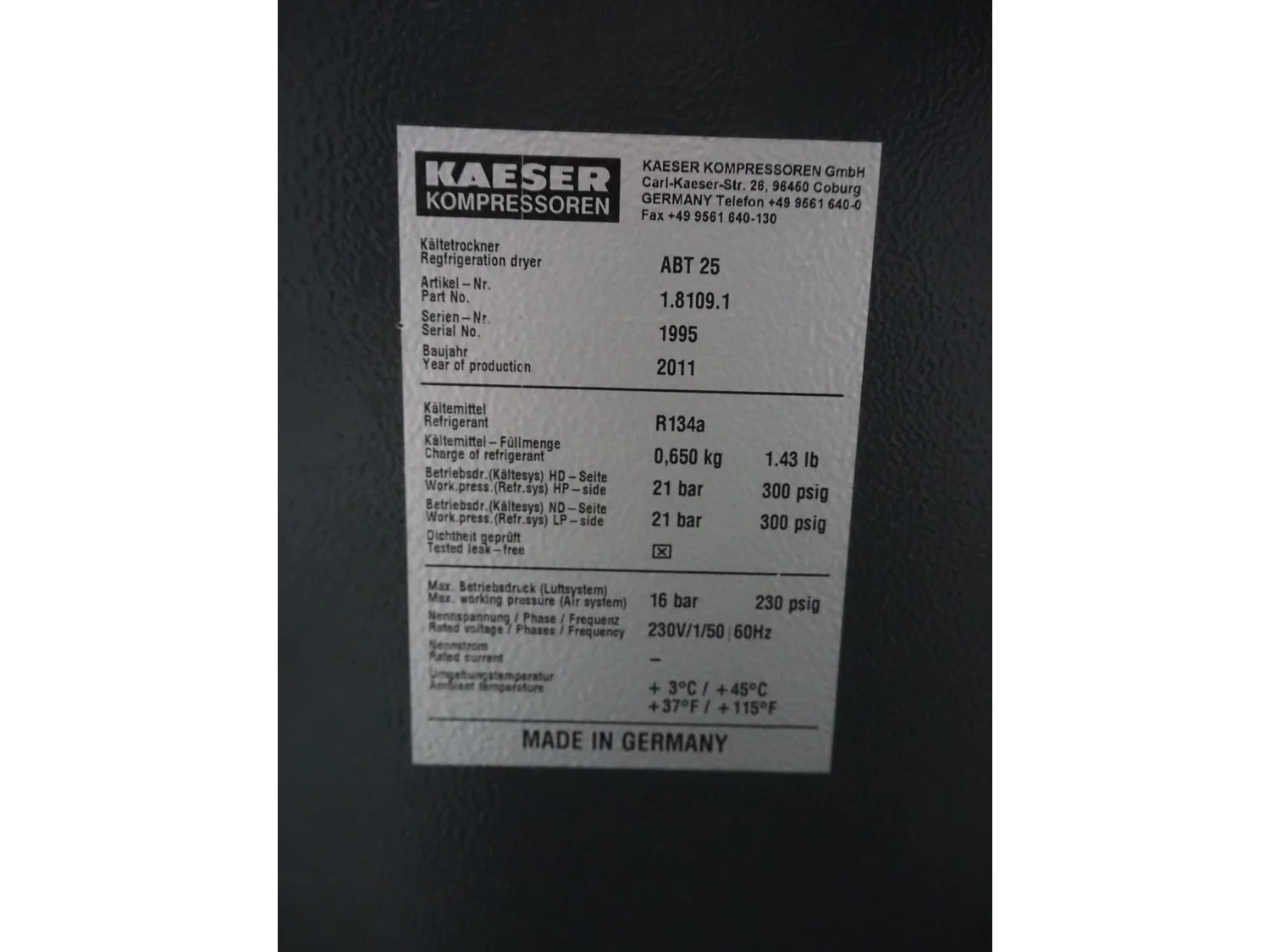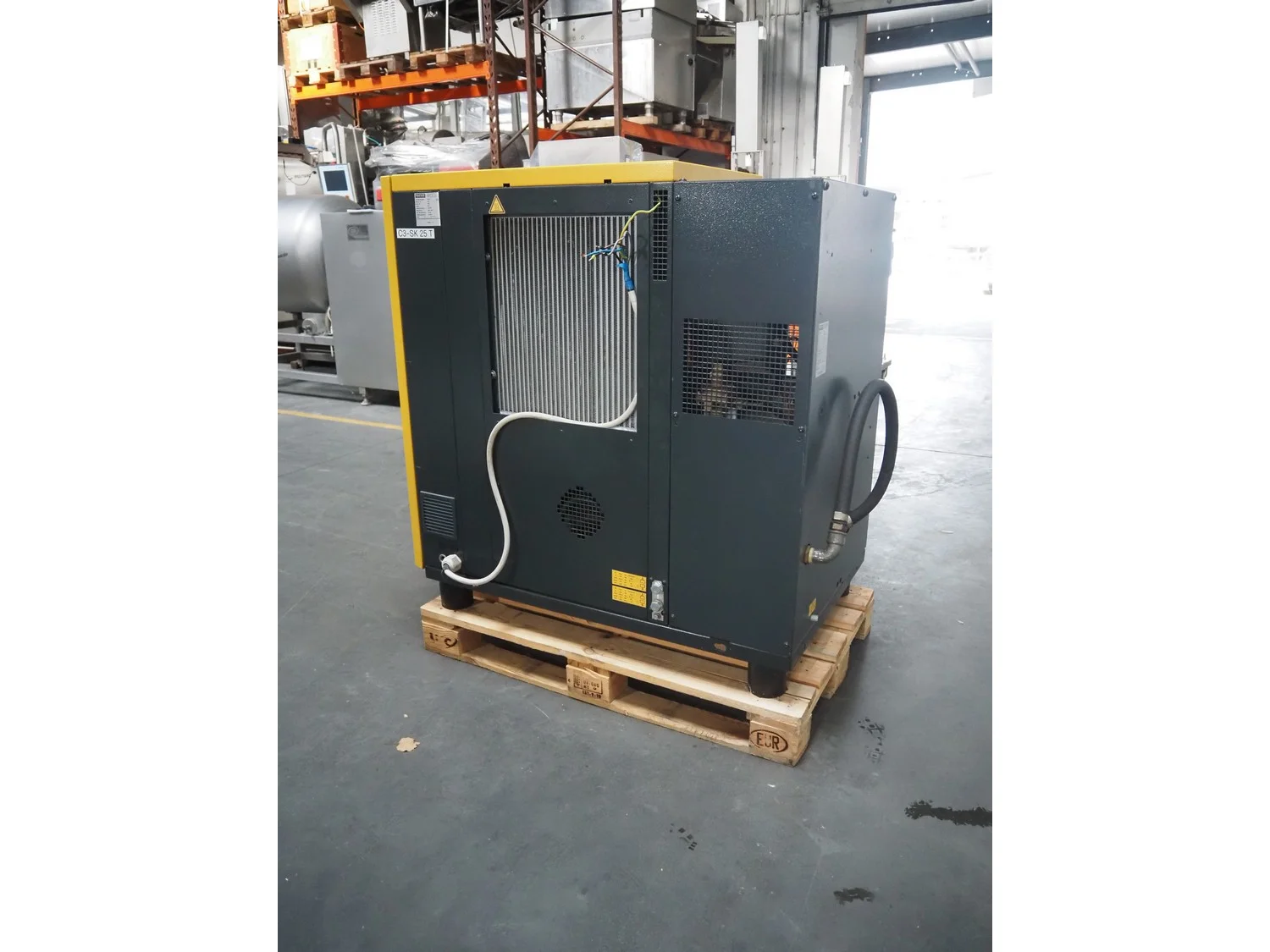Kaeser screw compressor, type: SK 25 T, serial number: 5184, year of construction: 2014, 400 V, 3 Ph, 50 Hz, 32 A, 15 kW, 8.0 bar, type air-dryer, ABT 25, serial number: 1995, year of construction: 2011, 230 V, 1 Ph, 50/60 Hz, refrigerant: R134a/0.65 kg, dimensions: 750 mm x 1220 mm x 1240 mm.