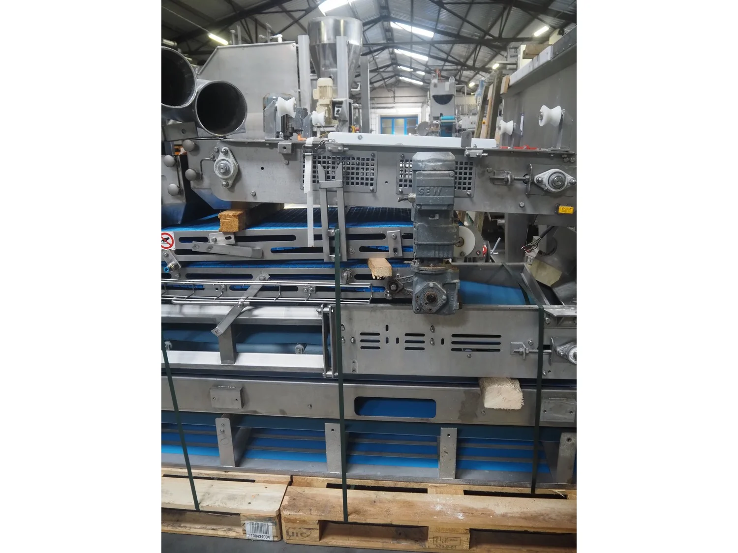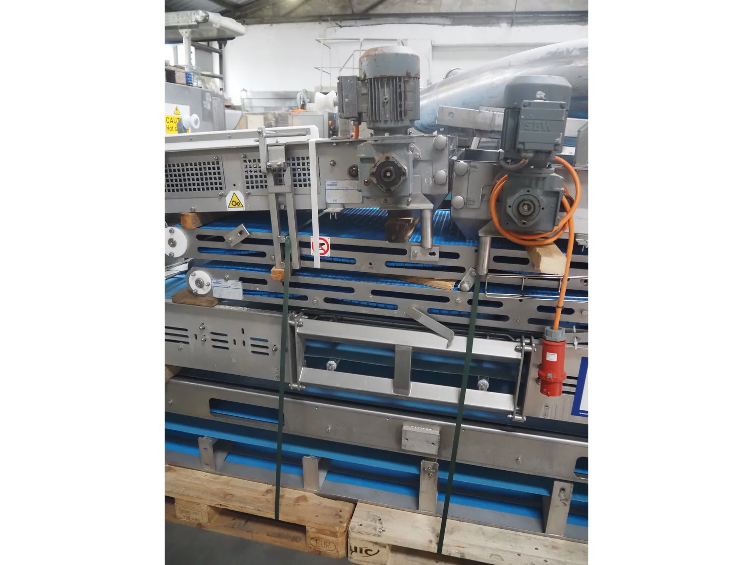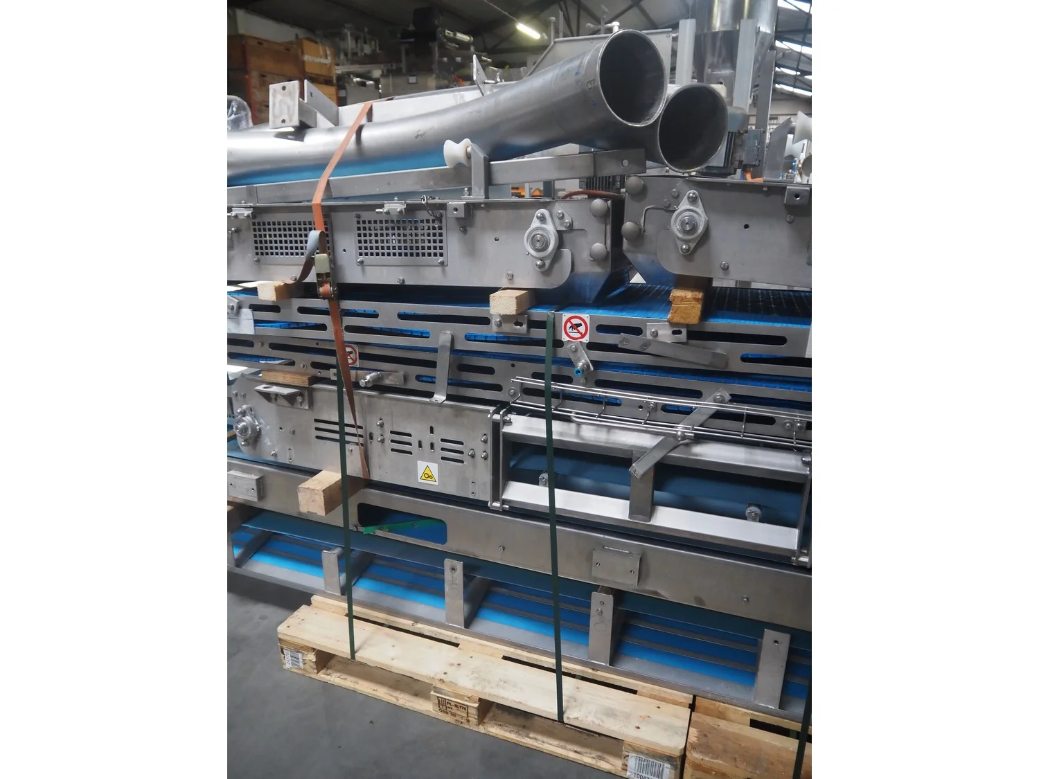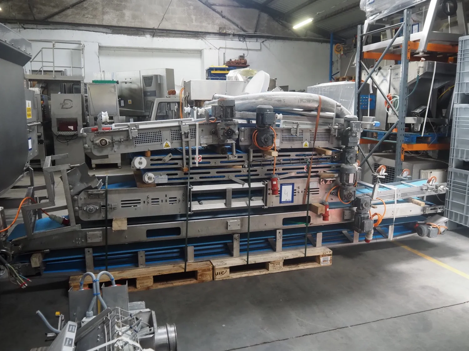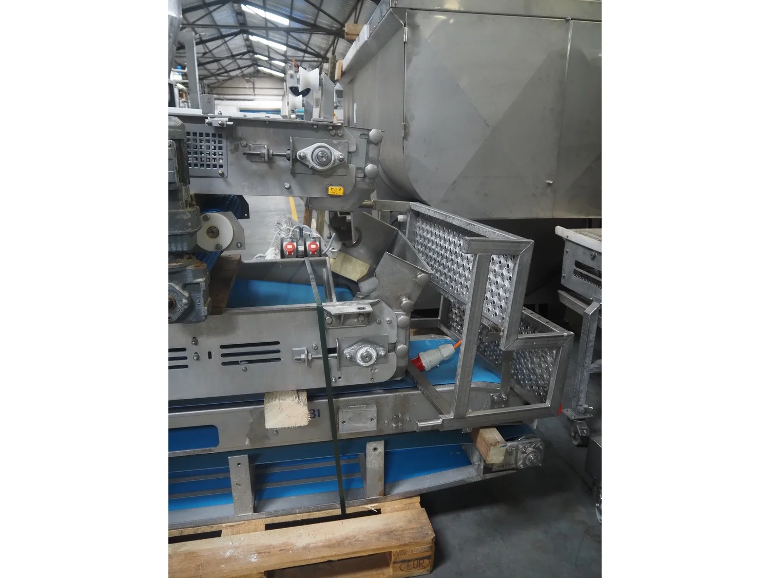 Toresani Foodmac line for ravioli, consisting of: 2 Pavan dough sheeters, plastic mesh belts, belt width: 550 mm, total dimensions: (2x) 2700 mm x 1500 mm x 2080 mm, 2 forming machines, plastic mesh belt, belt width: 550 mm, plastic outfeed belt, belt width: 150 mm, total dimensions: (2x) 2100 mm x 1600 mm x 2180 mm, platform with Gericke dosing pump, dimensions: 2700 mm x 1900 mm x 2650 mm, various transport belts, plastic belts, belt width: 500 mm, 400 mm and 200 mm, total dimensions pallet transport belts: 4600 mm x 1000 mm x 1600 mm, 2 mobile pumps, dimensions: (2x) 1000 mm x 550 mm x 1600 mm, 1 pallet with parts and 7 pallet boxes with parts, dimensions: (7x) 1200 mm x 800 mm x 800 mm.