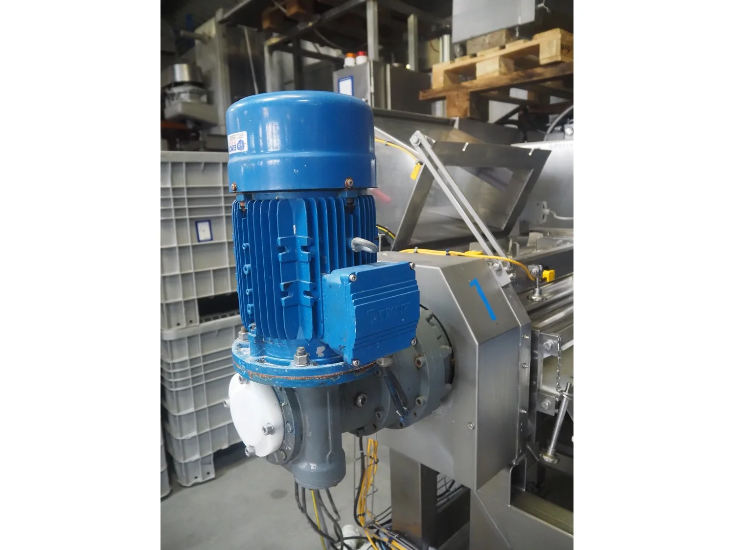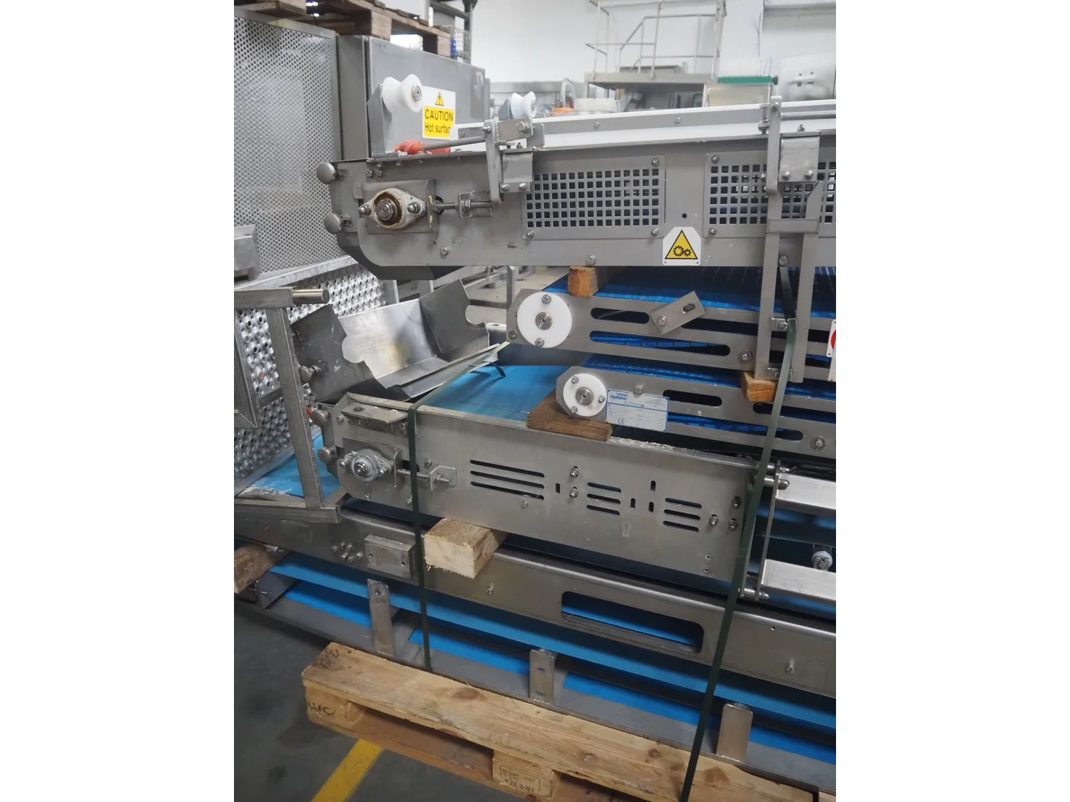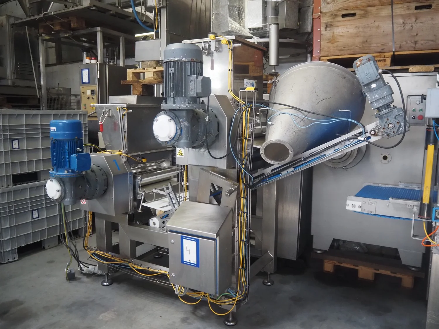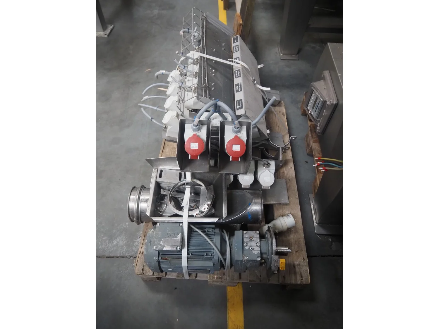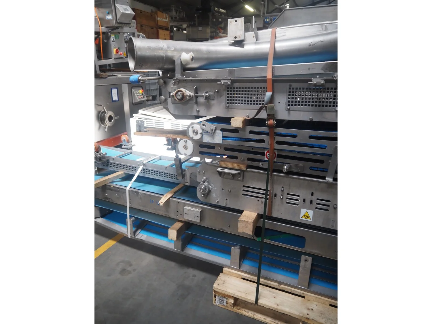 Toresani Foodmac line for ravioli, consisting of: 2 Pavan dough sheeters, plastic mesh belts, belt width: 550 mm, total dimensions: (2x) 2700 mm x 1500 mm x 2080 mm, 2 forming machines, plastic mesh belt, belt width: 550 mm, plastic outfeed belt, belt width: 150 mm, total dimensions: (2x) 2100 mm x 1600 mm x 2180 mm, platform with Gericke dosing pump, dimensions: 2700 mm x 1900 mm x 2650 mm, various transport belts, plastic belts, belt width: 500 mm, 400 mm and 200 mm, total dimensions pallet transport belts: 4600 mm x 1000 mm x 1600 mm, 2 mobile pumps, dimensions: (2x) 1000 mm x 550 mm x 1600 mm, 1 pallet with parts and 7 pallet boxes with parts, dimensions: (7x) 1200 mm x 800 mm x 800 mm.