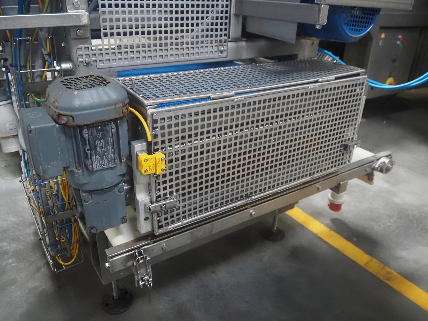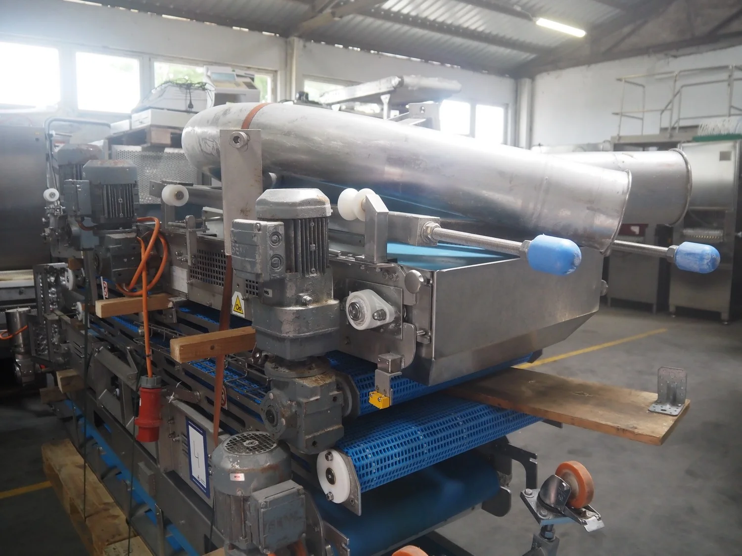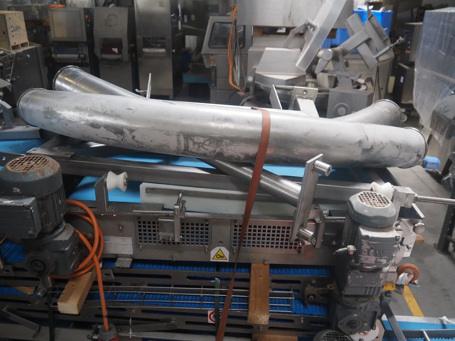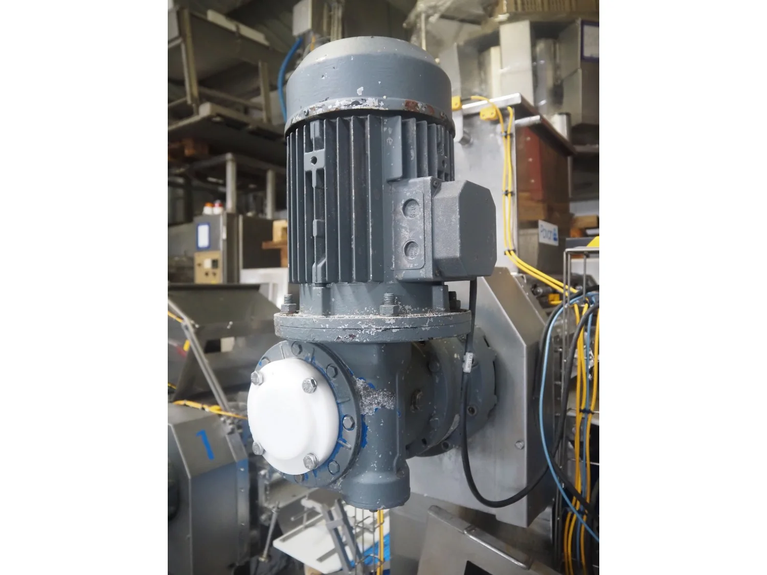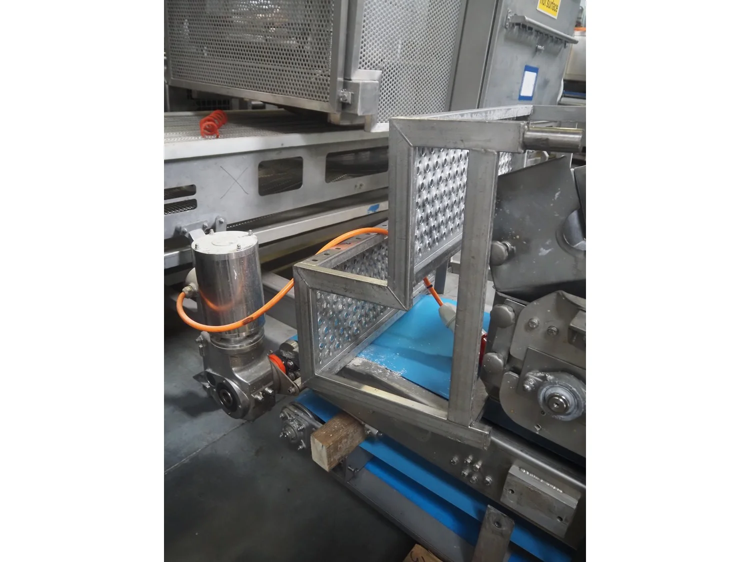 Toresani Foodmac line for ravioli, consisting of: 2 Pavan dough sheeters, plastic mesh belts, belt width: 550 mm, total dimensions: (2x) 2700 mm x 1500 mm x 2080 mm, 2 forming machines, plastic mesh belt, belt width: 550 mm, plastic outfeed belt, belt width: 150 mm, total dimensions: (2x) 2100 mm x 1600 mm x 2180 mm, platform with Gericke dosing pump, dimensions: 2700 mm x 1900 mm x 2650 mm, various transport belts, plastic belts, belt width: 500 mm, 400 mm and 200 mm, total dimensions pallet transport belts: 4600 mm x 1000 mm x 1600 mm, 2 mobile pumps, dimensions: (2x) 1000 mm x 550 mm x 1600 mm, 1 pallet with parts and 7 pallet boxes with parts, dimensions: (7x) 1200 mm x 800 mm x 800 mm.