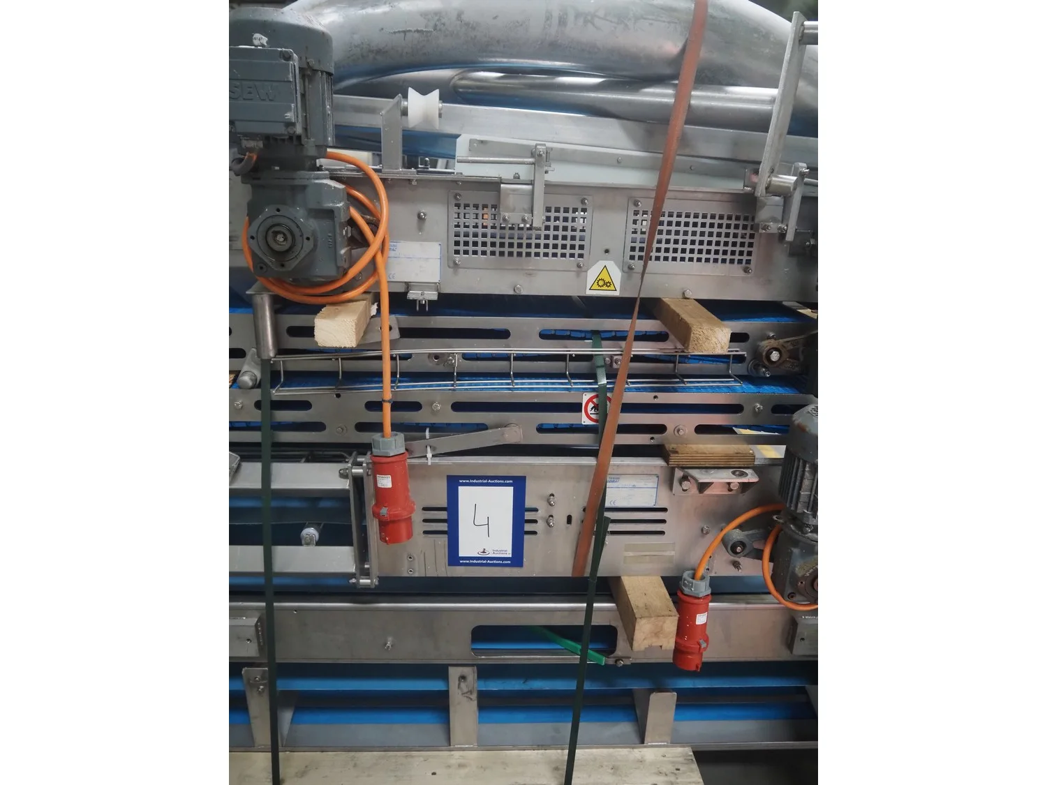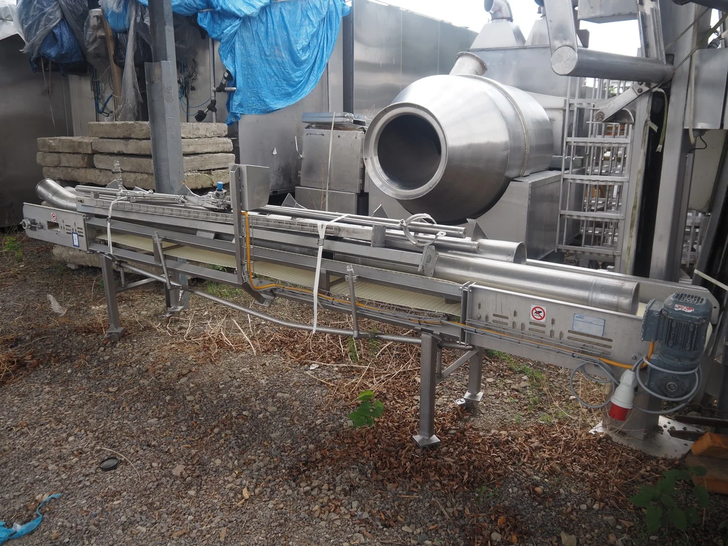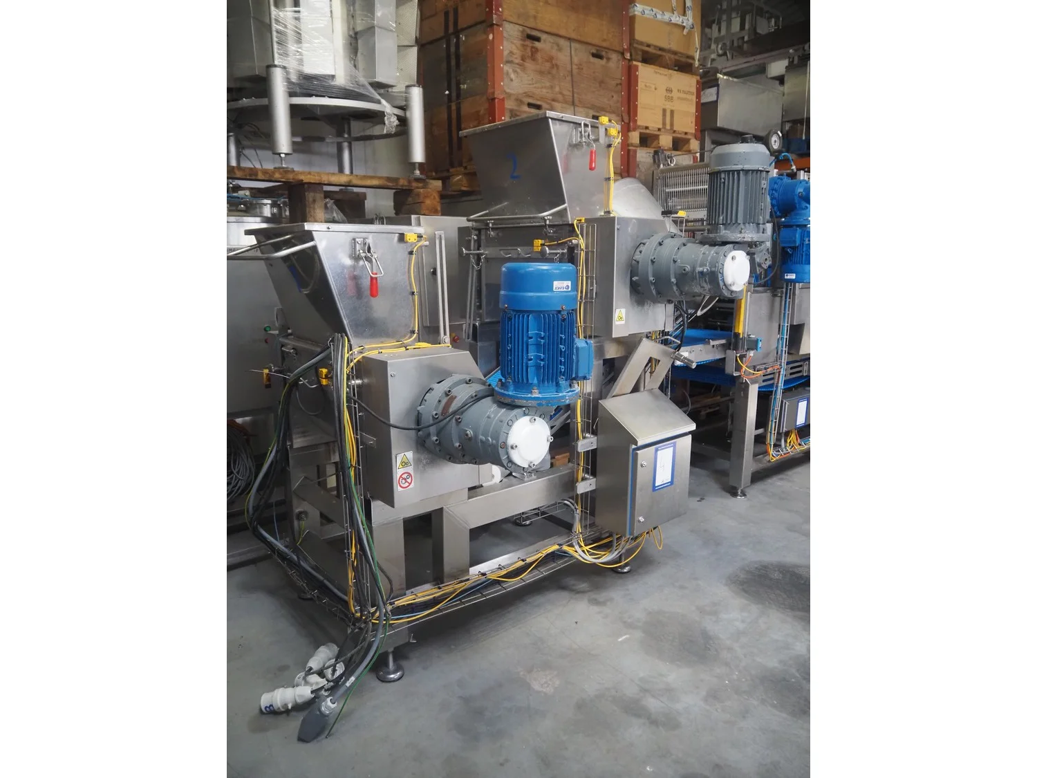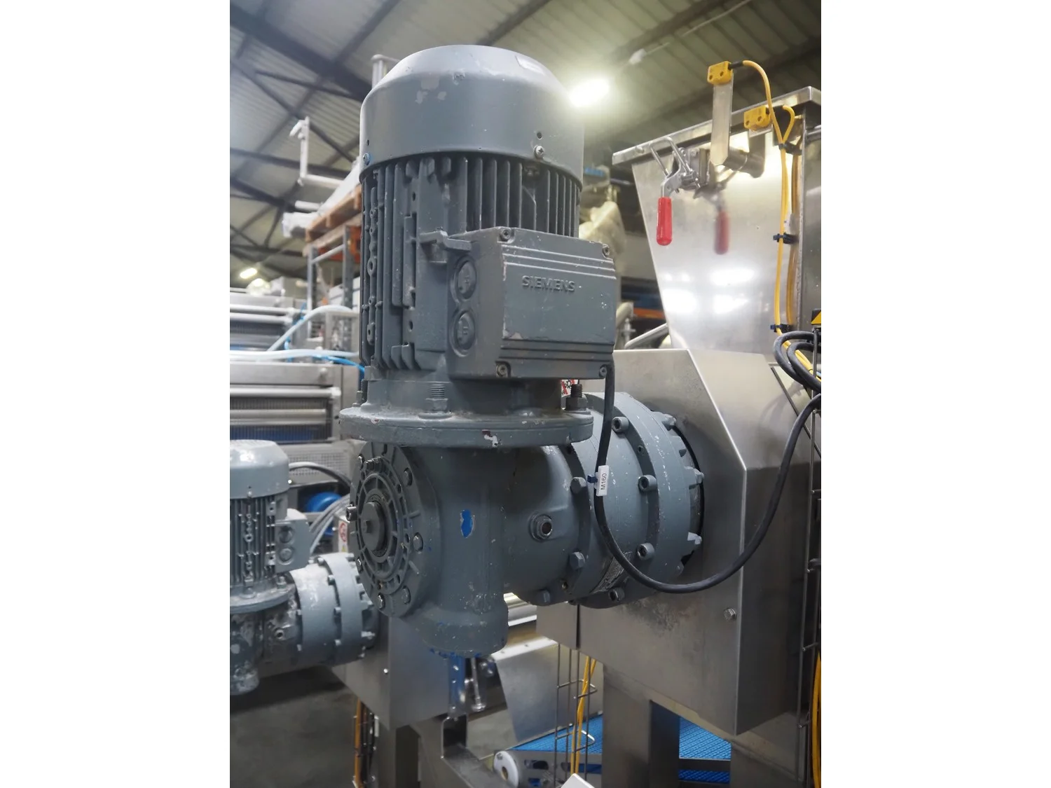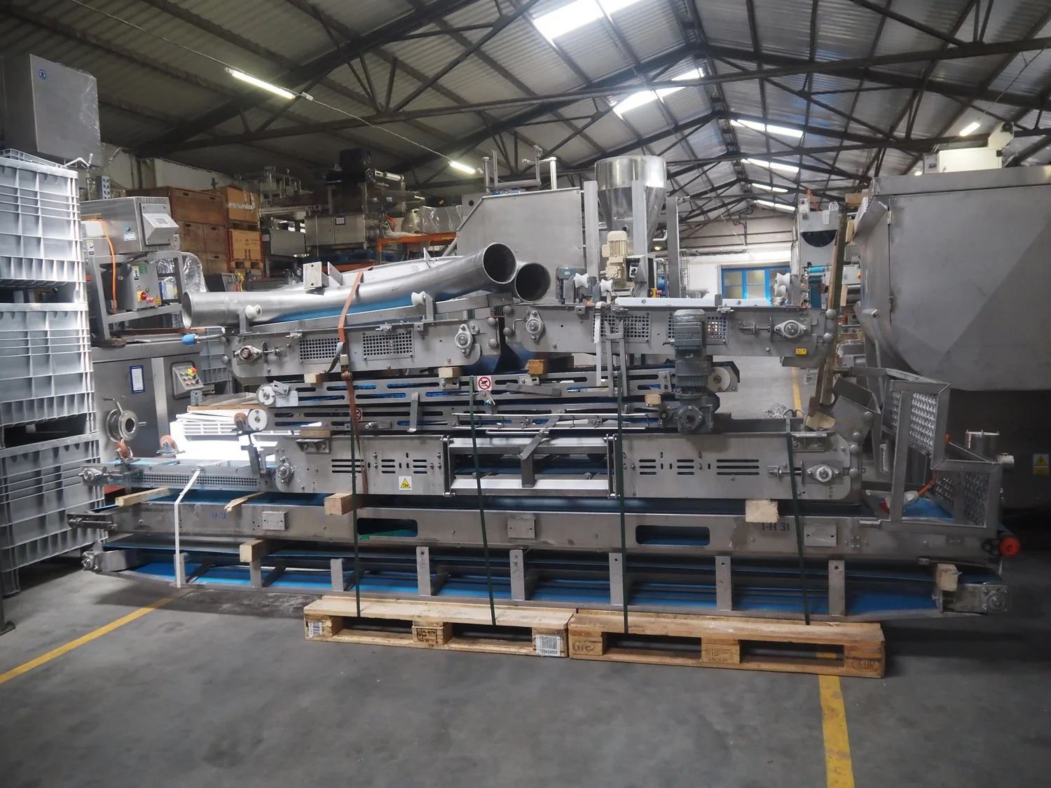 Toresani Foodmac line for ravioli, consisting of: 2 Pavan dough sheeters, plastic mesh belts, belt width: 550 mm, total dimensions: (2x) 2700 mm x 1500 mm x 2080 mm, 2 forming machines, plastic mesh belt, belt width: 550 mm, plastic outfeed belt, belt width: 150 mm, total dimensions: (2x) 2100 mm x 1600 mm x 2180 mm, platform with Gericke dosing pump, dimensions: 2700 mm x 1900 mm x 2650 mm, various transport belts, plastic belts, belt width: 500 mm, 400 mm and 200 mm, total dimensions pallet transport belts: 4600 mm x 1000 mm x 1600 mm, 2 mobile pumps, dimensions: (2x) 1000 mm x 550 mm x 1600 mm, 1 pallet with parts and 7 pallet boxes with parts, dimensions: (7x) 1200 mm x 800 mm x 800 mm.