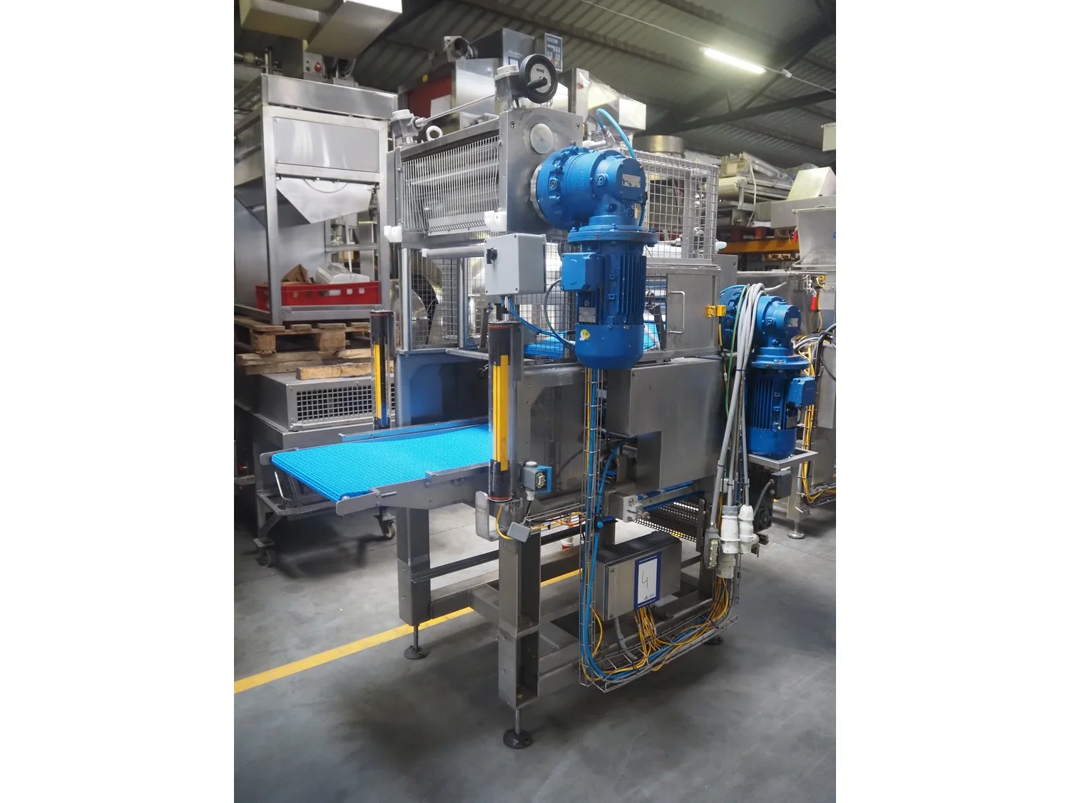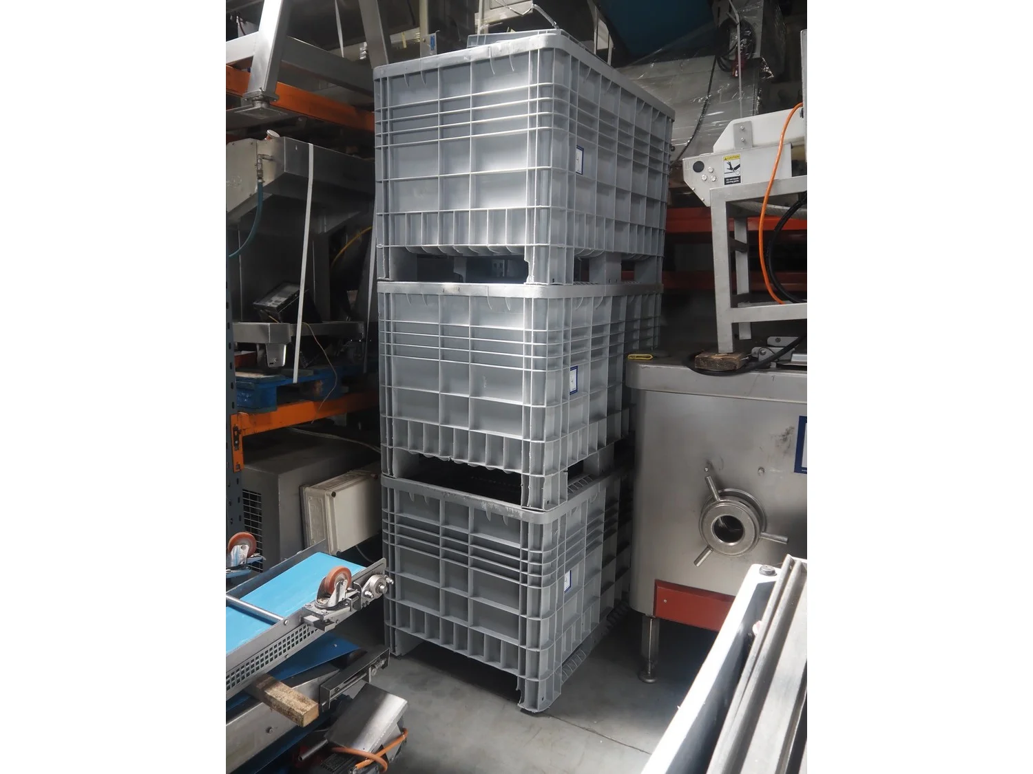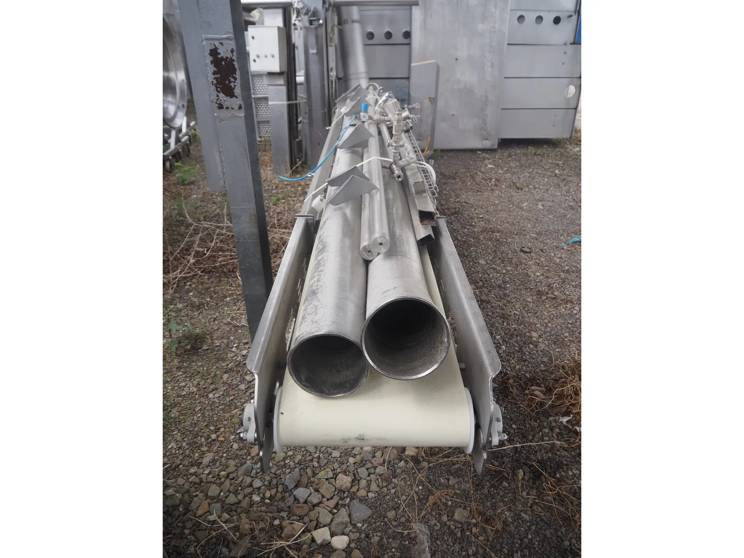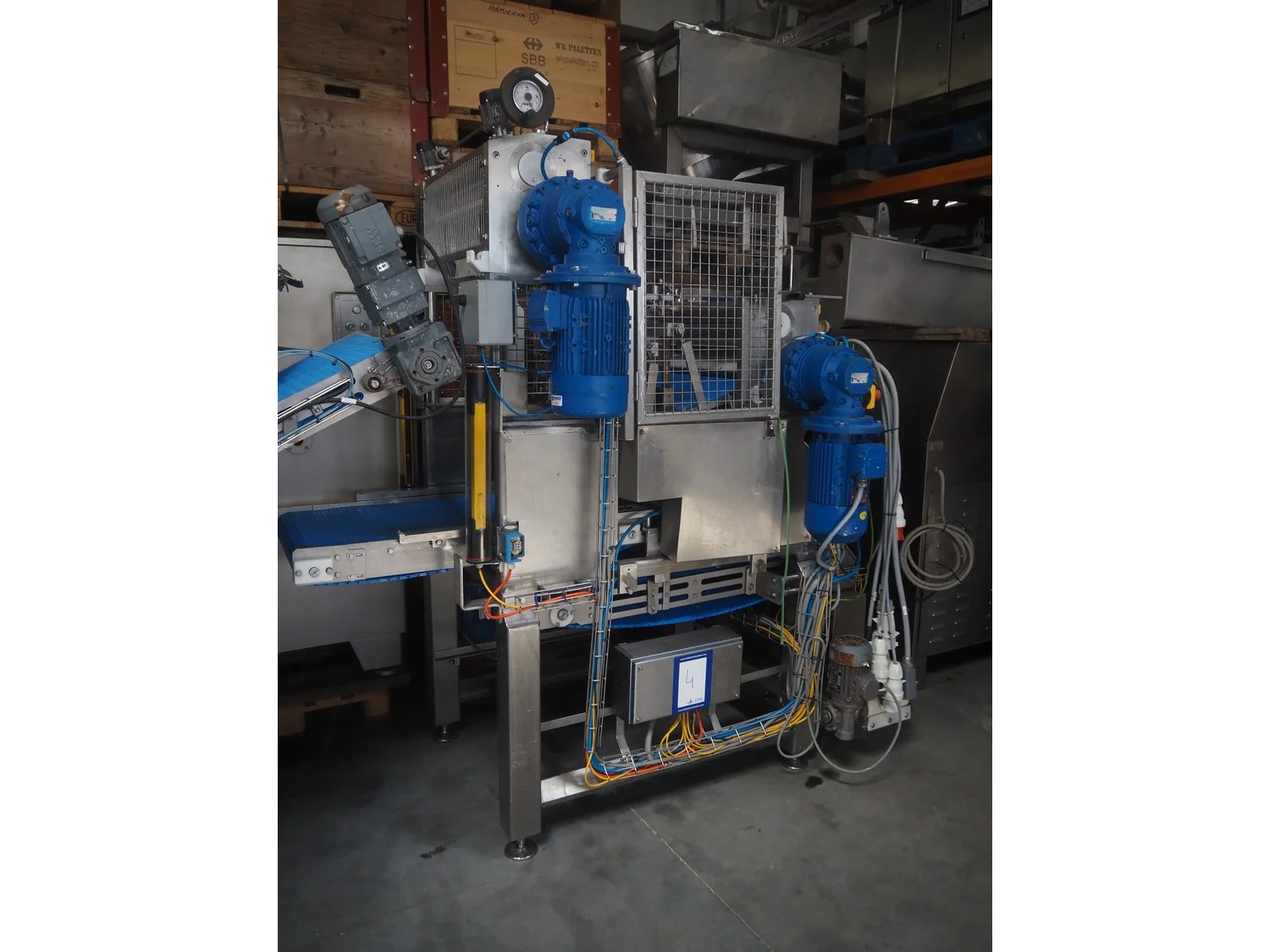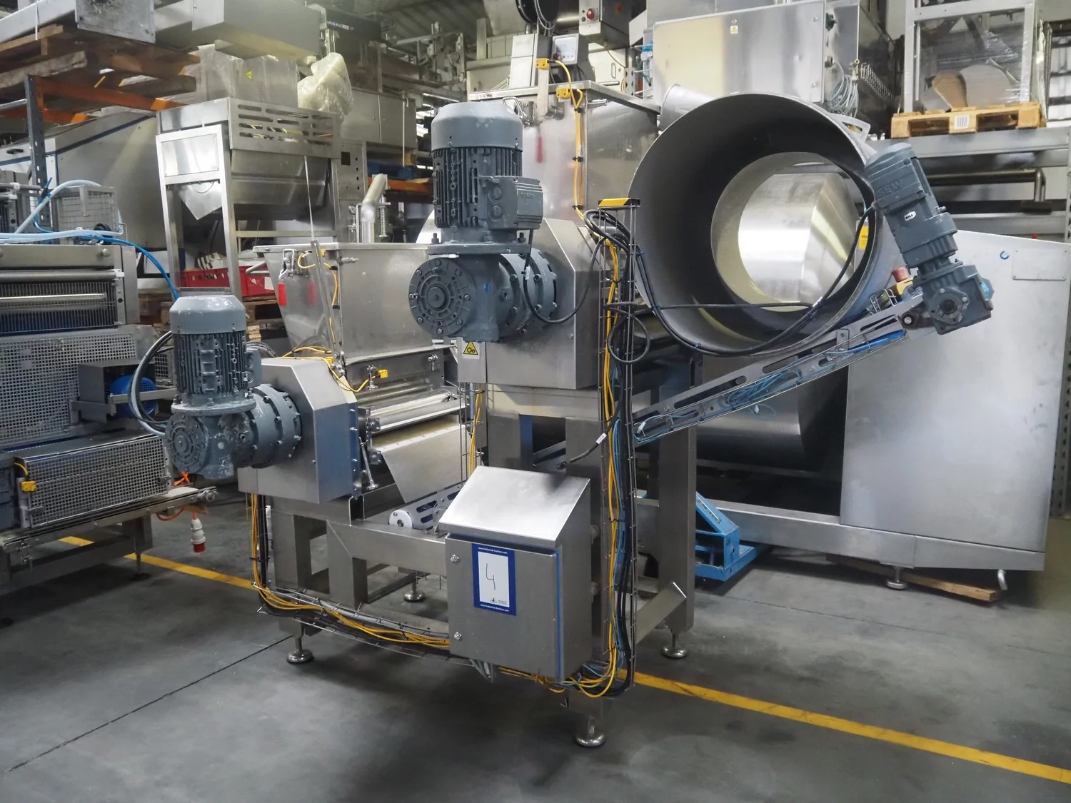 Toresani Foodmac line for ravioli, consisting of: 2 Pavan dough sheeters, plastic mesh belts, belt width: 550 mm, total dimensions: (2x) 2700 mm x 1500 mm x 2080 mm, 2 forming machines, plastic mesh belt, belt width: 550 mm, plastic outfeed belt, belt width: 150 mm, total dimensions: (2x) 2100 mm x 1600 mm x 2180 mm, platform with Gericke dosing pump, dimensions: 2700 mm x 1900 mm x 2650 mm, various transport belts, plastic belts, belt width: 500 mm, 400 mm and 200 mm, total dimensions pallet transport belts: 4600 mm x 1000 mm x 1600 mm, 2 mobile pumps, dimensions: (2x) 1000 mm x 550 mm x 1600 mm, 1 pallet with parts and 7 pallet boxes with parts, dimensions: (7x) 1200 mm x 800 mm x 800 mm.