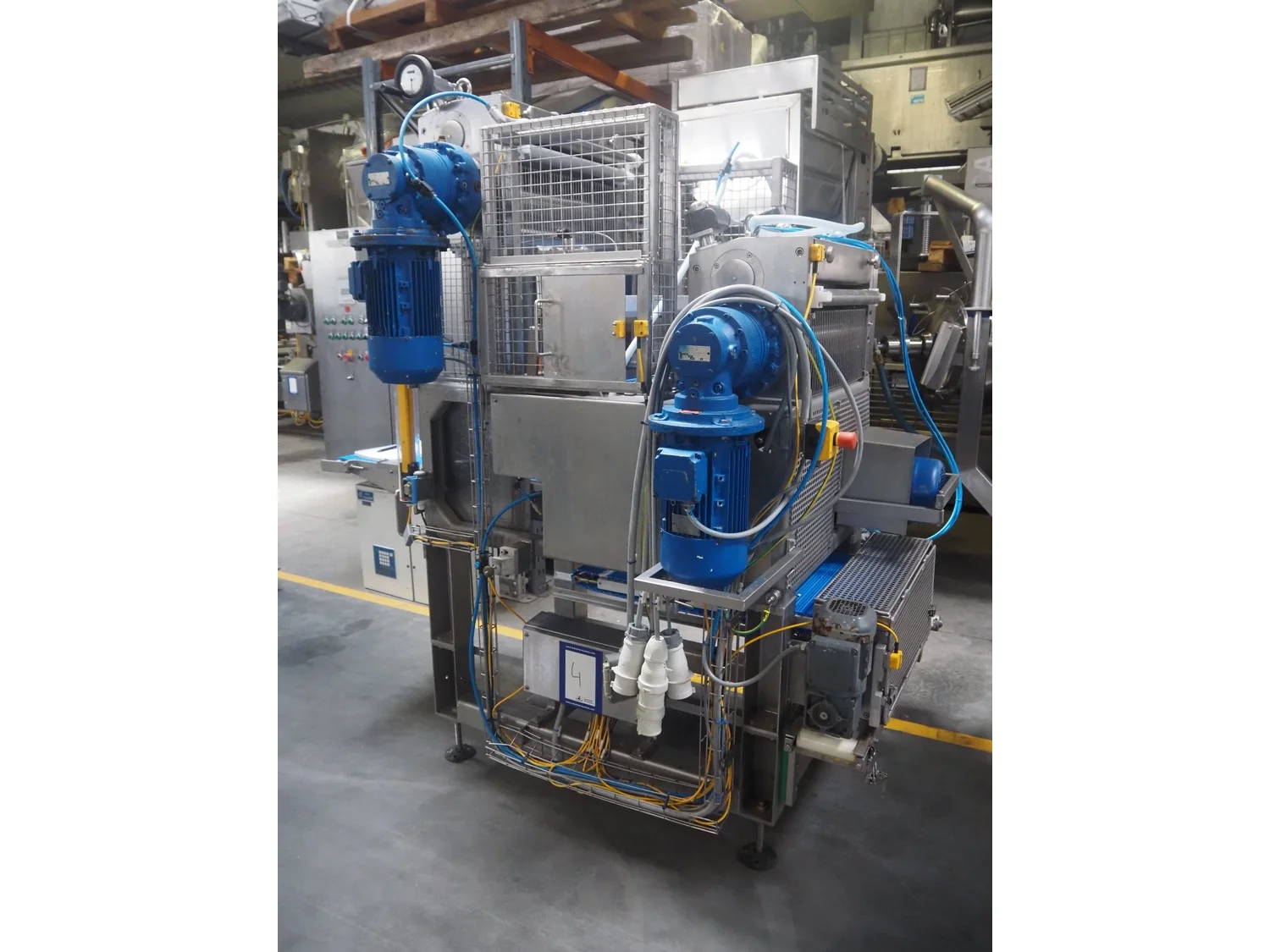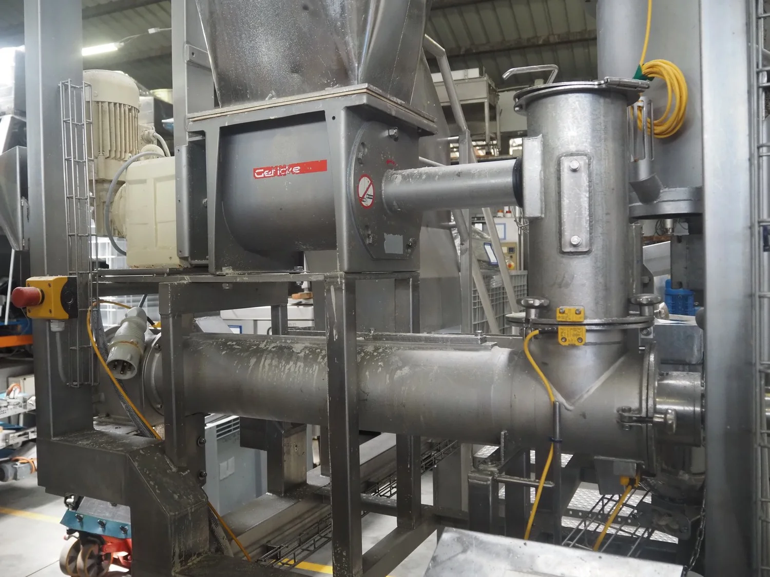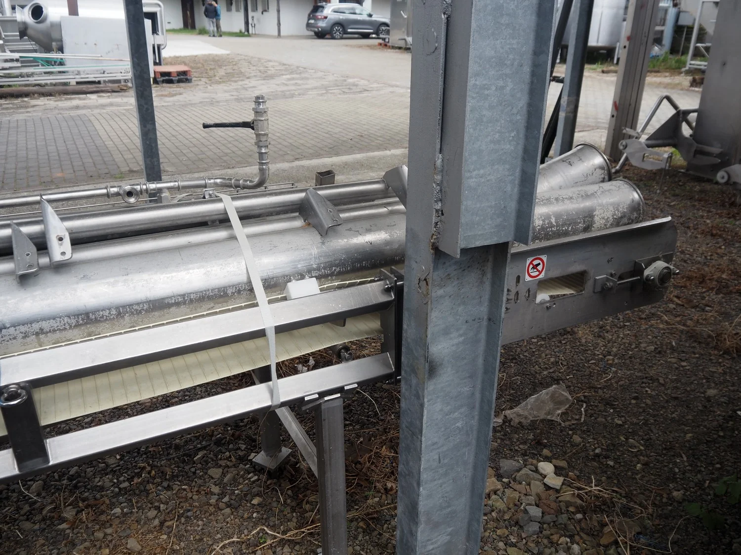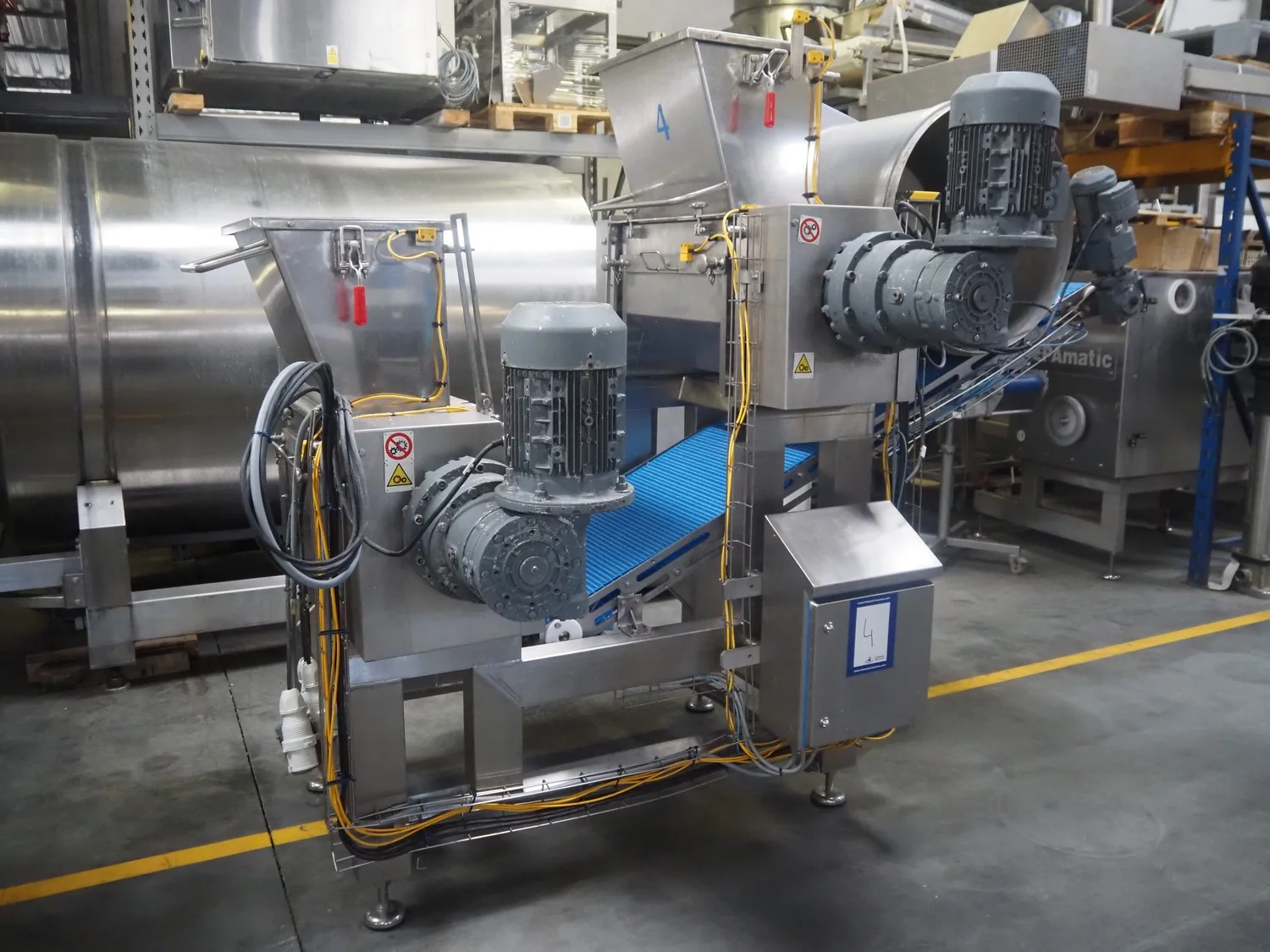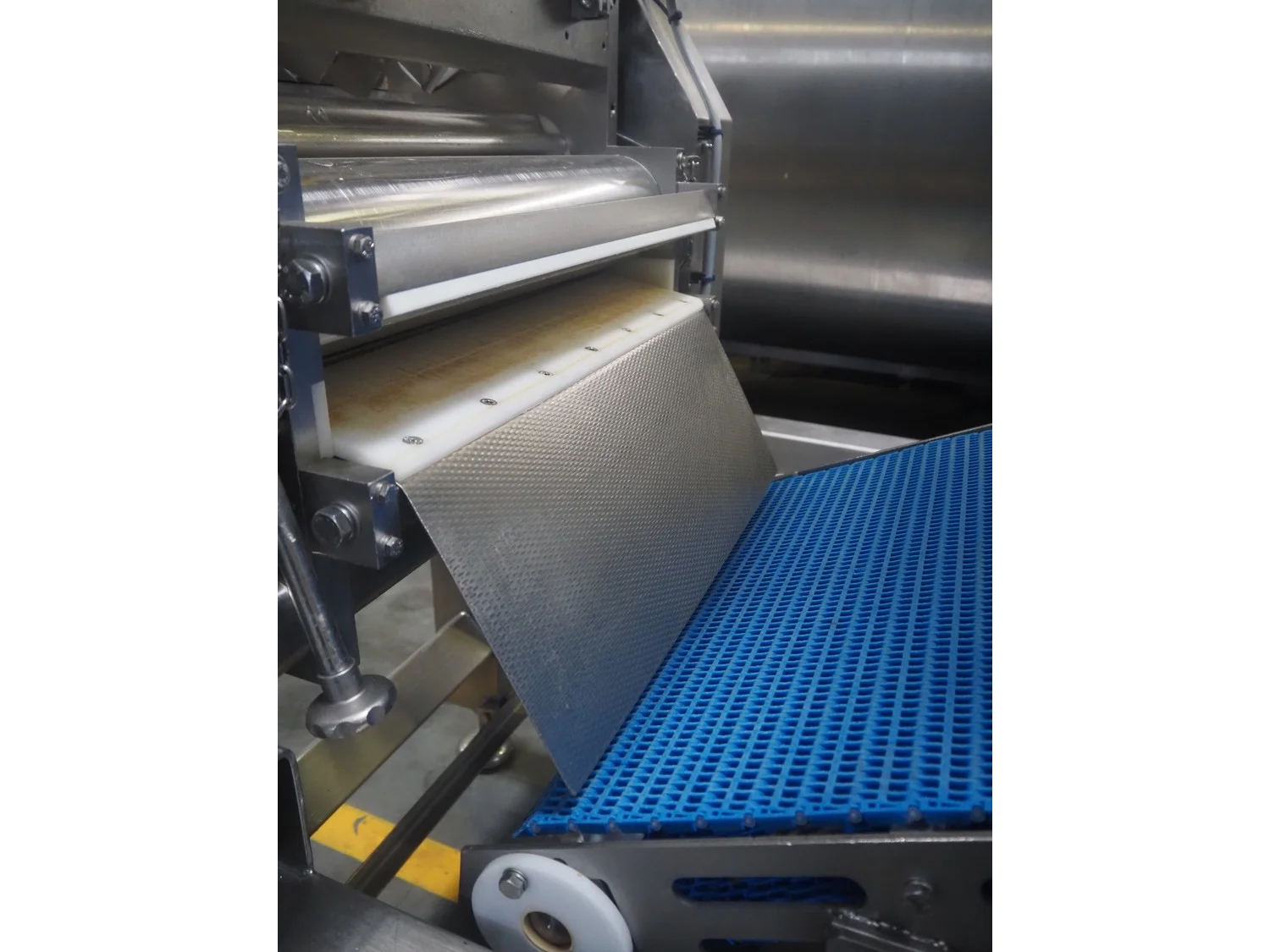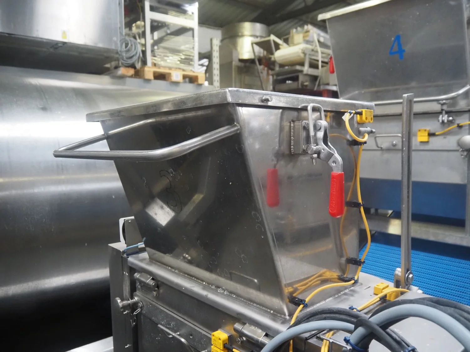 Toresani Foodmac line for ravioli, consisting of: 2 Pavan dough sheeters, plastic mesh belts, belt width: 550 mm, total dimensions: (2x) 2700 mm x 1500 mm x 2080 mm, 2 forming machines, plastic mesh belt, belt width: 550 mm, plastic outfeed belt, belt width: 150 mm, total dimensions: (2x) 2100 mm x 1600 mm x 2180 mm, platform with Gericke dosing pump, dimensions: 2700 mm x 1900 mm x 2650 mm, various transport belts, plastic belts, belt width: 500 mm, 400 mm and 200 mm, total dimensions pallet transport belts: 4600 mm x 1000 mm x 1600 mm, 2 mobile pumps, dimensions: (2x) 1000 mm x 550 mm x 1600 mm, 1 pallet with parts and 7 pallet boxes with parts, dimensions: (7x) 1200 mm x 800 mm x 800 mm.