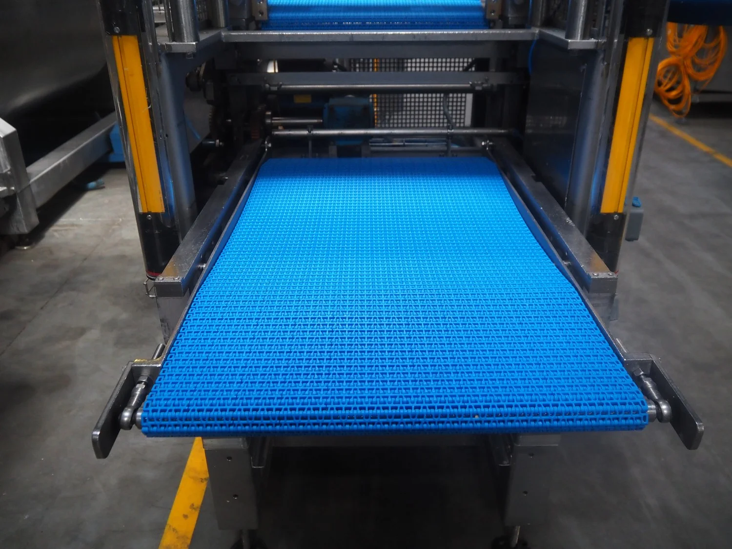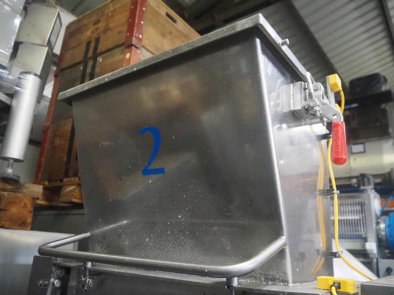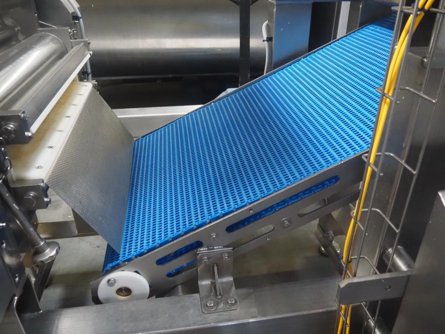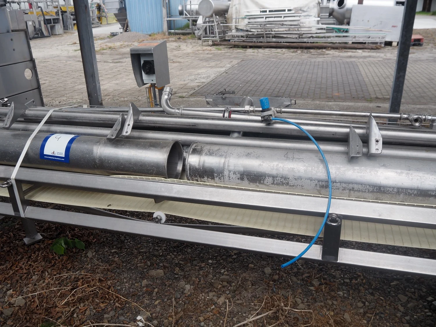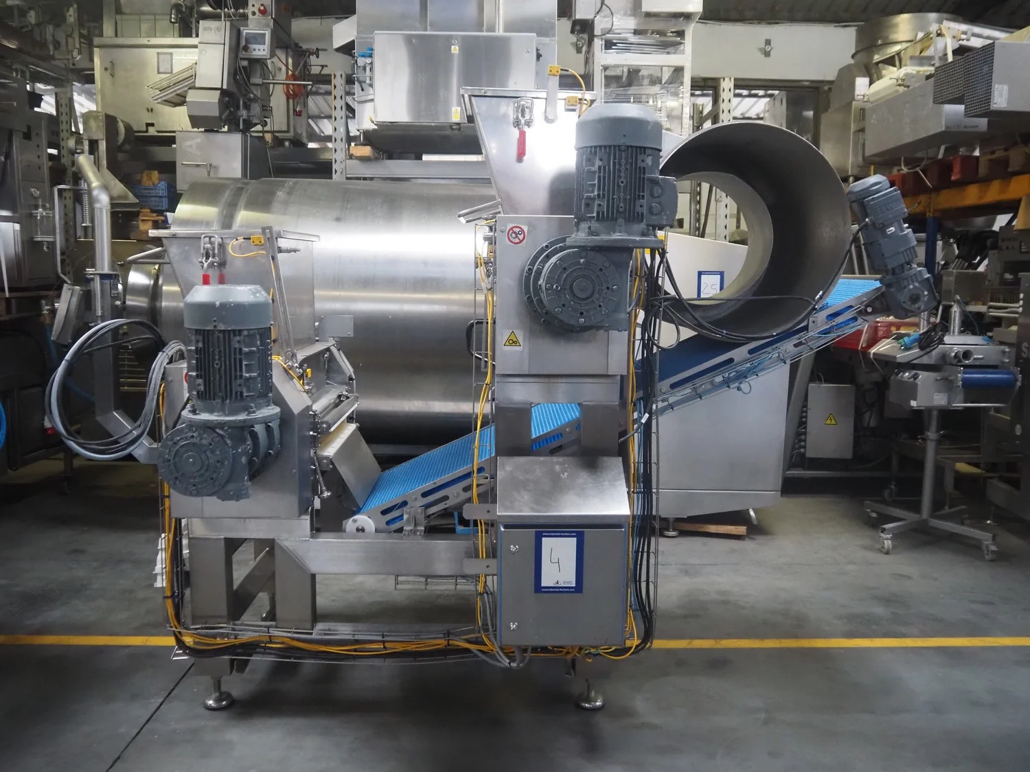 Toresani Foodmac line for ravioli, consisting of: 2 Pavan dough sheeters, plastic mesh belts, belt width: 550 mm, total dimensions: (2x) 2700 mm x 1500 mm x 2080 mm, 2 forming machines, plastic mesh belt, belt width: 550 mm, plastic outfeed belt, belt width: 150 mm, total dimensions: (2x) 2100 mm x 1600 mm x 2180 mm, platform with Gericke dosing pump, dimensions: 2700 mm x 1900 mm x 2650 mm, various transport belts, plastic belts, belt width: 500 mm, 400 mm and 200 mm, total dimensions pallet transport belts: 4600 mm x 1000 mm x 1600 mm, 2 mobile pumps, dimensions: (2x) 1000 mm x 550 mm x 1600 mm, 1 pallet with parts and 7 pallet boxes with parts, dimensions: (7x) 1200 mm x 800 mm x 800 mm.