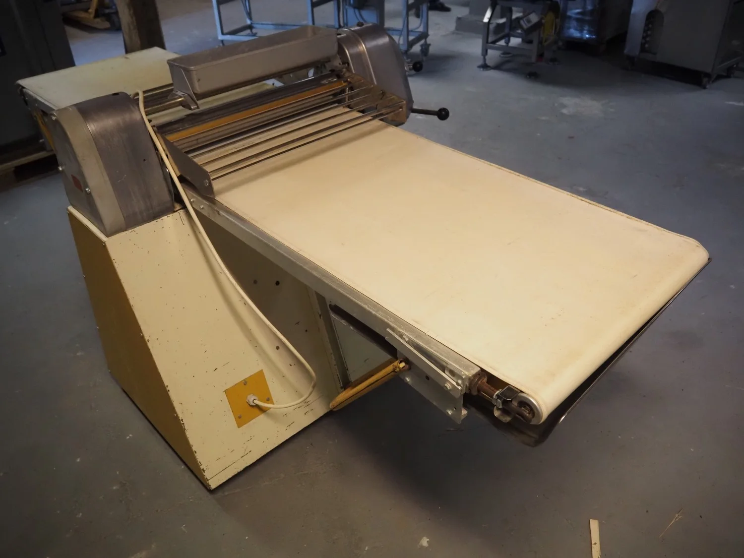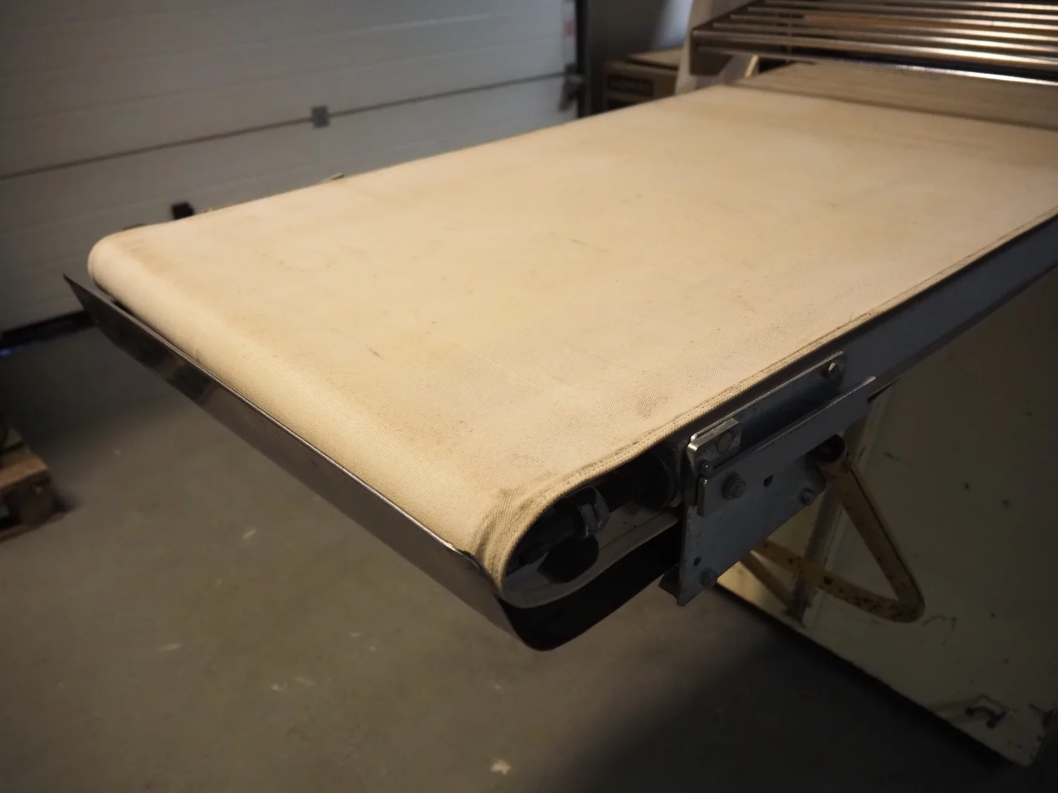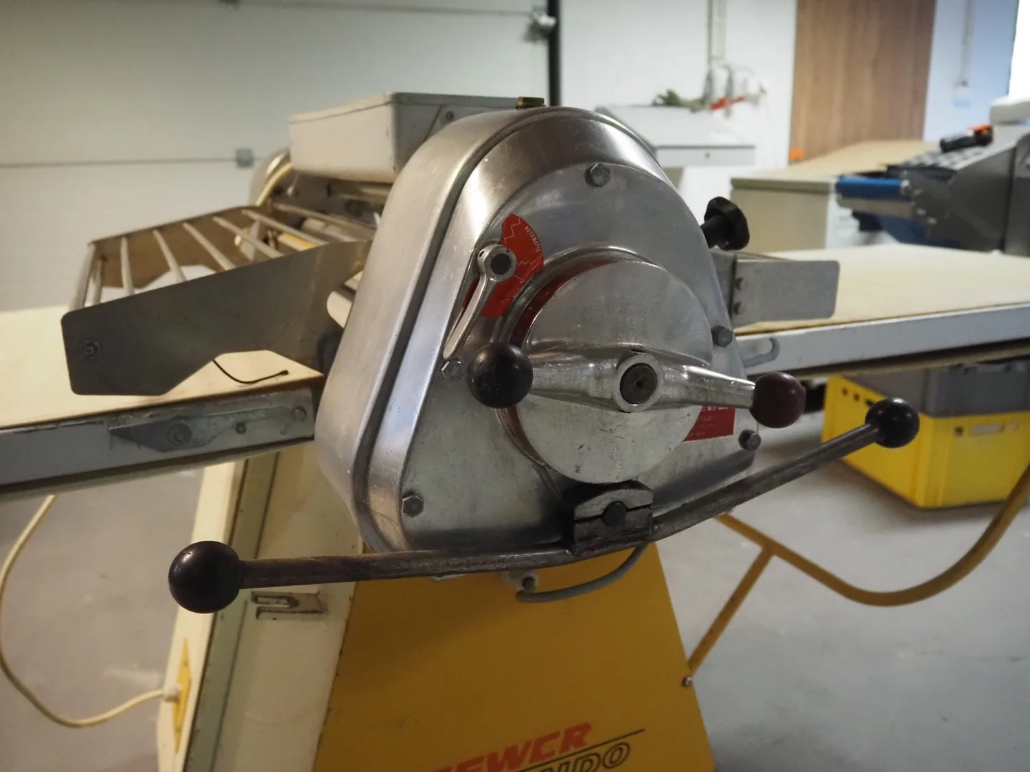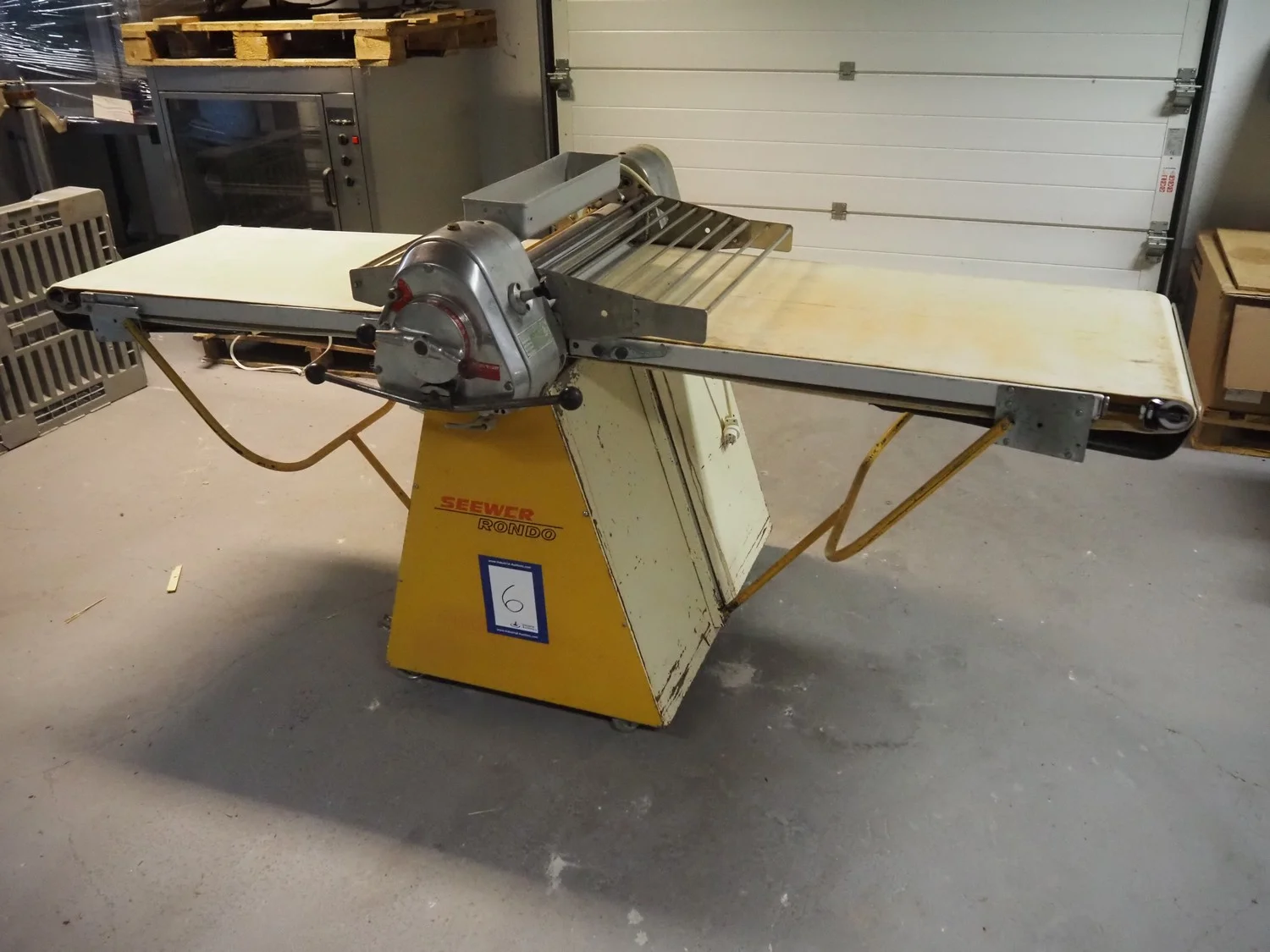 Seewer Rondo mobile dough sheeter, type: Svn-Aut, model: 8-604, series: 6.6, machine number: 466, 230 V, 1 Ph, 50 Hz, 1.1 kW, cloth belt, belt width: 600 mm, total dimensions: 2500 mm x 900 mm x 1140 mm.