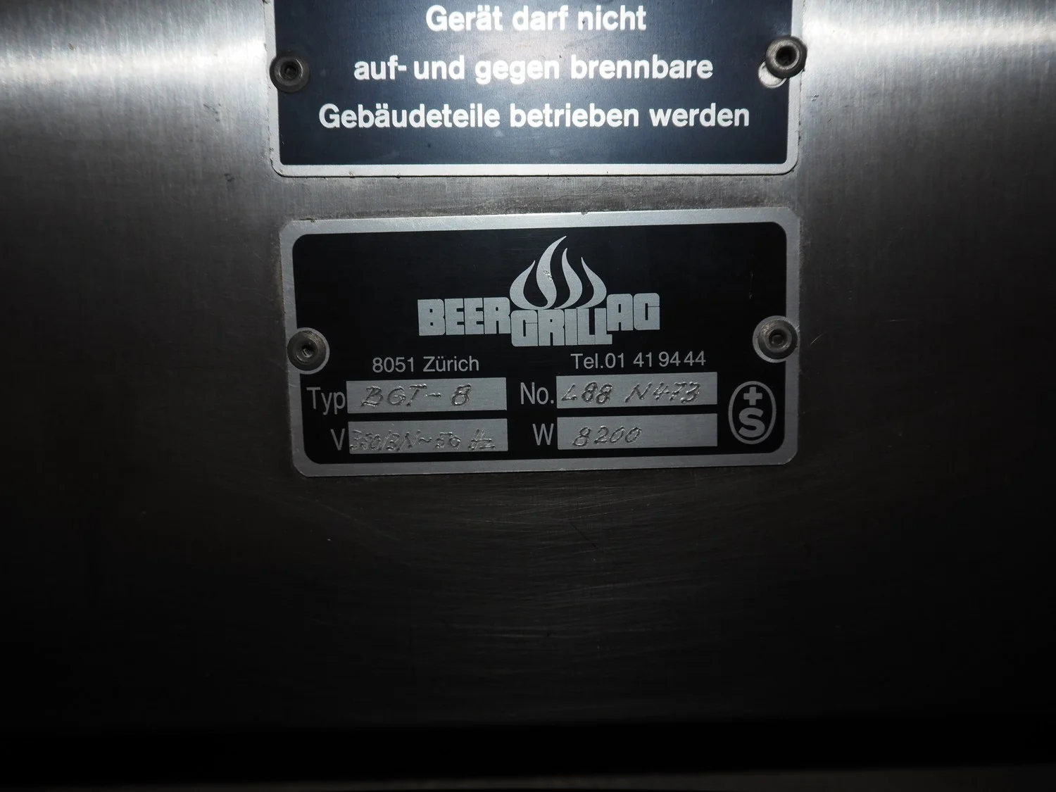Beer Grill AG rotisserie grill, type: BGT-8, number: 488 N473, 380 V, 3 Ph, 50 Hz, 8200 W, dimensions: 1000 mm x 840 mm x 1060 mm.