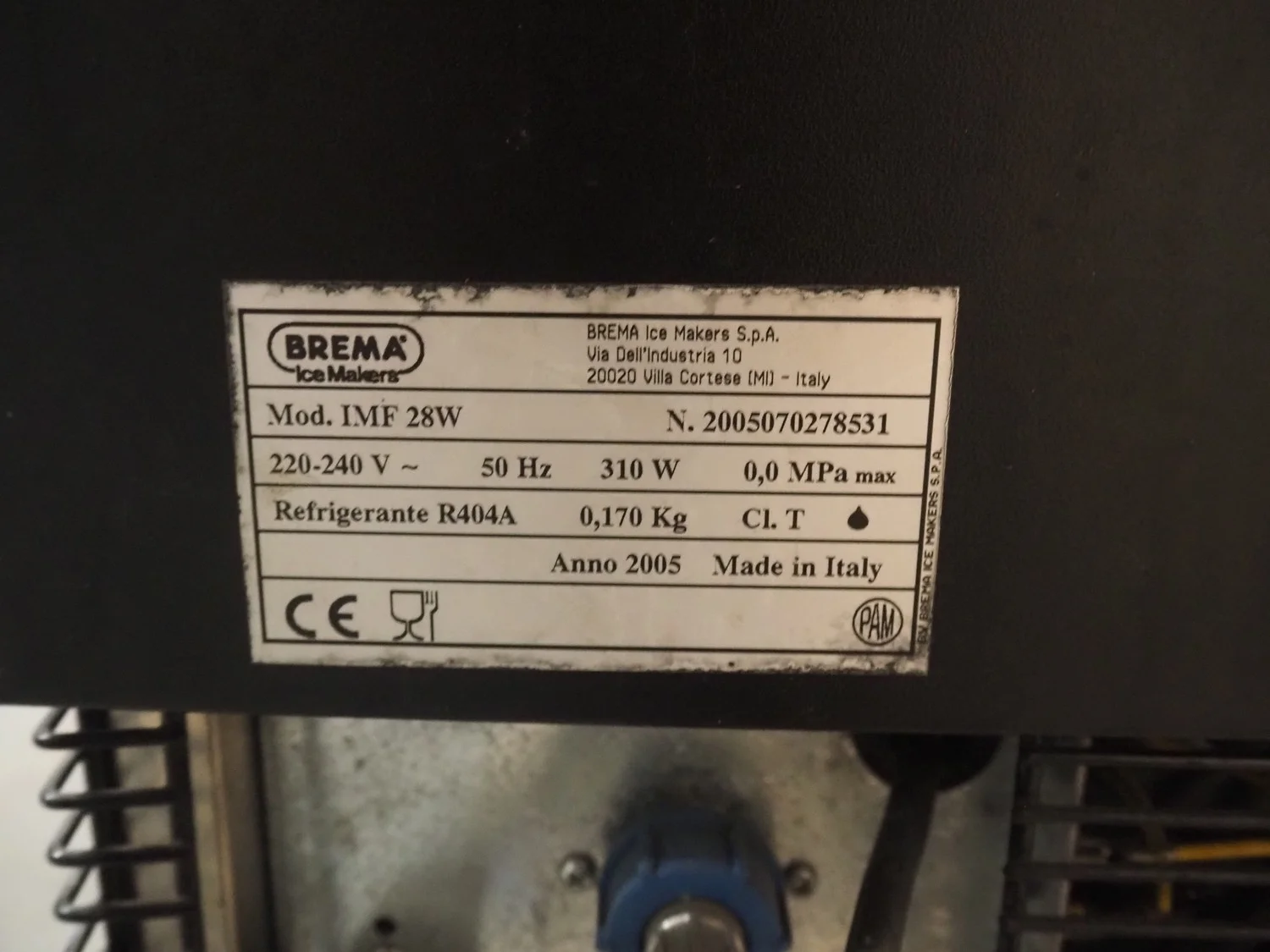 Brema ice machine, model: IMF.28W, number: 2005070278531, year of construction: 2005, 220-240 V, 50 Hz, 310 W, refrigerant: R404A/0.170 kg, dimensions: 390 mm x 460 mm x 590 mm.