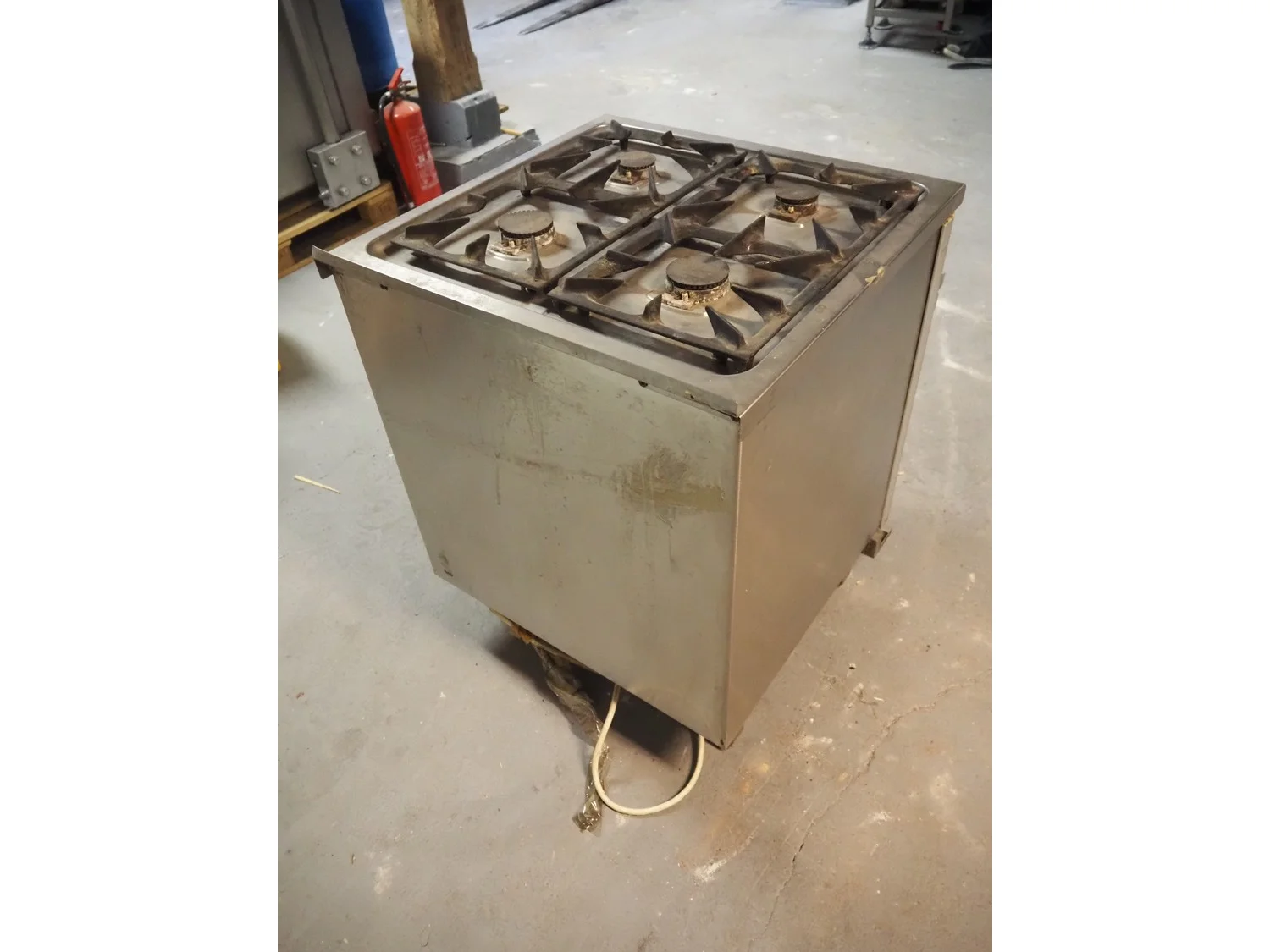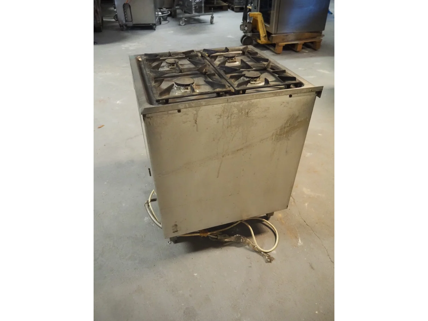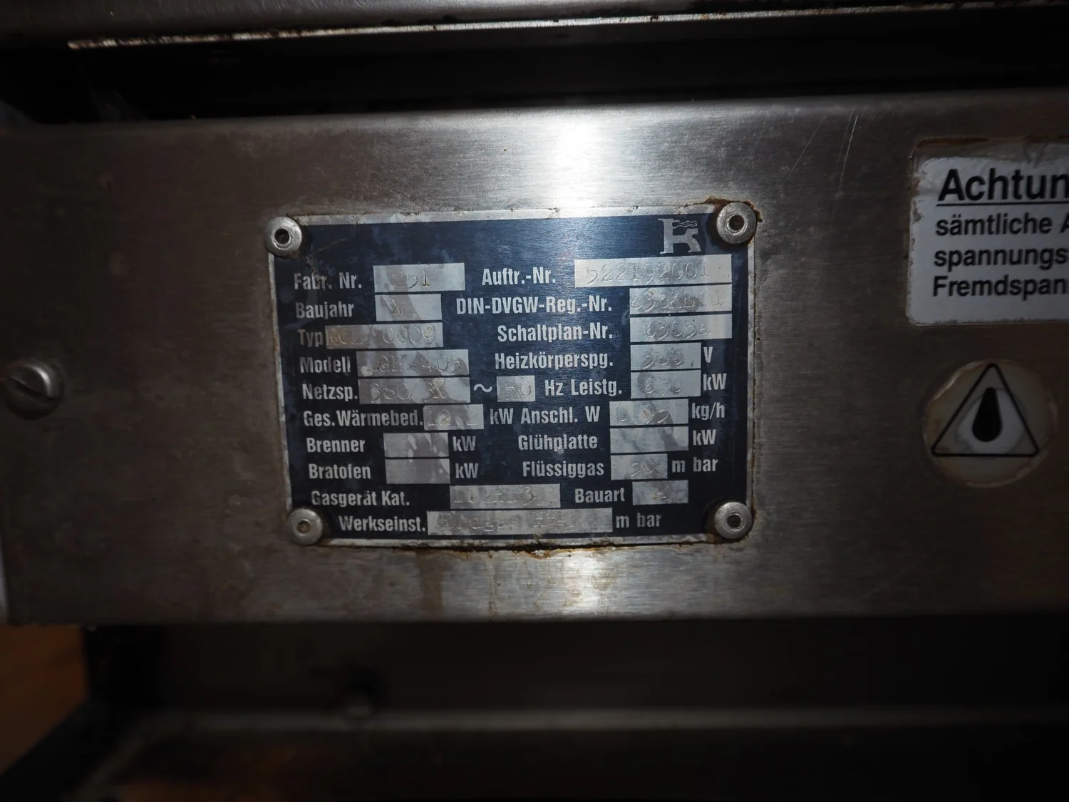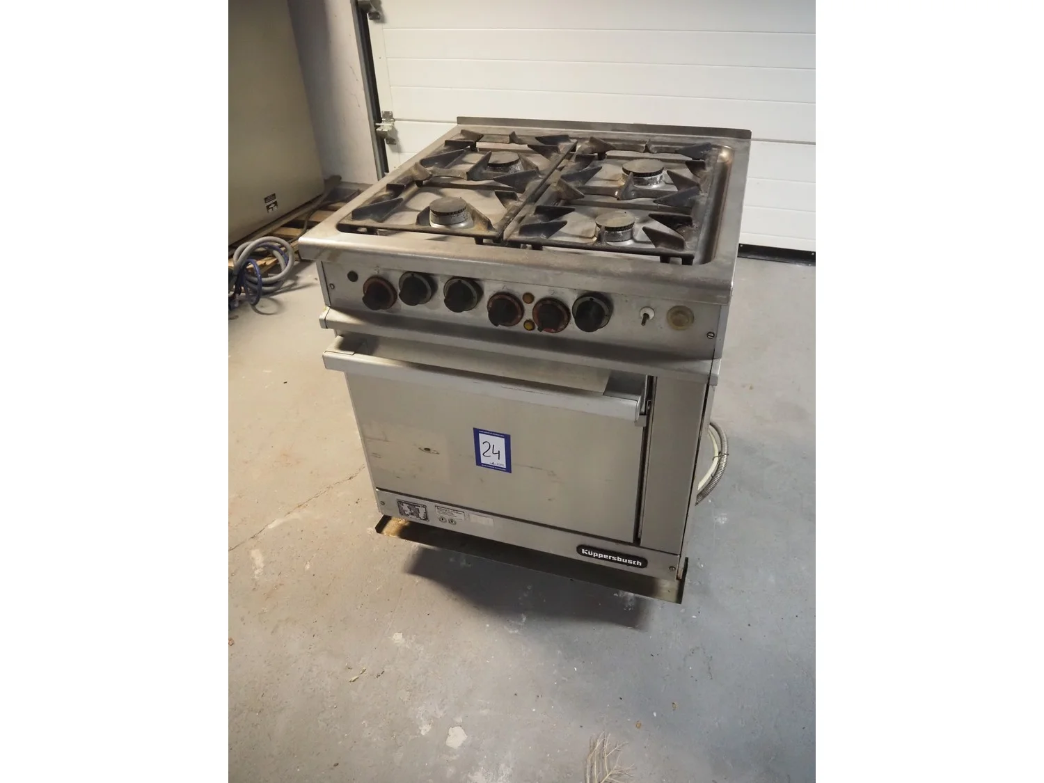 Küppersbusch 4-burner stove with oven, type: KCI 0009, number: 251, 380 V, 3 Ph, 50 Hz, 6.0 kW, 4 floors, dimensions floors: (4x) 520 mm x 370 mm, total dimensions: 700 mm x 700 mm x 880 mm.