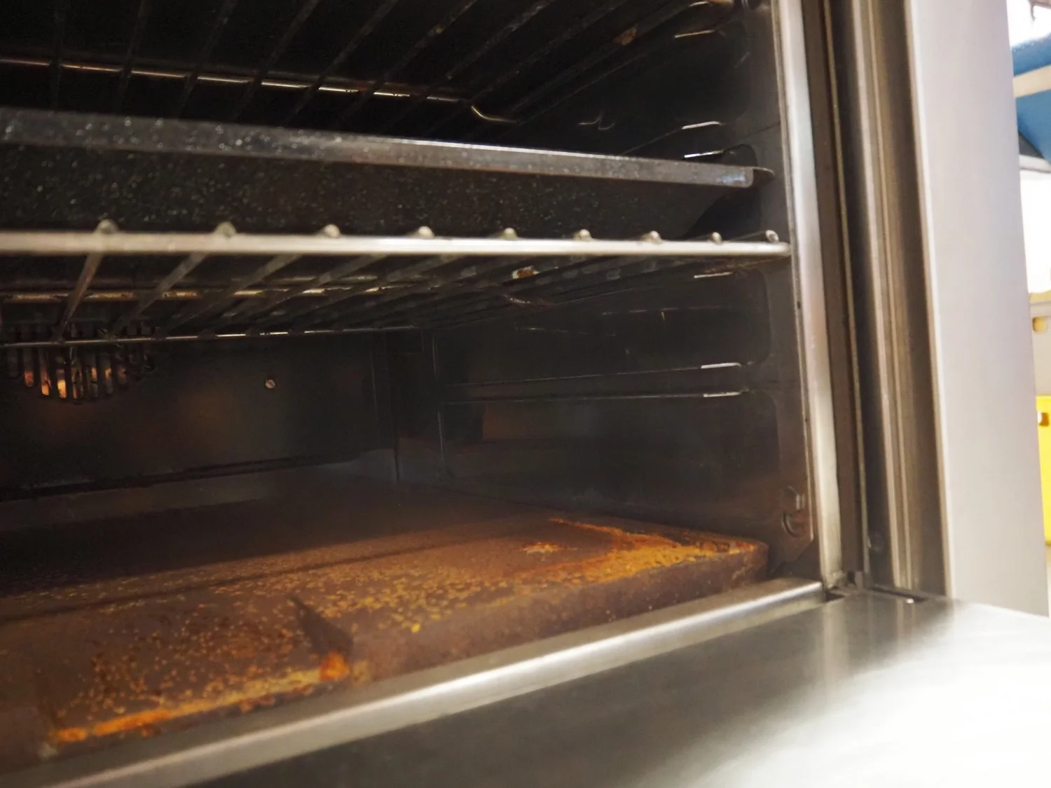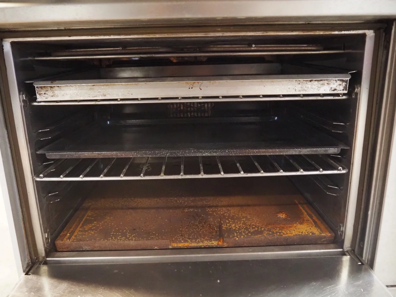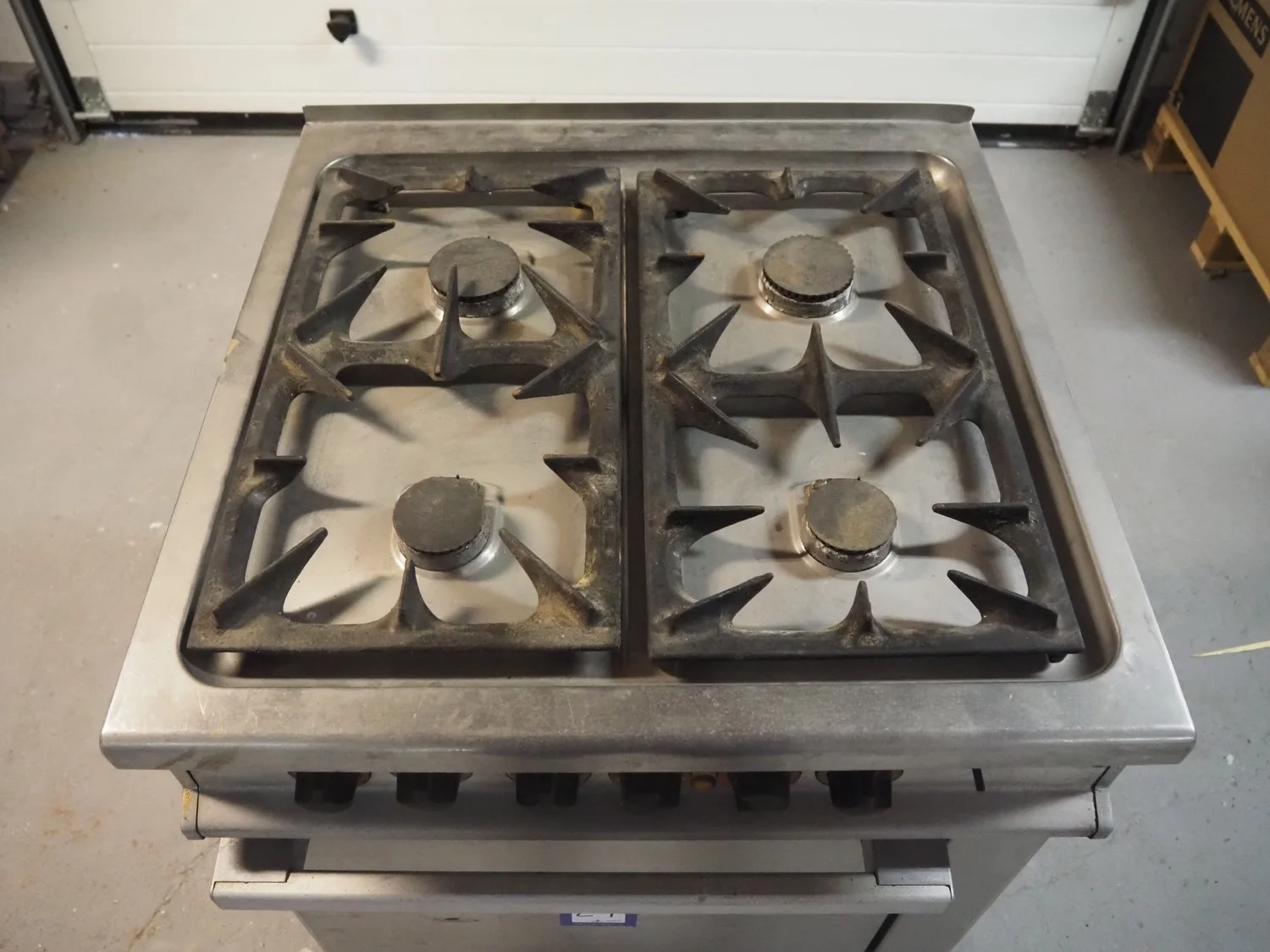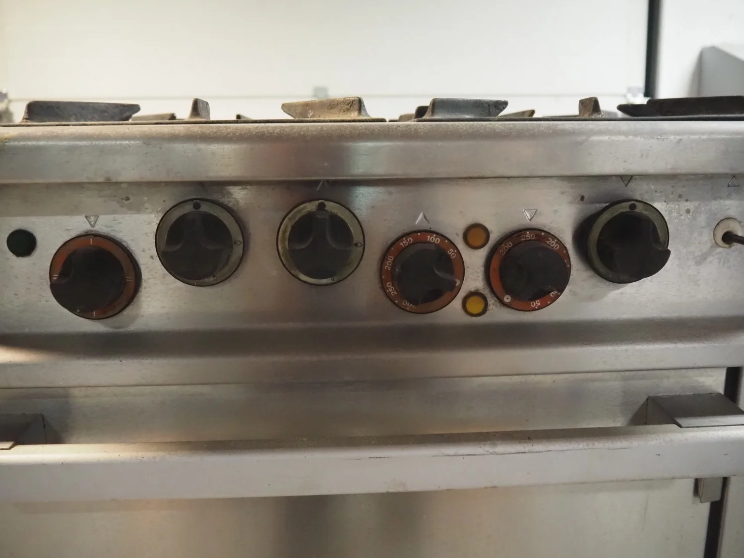 Küppersbusch 4-burner stove with oven, type: KCI 0009, number: 251, 380 V, 3 Ph, 50 Hz, 6.0 kW, 4 floors, dimensions floors: (4x) 520 mm x 370 mm, total dimensions: 700 mm x 700 mm x 880 mm.