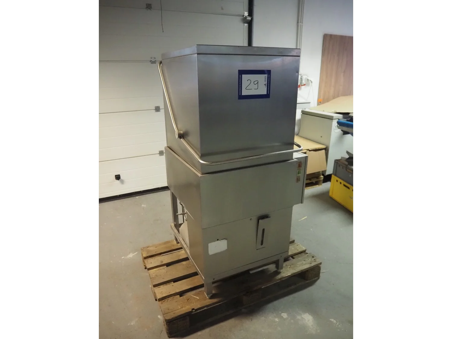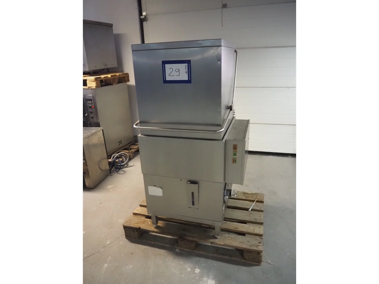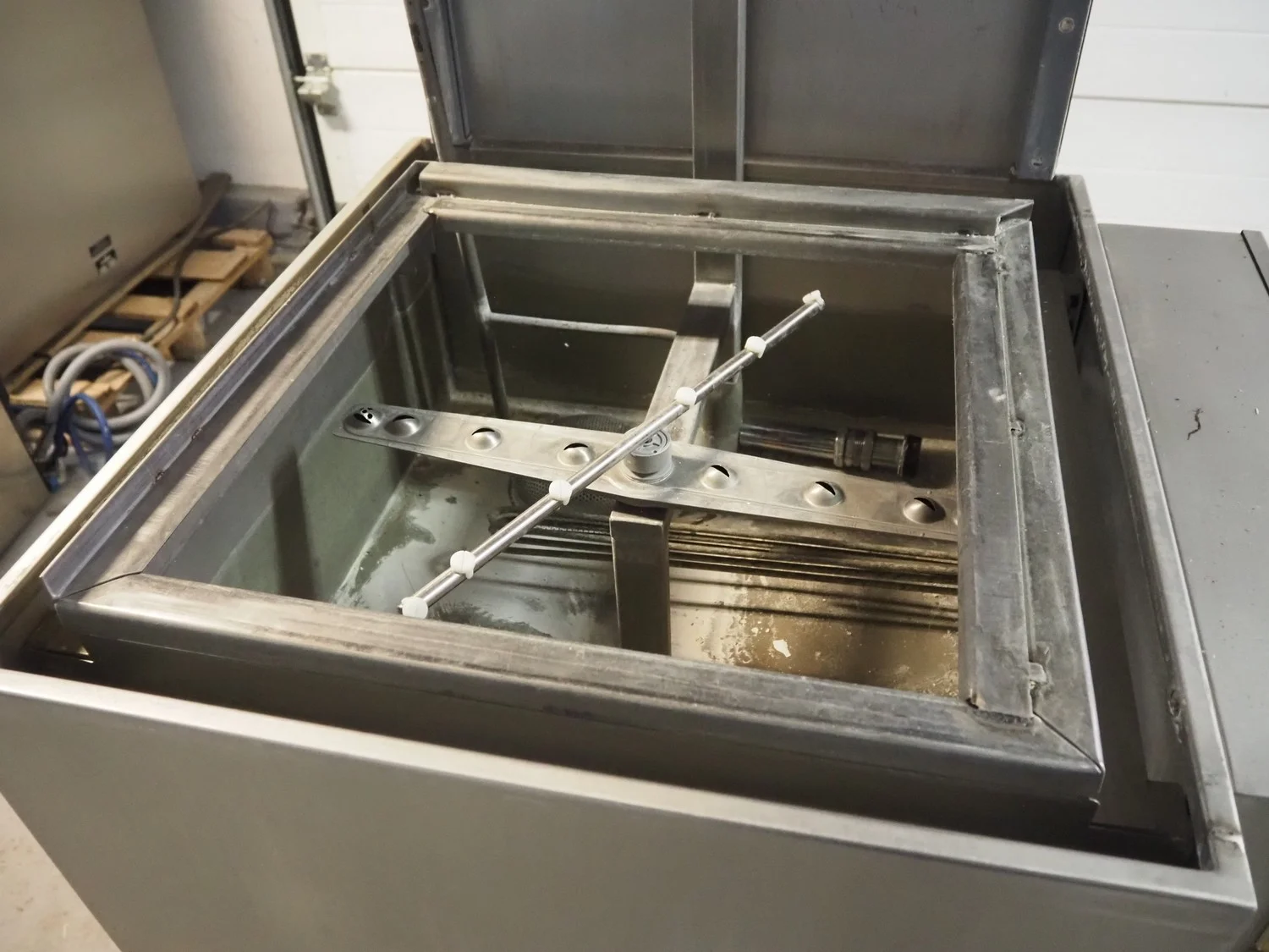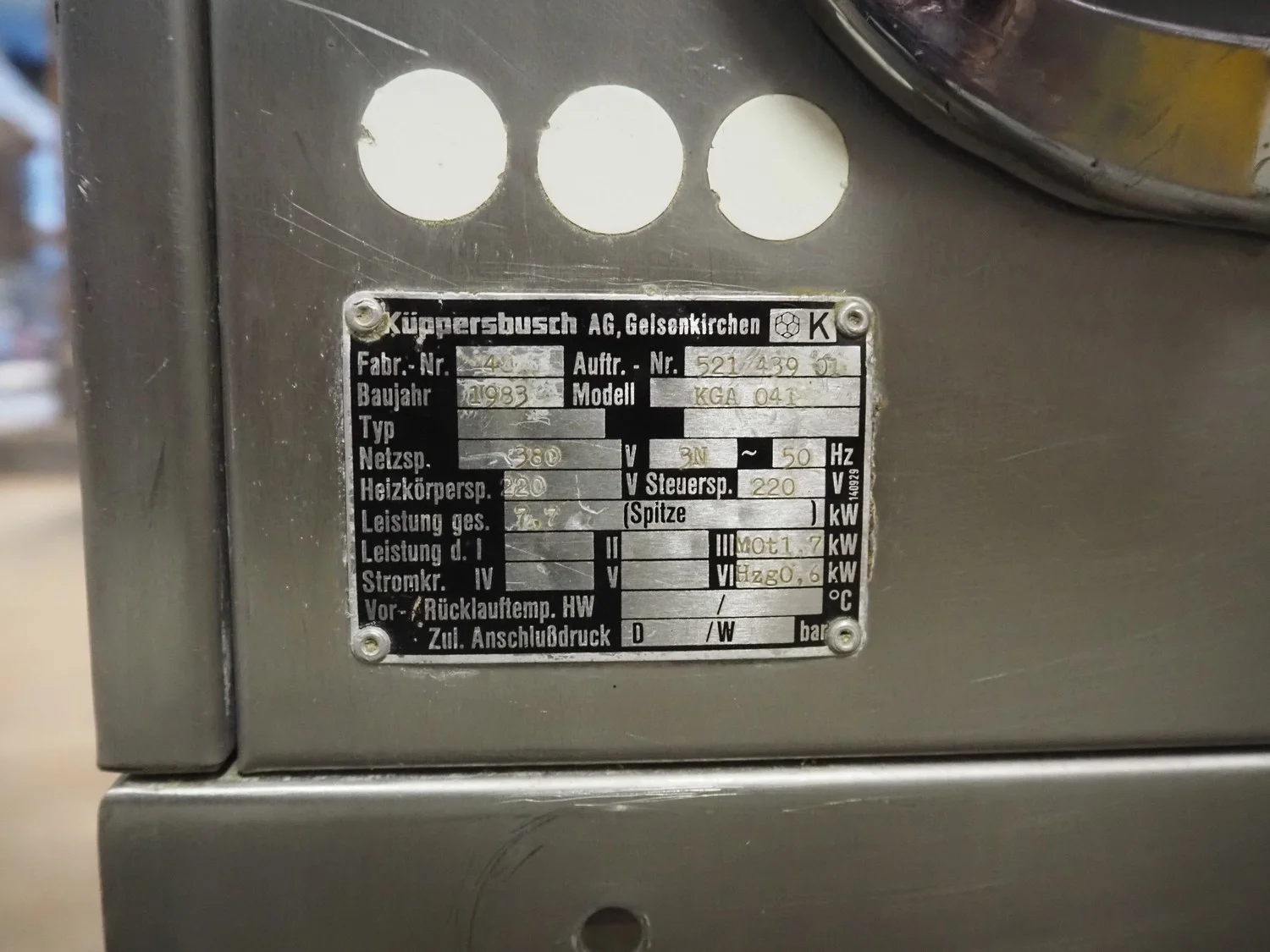 Küppersbusch dishwasher, model: KGA 041, number: 521 439 01, year of construction: 1983, 380 V, 3 Ph, 50 Hz, 7.7 kW, inside dimensions: 510 m x 510 mm, total dimensions: 780 mm x 830 mm x 1470 mm. Including 2 plastic crates.