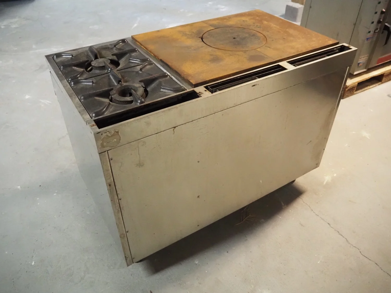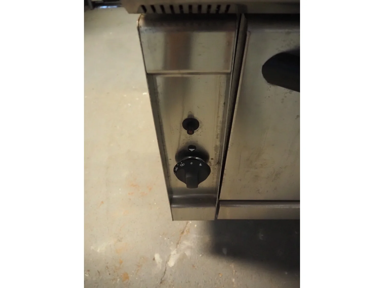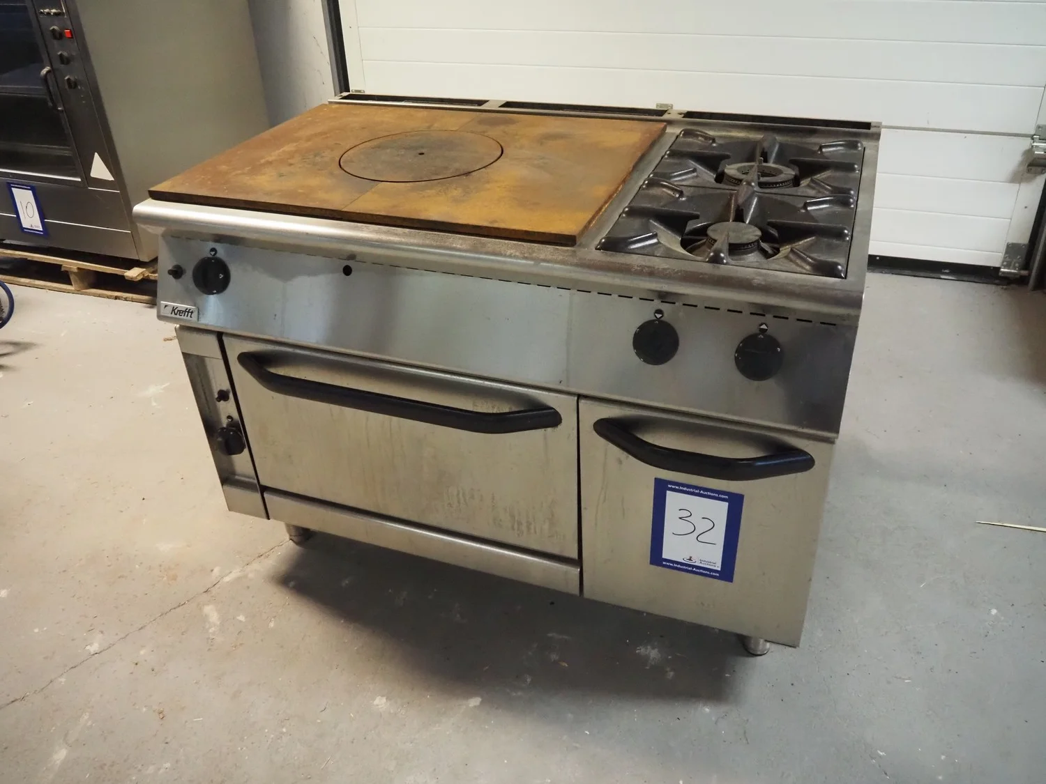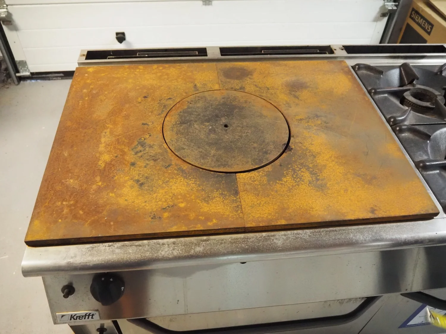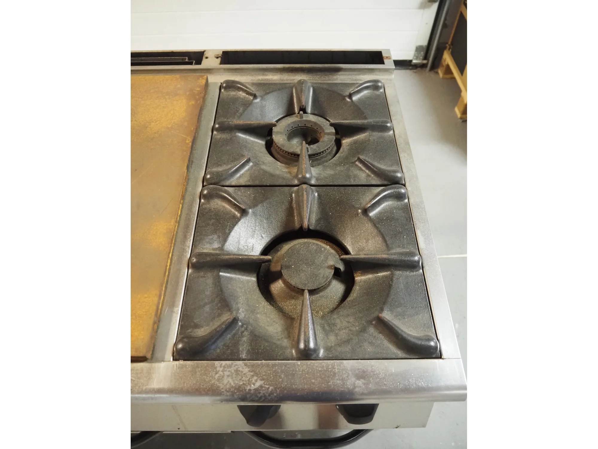 Kreft 3-burner stove with oven, dimensions griddle, 800 mm x 580 mm, floor dimensions oven: (3x) 530 mm x 650 mm, total dimensions: 1200 mm x 740 mm x 860 mm.