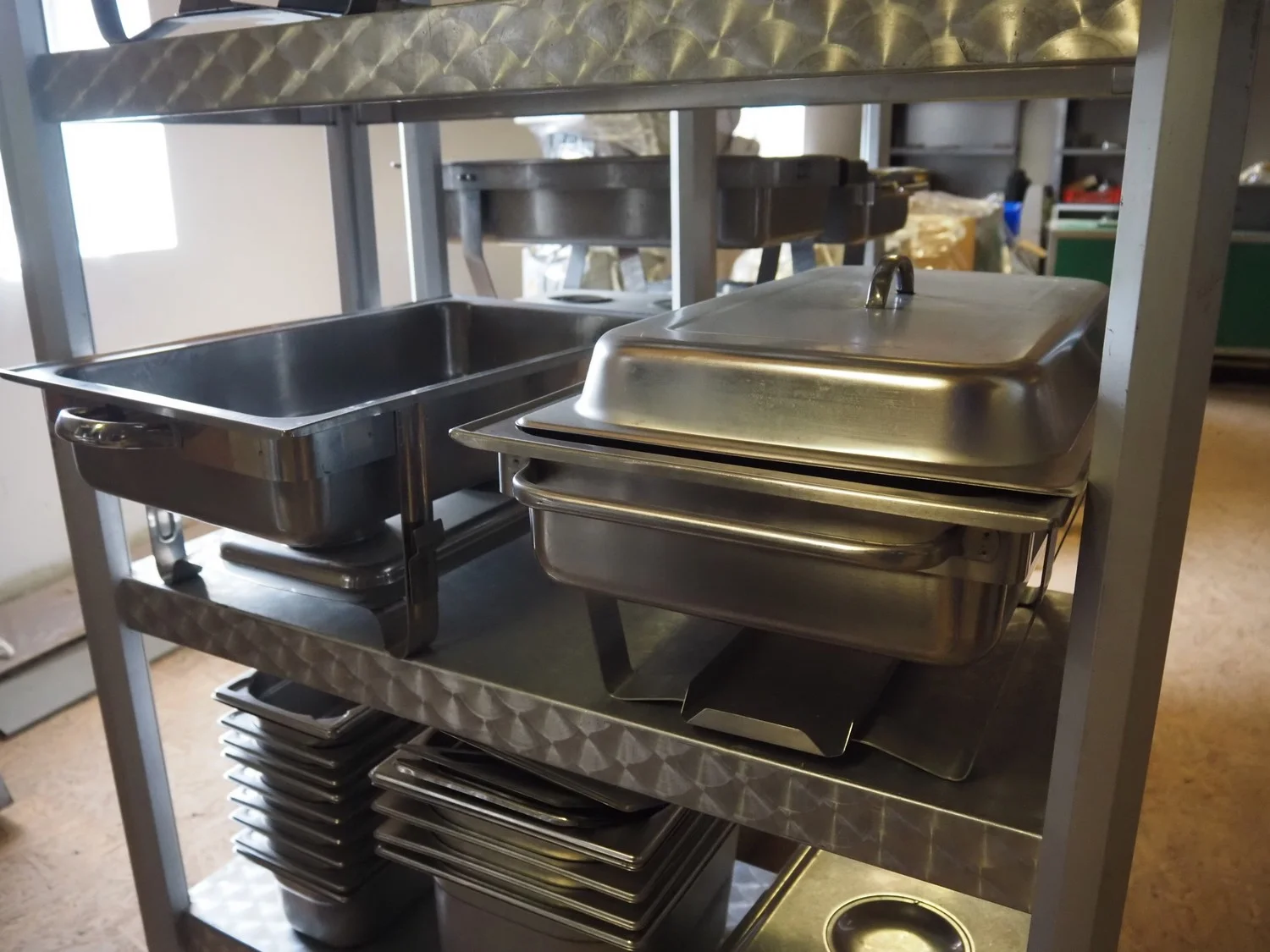 S/s rack with various kitchen equipment, dimensions: 930 mm x 440 mm x 1830 mm.