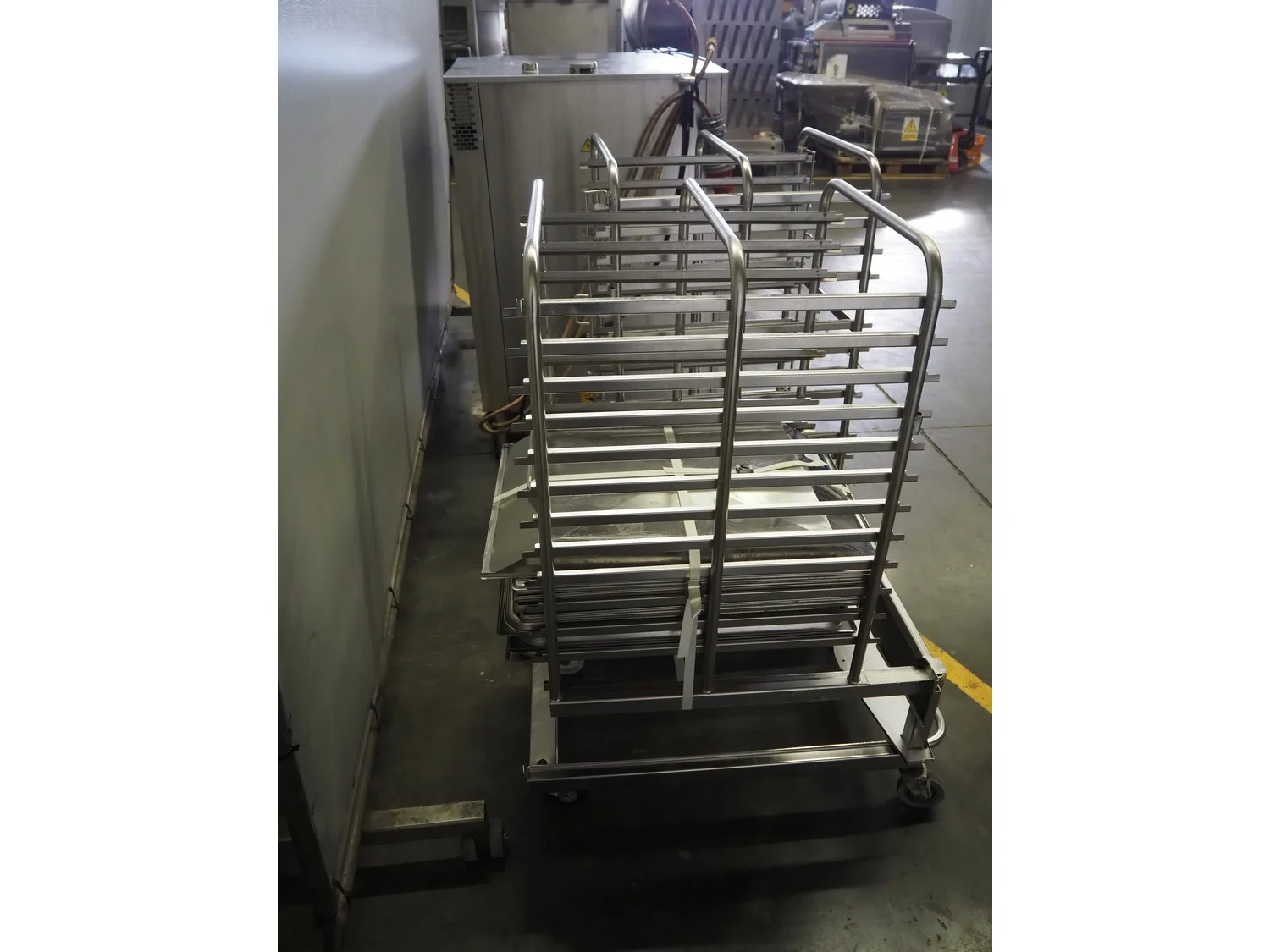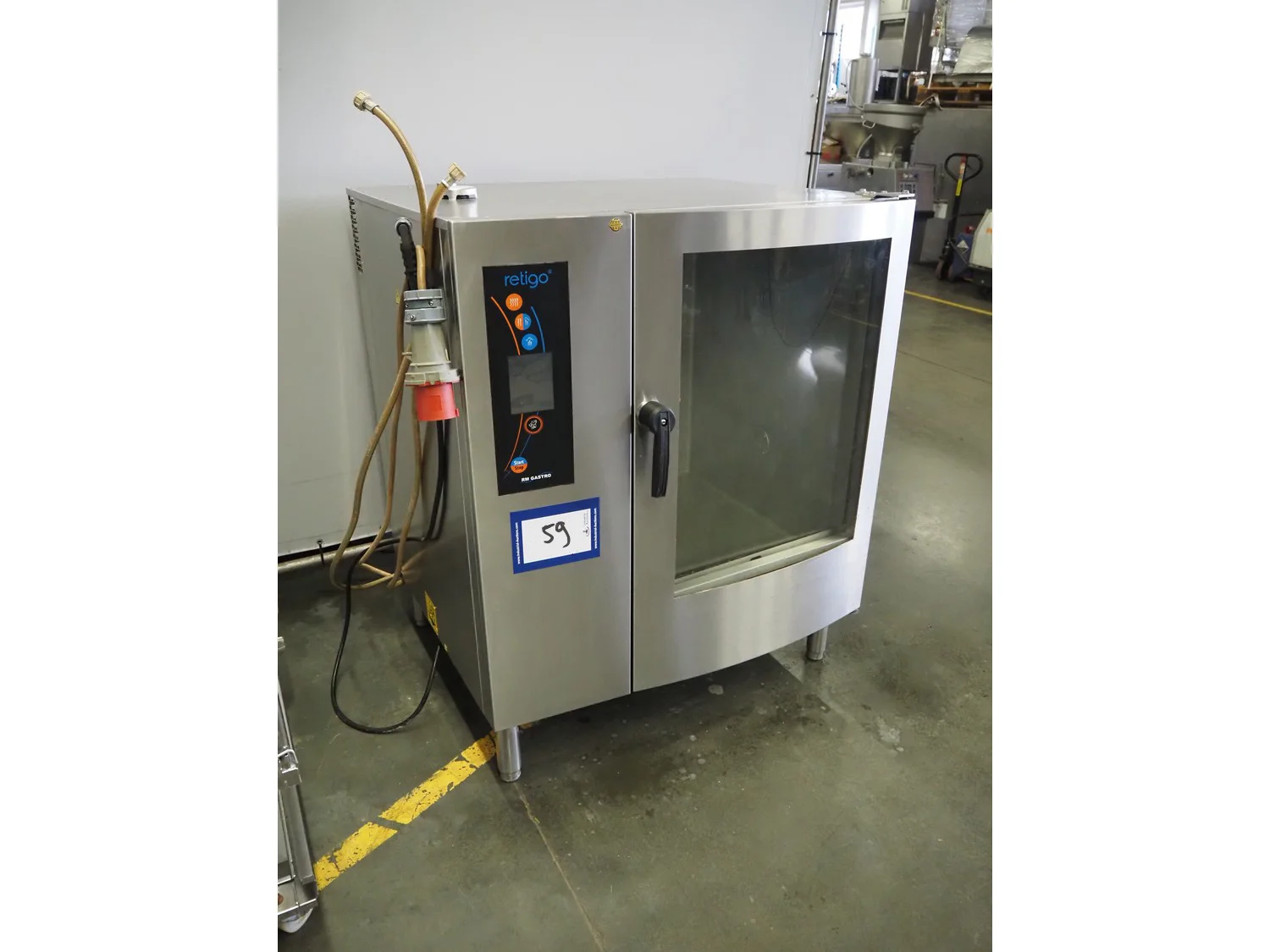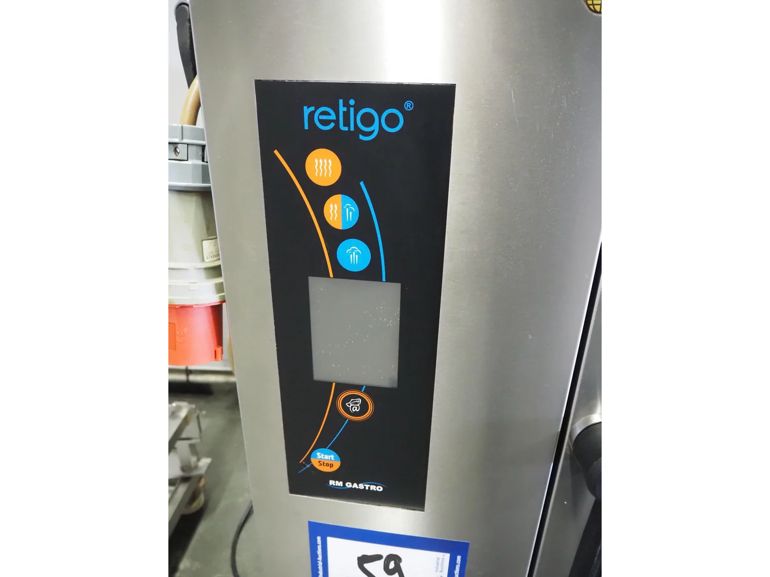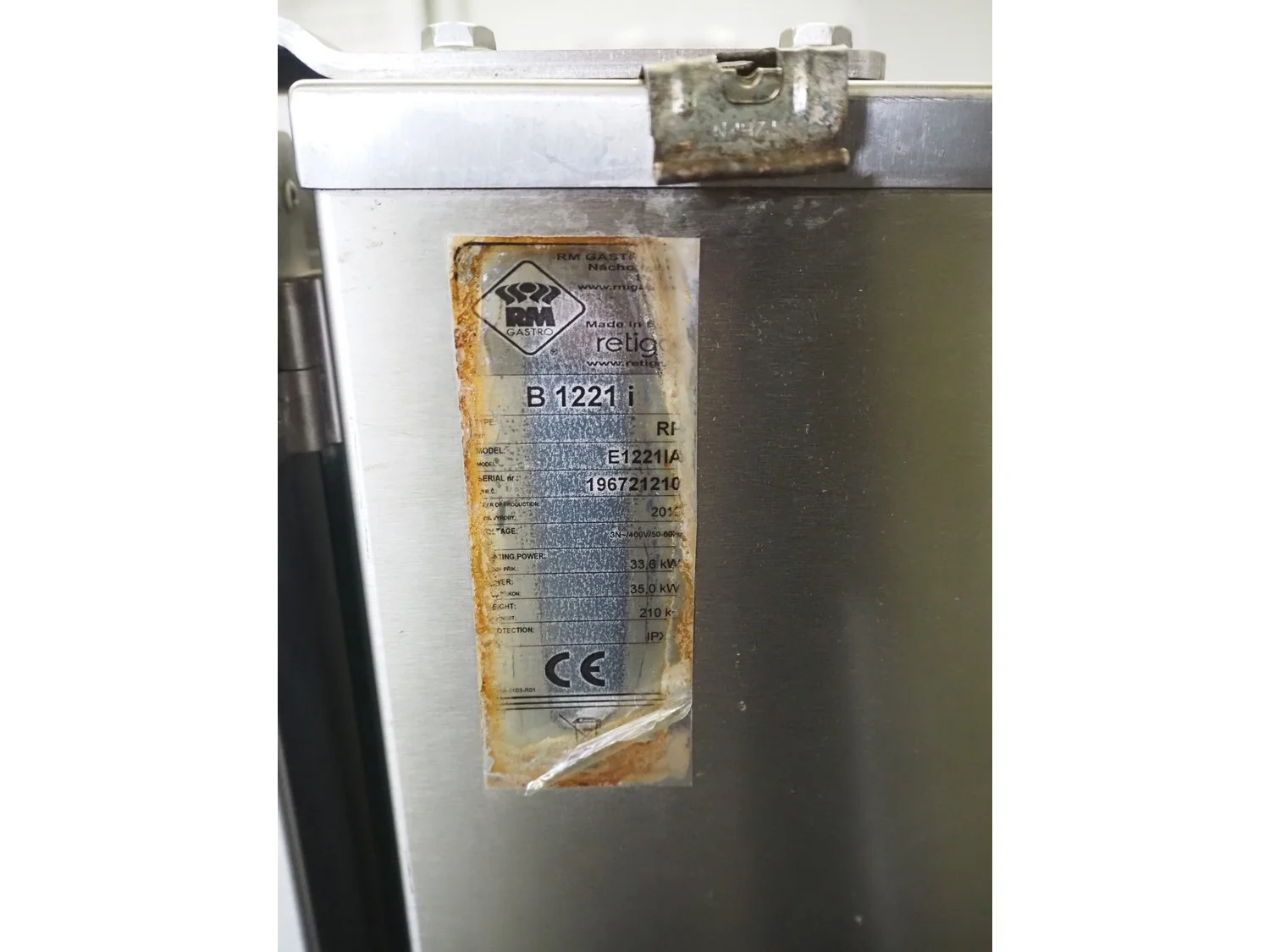 RM Gastro combi steamer, model: E1221|A, type: RB, serial number: 196721210, year of construction: 2016, 400 V, 3 Ph, 50-60 Hz, 33.6/35 kW, weight: 210 kg, dimensions: 1200 mm x 950 mm x 1350 mm. Including 2 s/s trolleys for combi steamer, (2x) 13 floors , dimensions each floor: 540 mm x 650 mm, total dimensions: (2x) 930 mm x 650 mm x 1250 mm.