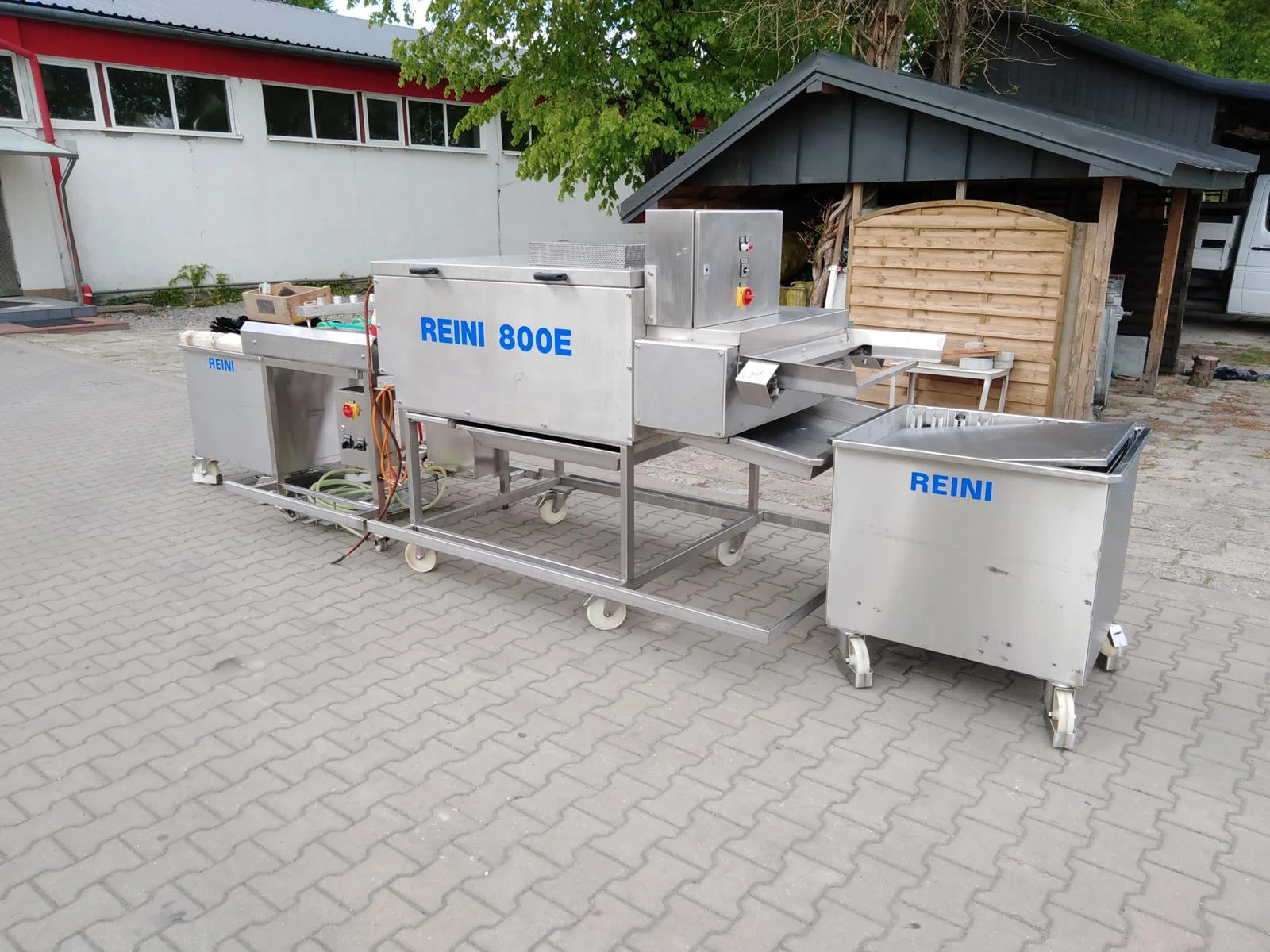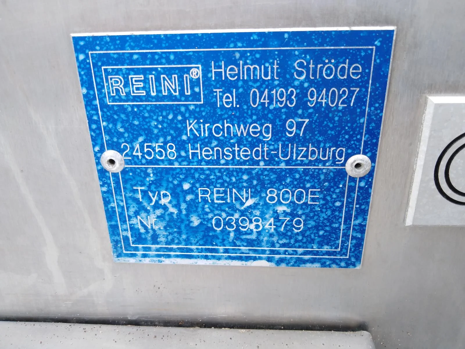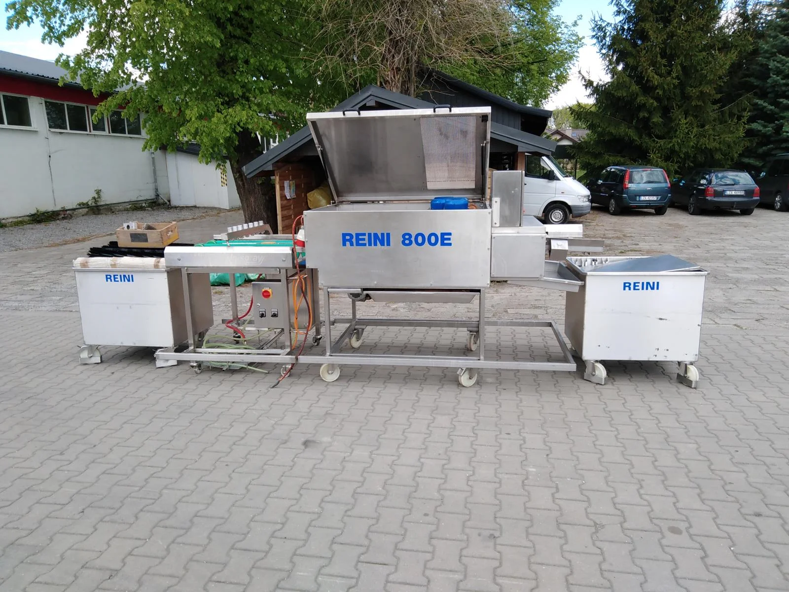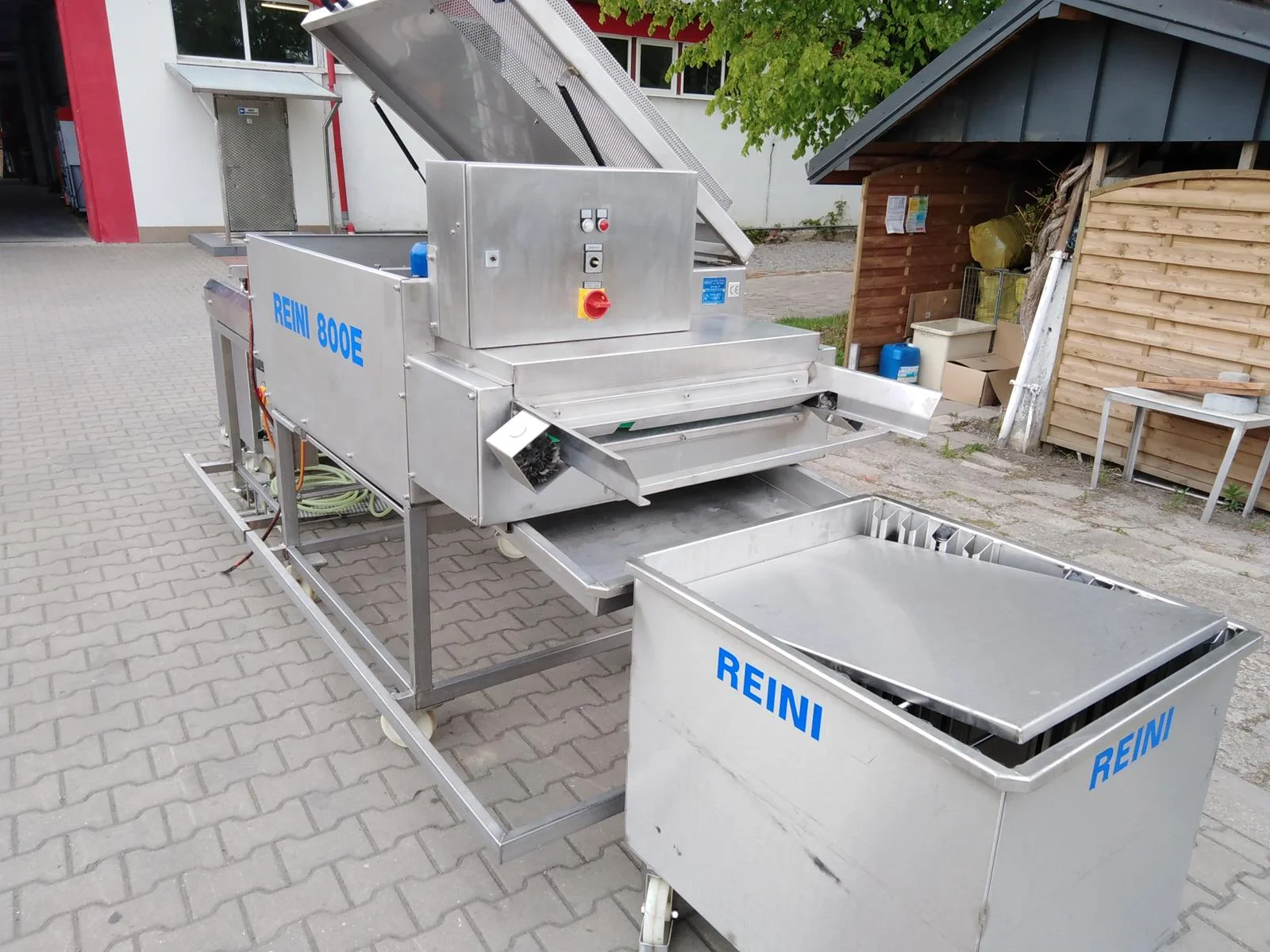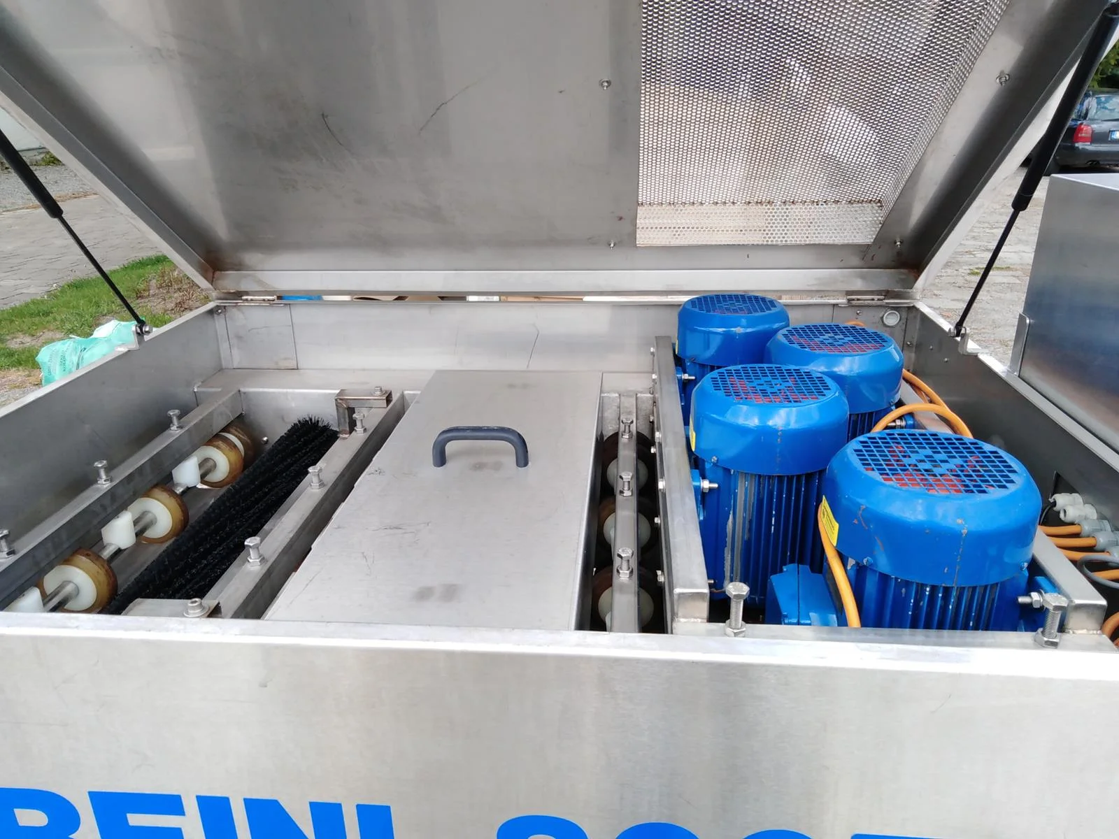 Reini mobile tray cleaning machine with oiling station, type: 800 E, number: 0398479, 380 V, 50 Hz, dimensions: 4000 mm x 1000 mm x 1700 mm. Including 2 s/s mobile tubs with spare parts.