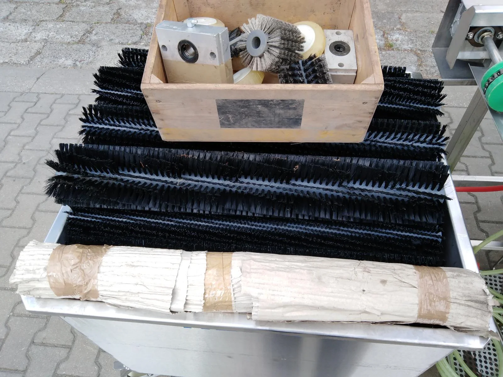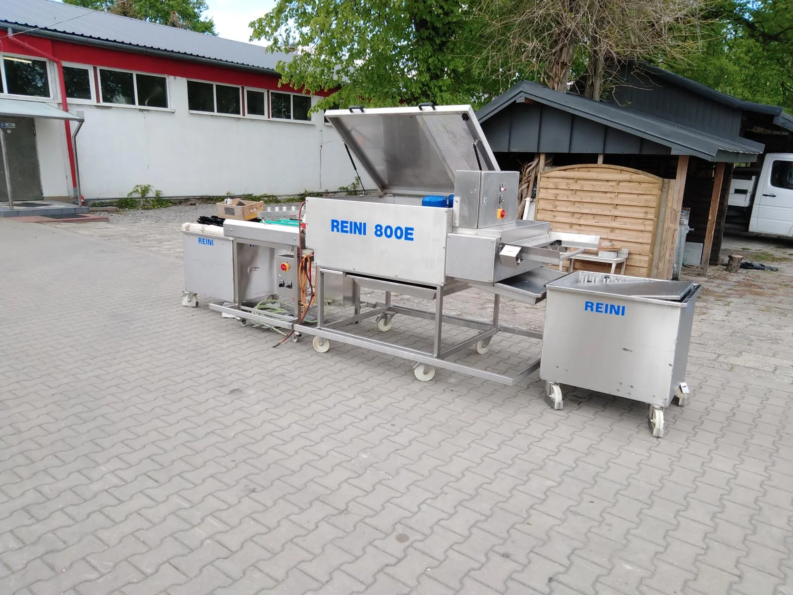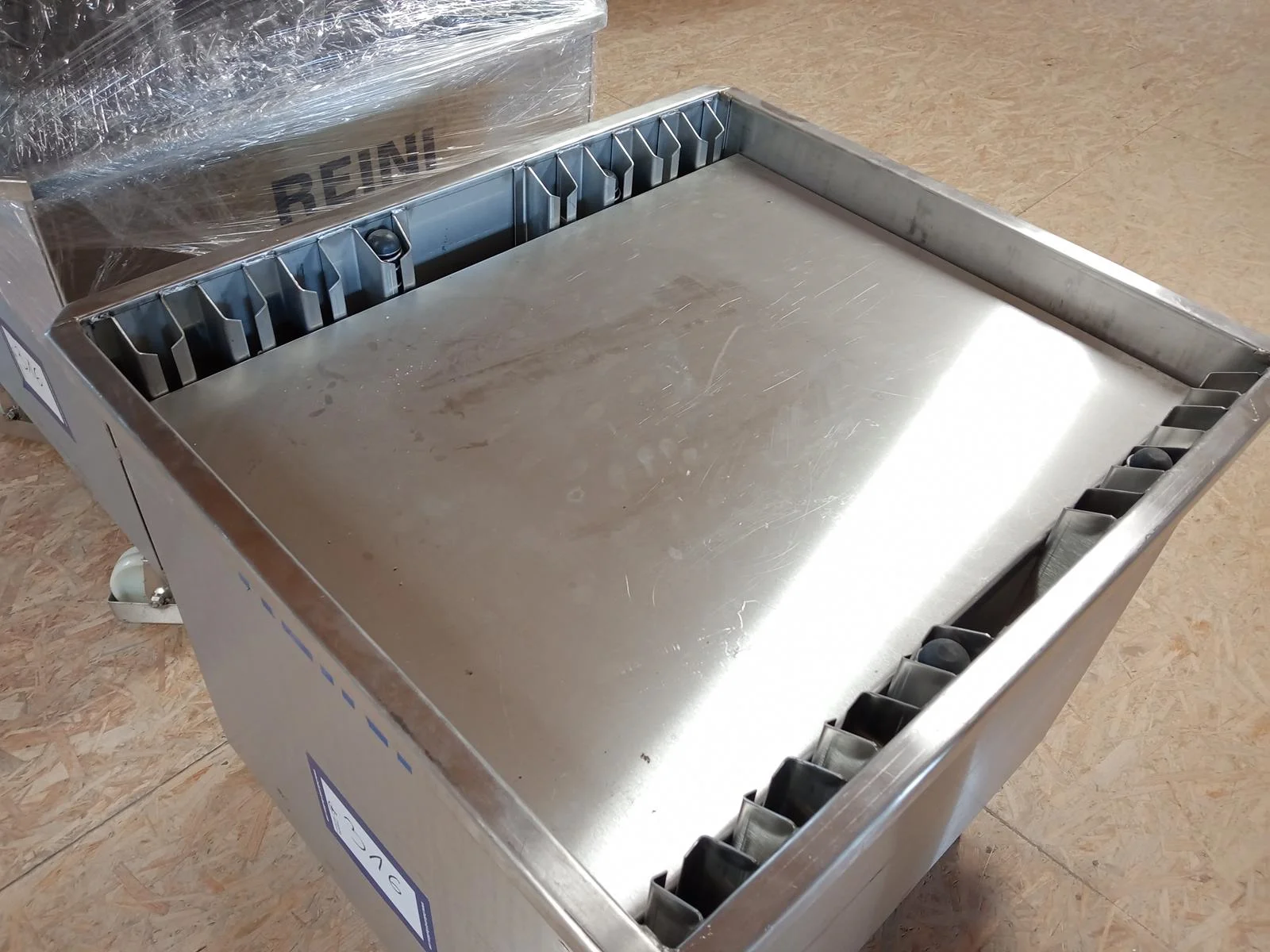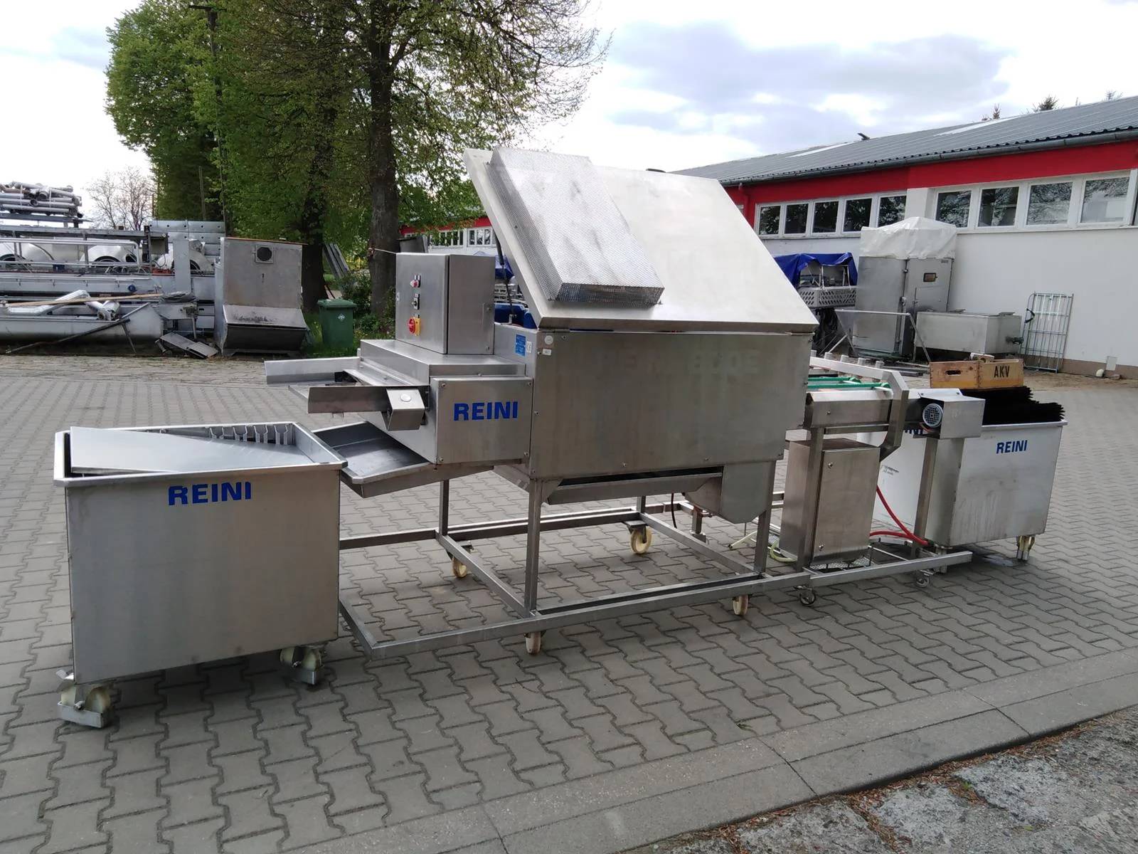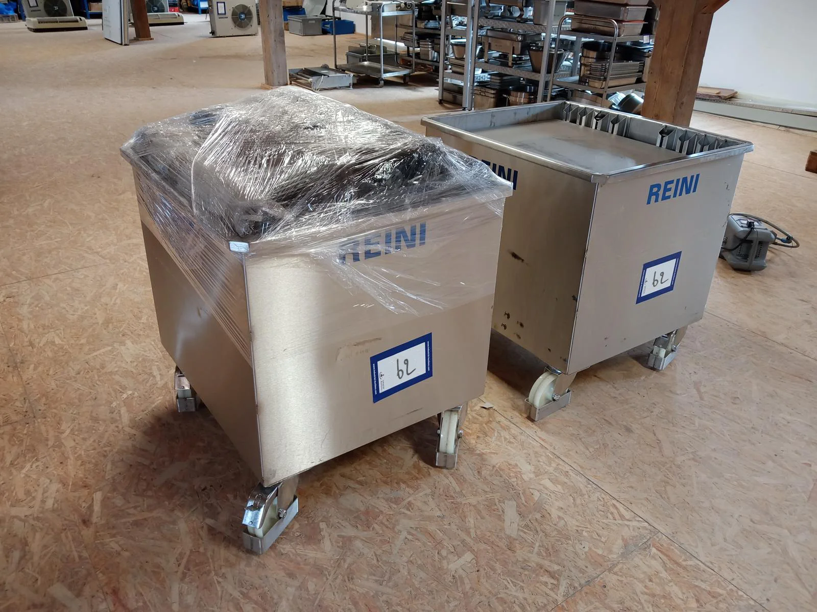 Reini mobile tray cleaning machine with oiling station, type: 800 E, number: 0398479, 380 V, 50 Hz, dimensions: 4000 mm x 1000 mm x 1700 mm. Including 2 s/s mobile tubs with spare parts.