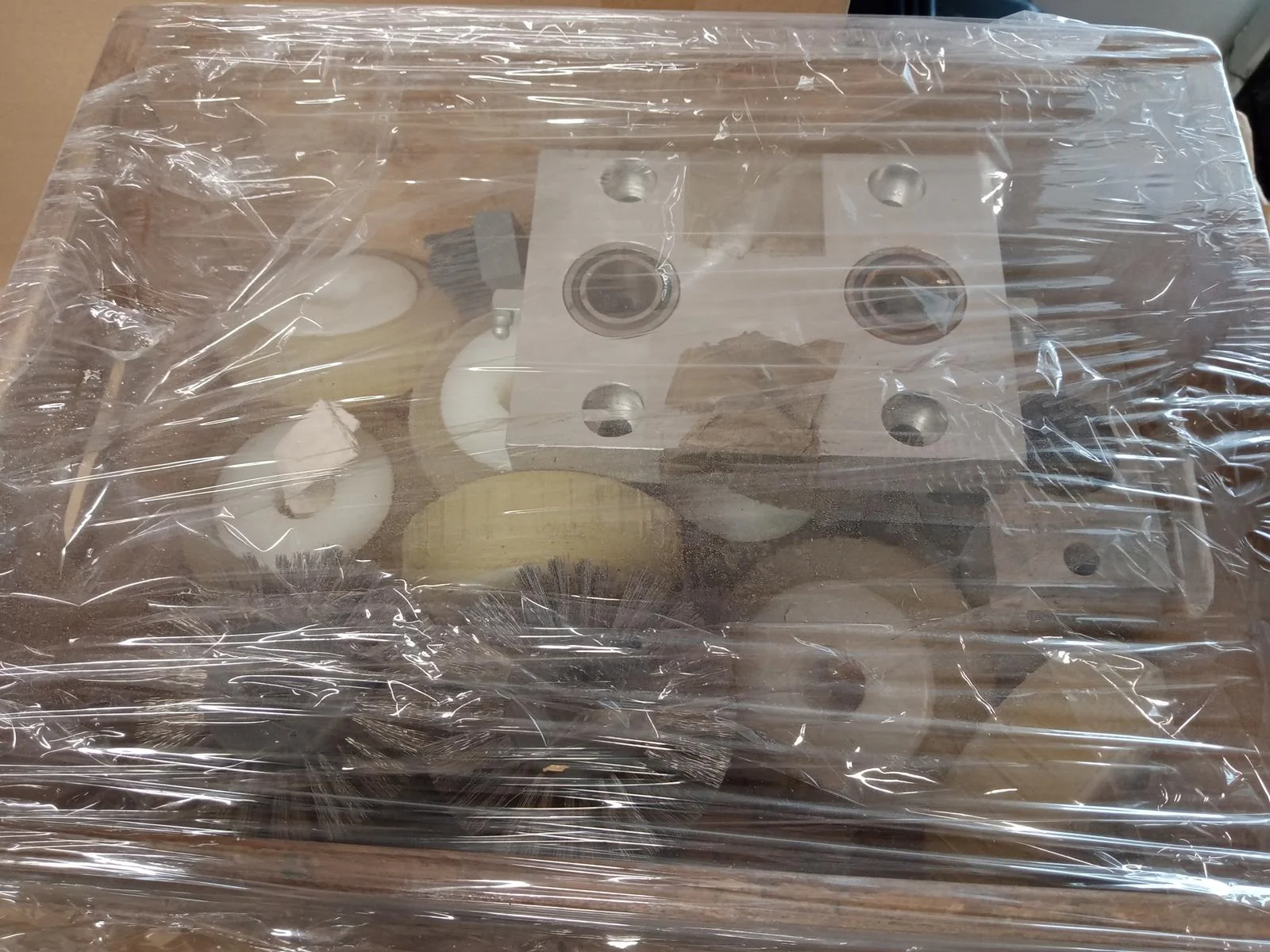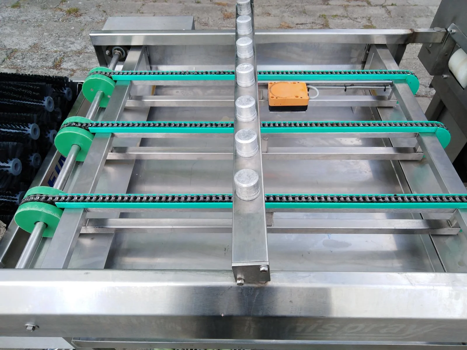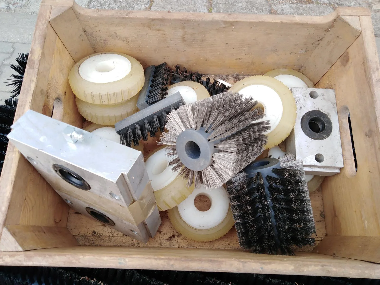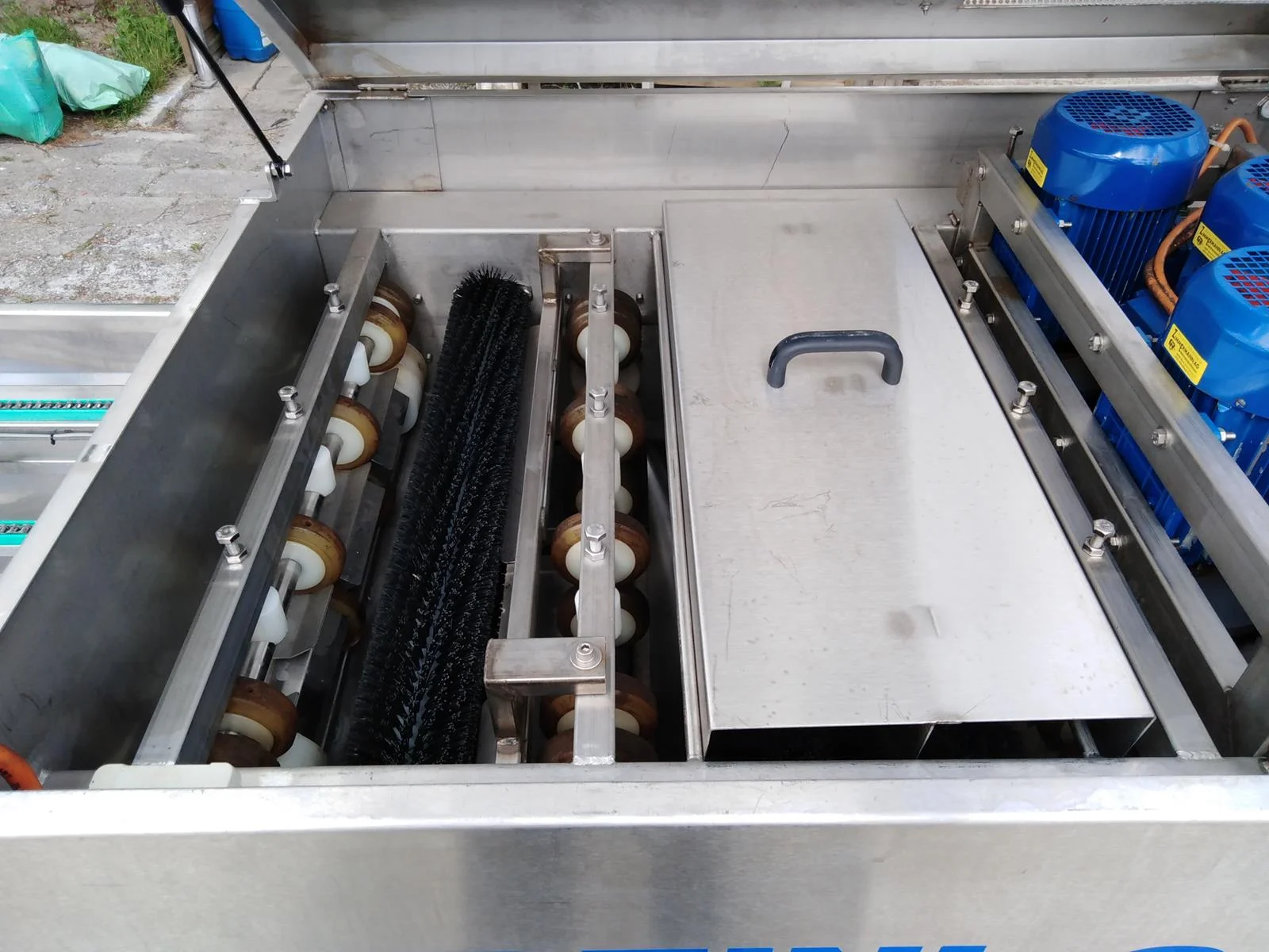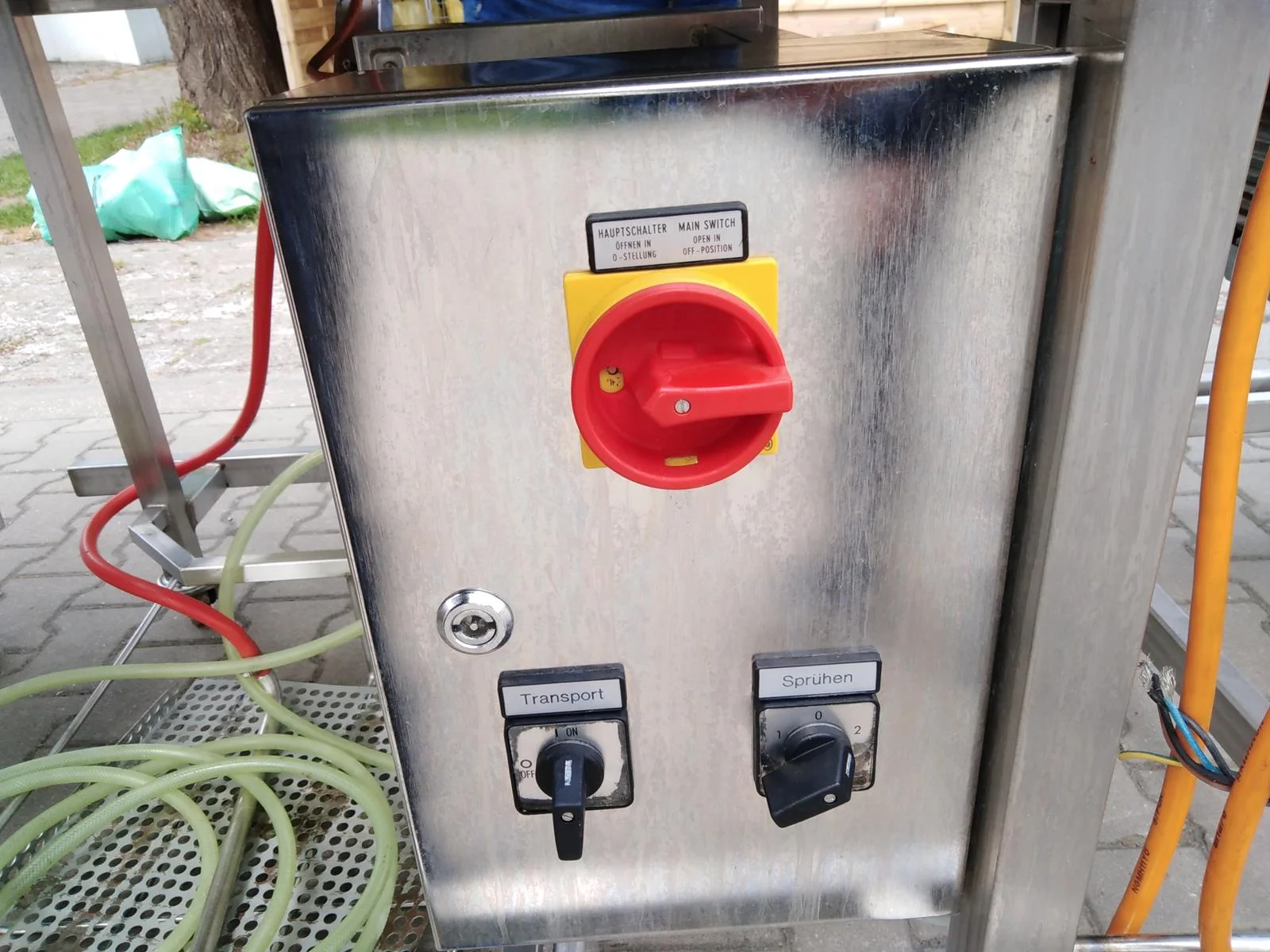 Reini mobile tray cleaning machine with oiling station, type: 800 E, number: 0398479, 380 V, 50 Hz, dimensions: 4000 mm x 1000 mm x 1700 mm. Including 2 s/s mobile tubs with spare parts.