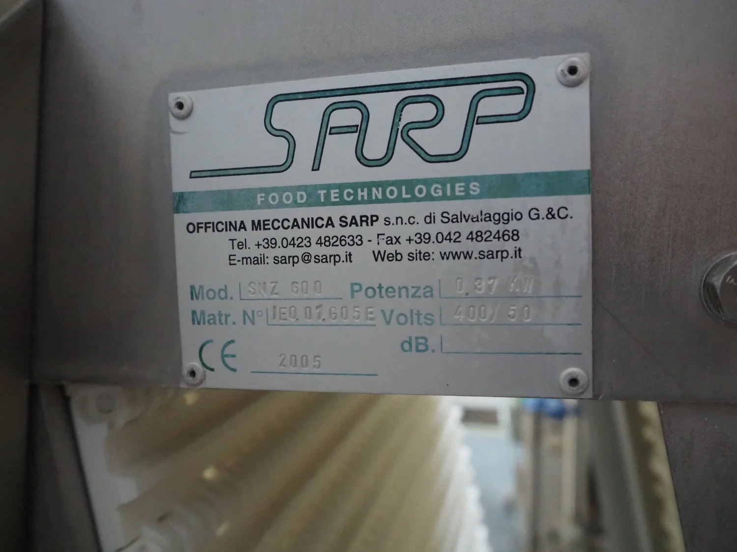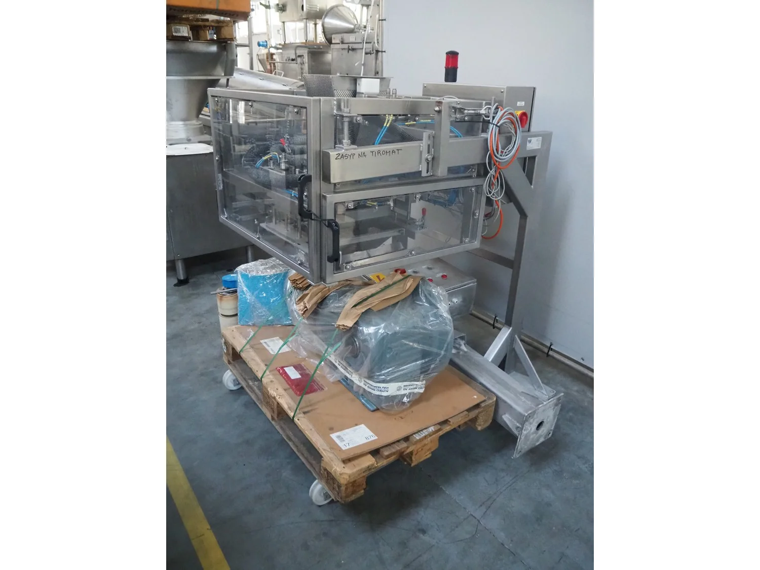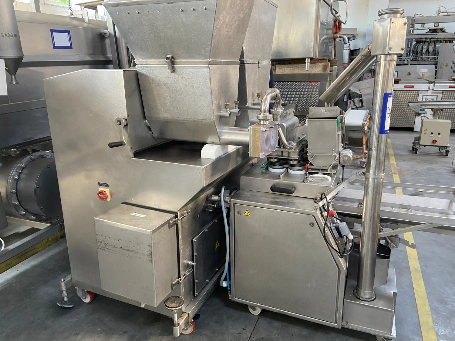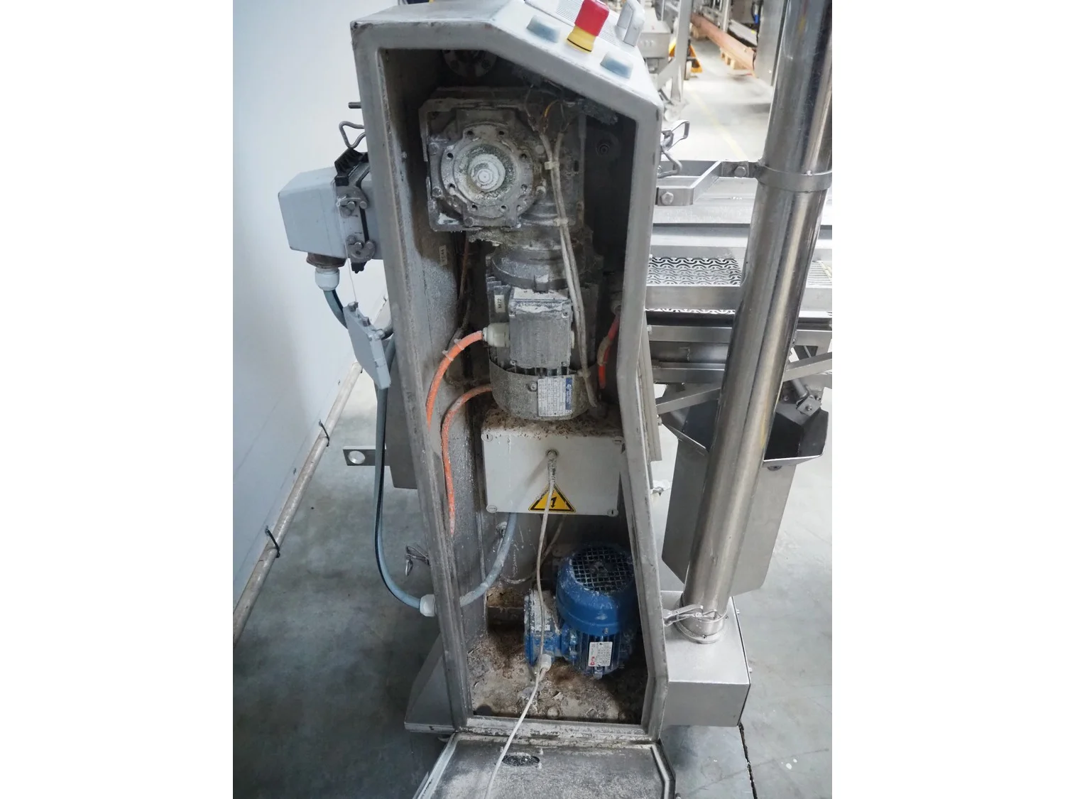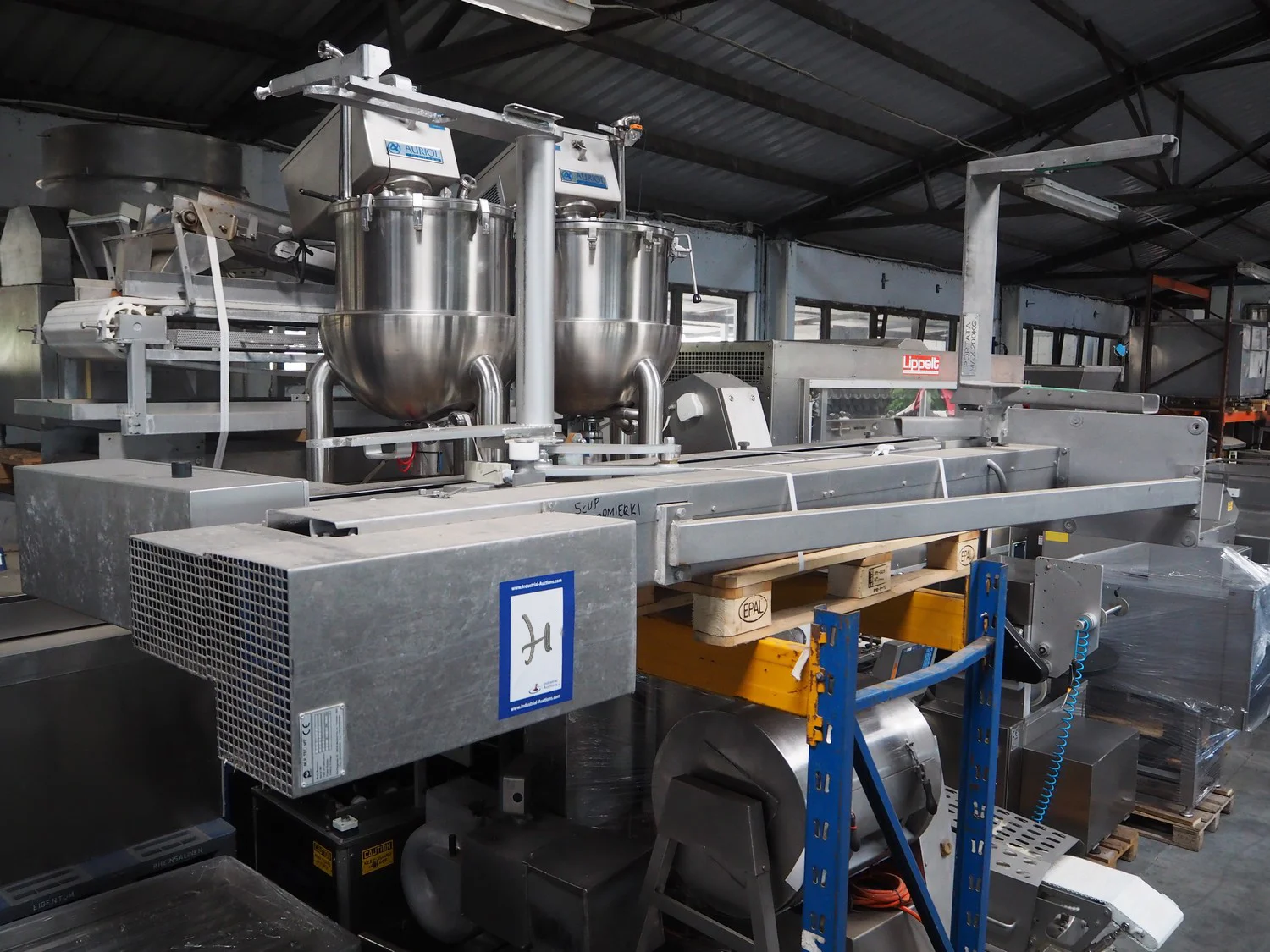 Complete gnocchi line consisting of: Glass mixer, type: VSM/F 600, machine number: 2612, year of construction: 2002, 400 V, 50 Hz, 20.96 A, 9,95 kW, volume 600 liter, dimensions: 2450 mm x 1650 mm x 2000 mm; M.P. TEC. srl lifter for 200 liter meat bins, model: MCL 200, serial number: 22070072, year of construction: 2007, 400 V, 3 Ph, 50 Hz, capacity: 200 kg, lifting height: 2250 mm, total dimensions: 1150 mm x 810 mm x 3020 mm; Sandore gnocchi forming and filling machine, model NF 100 C, serial number: 2376, year of construction: 2007, 400 V, 3 Ph, 8500 W, dimensions: 1450 mm x 1250 mm x 2030 mm, with outfeed machine for stuffed gnocchi, dimensions 900 mm x 1340 mm x 1720 mm, and outfeed machine for normal gnocchi, 870 mm x 1450 mm x 2030 mm; SARP elevating belt, model: SNZ 600, serial number: IE0.01.G05E, year of construction: 2005, 400 V, 50 Hz, 0.37 kW, plastic belt and dividers, belt width: 480 mm, distance between dividers: 75 mm, divider height: 60 mm, elevating height: 2000 mm, total dimensions: 800 mm x 1350 mm x 2150 mm; SARP vibrating tunnel, model: STR4107, serial number: JG0.01.G05E, year of construction: 2005, 400 V, 50 Hz, 4,7 kW, 7 levels, gutter width: 980 mm, infeed height: 1880 mm , outfeed height: 900 mm, total dimensions: 1900 mm x 5000 mm x 2550 mm; SARP waste and water separator filter, model: FILTRO, serial number: 06122, year of construction: 2006, 400 V, 50 Hz, 2.2 kW, dimensions: 1350 mm x 1250 mm x 3800 mm; Hastamat 10 head multihead weigher, type: CP 2.10/10, machine number: 7110287, year of construction: 1997, 230/400 V, 50 Hz, 1.5 kW, dimensions: 1370 mm x 1370 mm x 1500 mm; Mobile depositor for Tiromat thermoformer, dimensions: 1500 mm x 1250 mm x 1770 mm; Tiromat thermoformer, type: Tiromat Compact M280 2.00, serial number: 788.106.1279, 400 V, 3 Ph, 50 Hz, 23.58 kW, foil width: bottom 280 mm and top 270 mm, dye: 190 mm x 240 mm, Tiromat labeller, type: BL-150, machine number: ETI-422N, total dimensions: 7100 mm x 1000 mm x 2050 mm; Transport belt, s/s frame, plastic belt, belt width: 250 mm, total dimensions: 1500 mm x 500 mm x 750 mm; BeltTrans spiral transport belt, s/s frame, plastic mesh belt, belt width: 300 mm, total dimensions: 2000 mm x 2600 mm x 2300 mm.