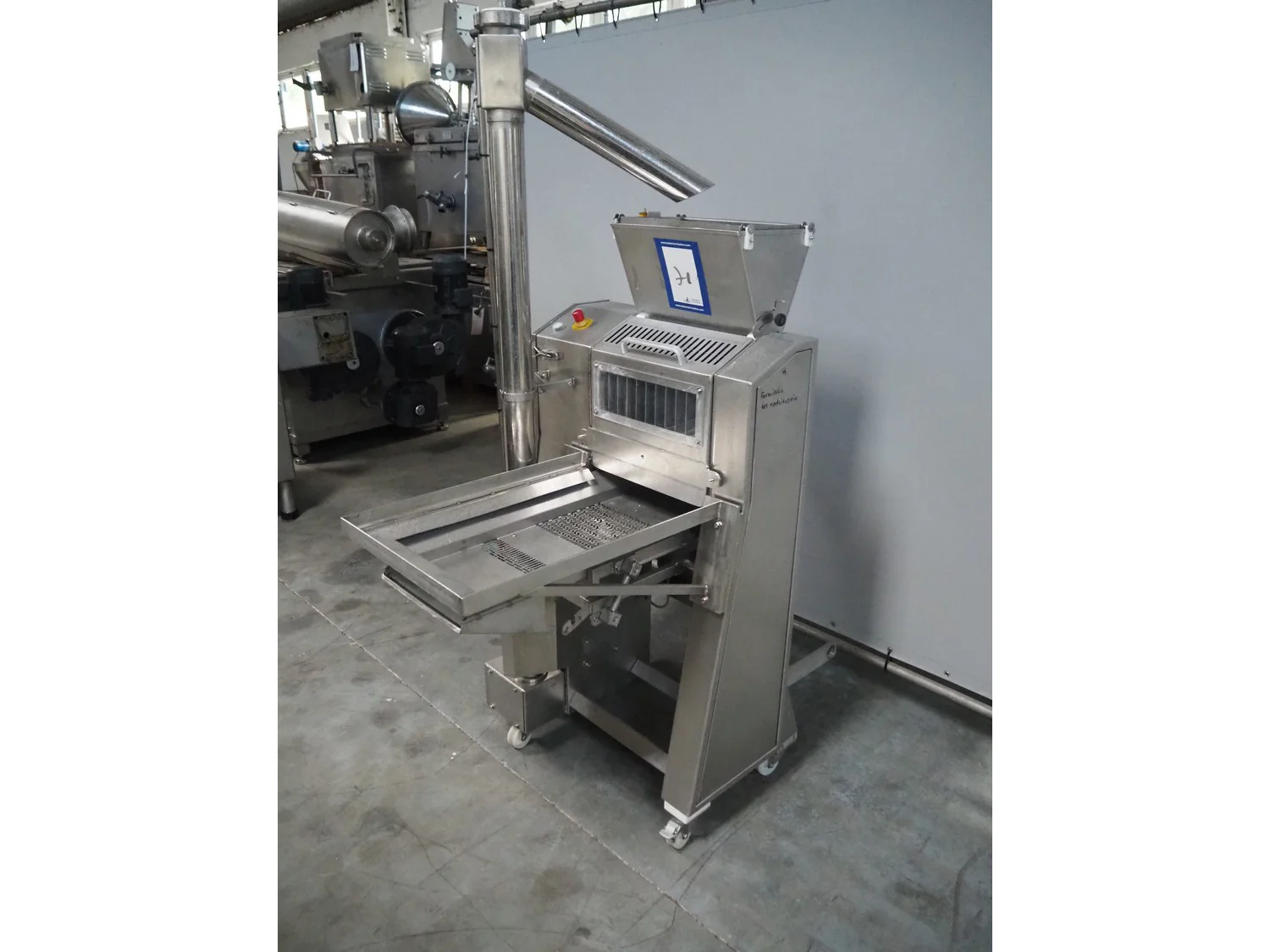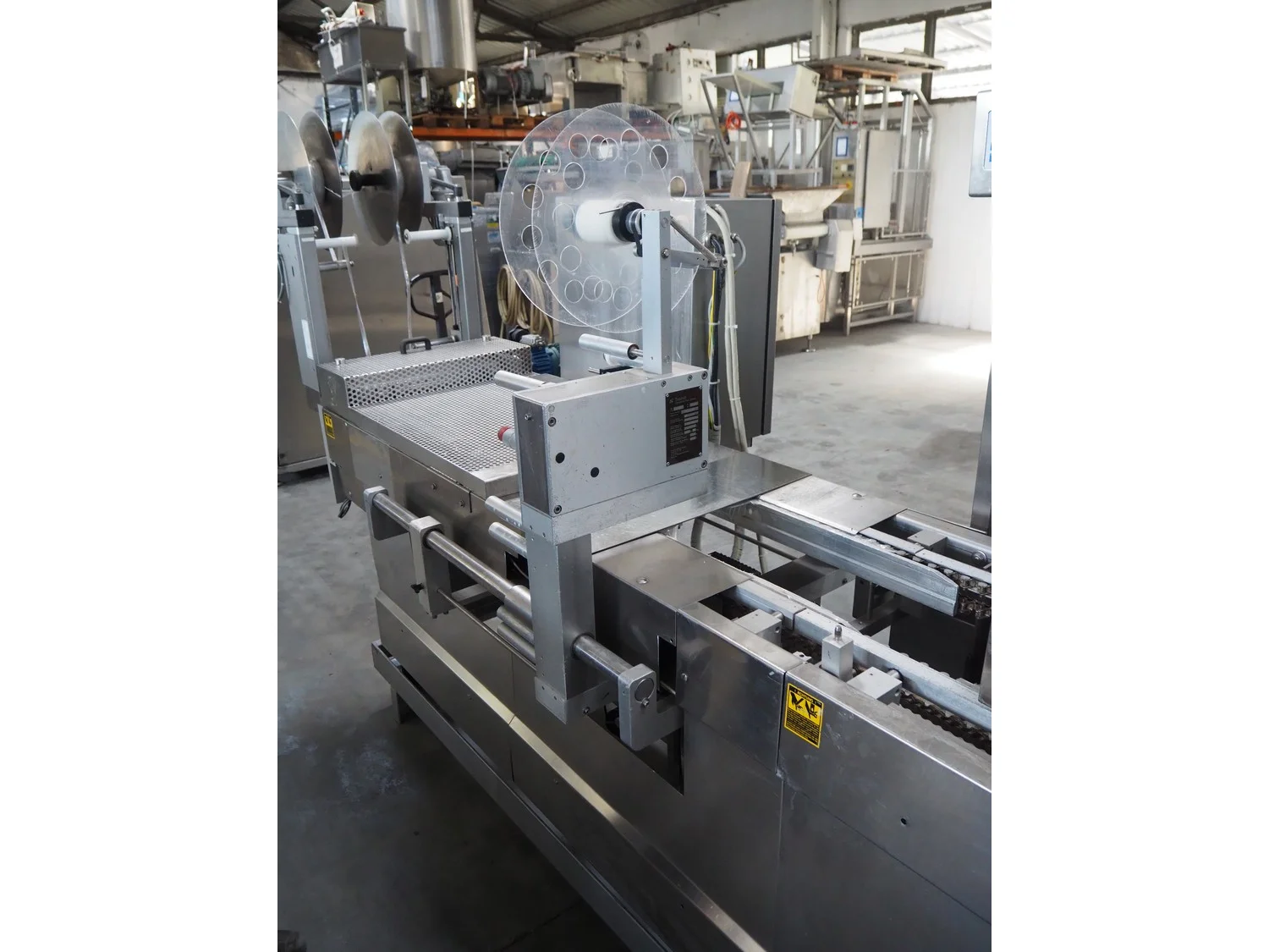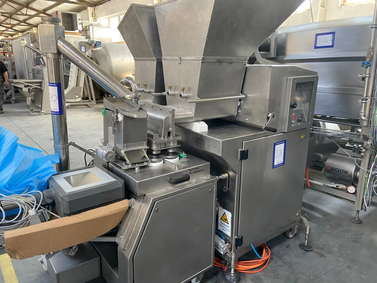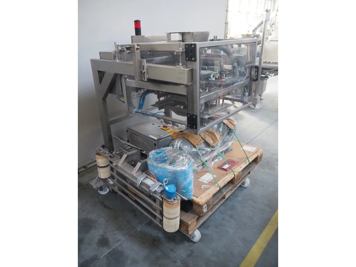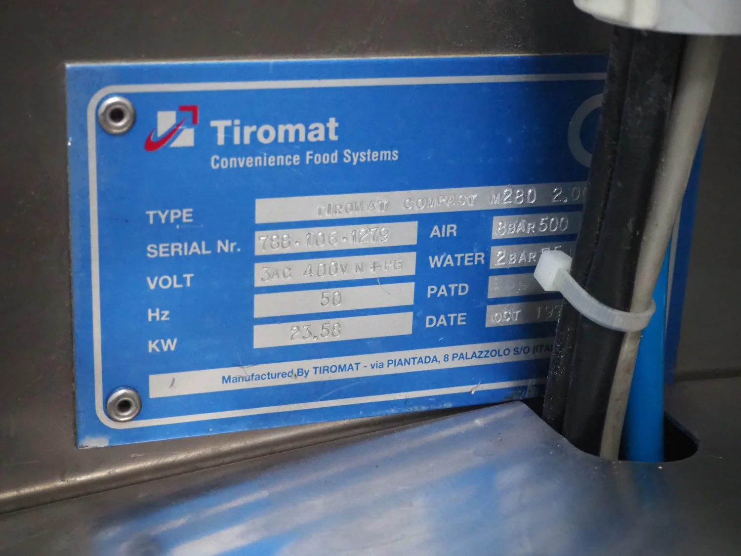 Complete gnocchi line consisting of: Glass mixer, type: VSM/F 600, machine number: 2612, year of construction: 2002, 400 V, 50 Hz, 20.96 A, 9,95 kW, volume 600 liter, dimensions: 2450 mm x 1650 mm x 2000 mm; M.P. TEC. srl lifter for 200 liter meat bins, model: MCL 200, serial number: 22070072, year of construction: 2007, 400 V, 3 Ph, 50 Hz, capacity: 200 kg, lifting height: 2250 mm, total dimensions: 1150 mm x 810 mm x 3020 mm; Sandore gnocchi forming and filling machine, model NF 100 C, serial number: 2376, year of construction: 2007, 400 V, 3 Ph, 8500 W, dimensions: 1450 mm x 1250 mm x 2030 mm, with outfeed machine for stuffed gnocchi, dimensions 900 mm x 1340 mm x 1720 mm, and outfeed machine for normal gnocchi, 870 mm x 1450 mm x 2030 mm; SARP elevating belt, model: SNZ 600, serial number: IE0.01.G05E, year of construction: 2005, 400 V, 50 Hz, 0.37 kW, plastic belt and dividers, belt width: 480 mm, distance between dividers: 75 mm, divider height: 60 mm, elevating height: 2000 mm, total dimensions: 800 mm x 1350 mm x 2150 mm; SARP vibrating tunnel, model: STR4107, serial number: JG0.01.G05E, year of construction: 2005, 400 V, 50 Hz, 4,7 kW, 7 levels, gutter width: 980 mm, infeed height: 1880 mm , outfeed height: 900 mm, total dimensions: 1900 mm x 5000 mm x 2550 mm; SARP waste and water separator filter, model: FILTRO, serial number: 06122, year of construction: 2006, 400 V, 50 Hz, 2.2 kW, dimensions: 1350 mm x 1250 mm x 3800 mm; Hastamat 10 head multihead weigher, type: CP 2.10/10, machine number: 7110287, year of construction: 1997, 230/400 V, 50 Hz, 1.5 kW, dimensions: 1370 mm x 1370 mm x 1500 mm; Mobile depositor for Tiromat thermoformer, dimensions: 1500 mm x 1250 mm x 1770 mm; Tiromat thermoformer, type: Tiromat Compact M280 2.00, serial number: 788.106.1279, 400 V, 3 Ph, 50 Hz, 23.58 kW, foil width: bottom 280 mm and top 270 mm, dye: 190 mm x 240 mm, Tiromat labeller, type: BL-150, machine number: ETI-422N, total dimensions: 7100 mm x 1000 mm x 2050 mm; Transport belt, s/s frame, plastic belt, belt width: 250 mm, total dimensions: 1500 mm x 500 mm x 750 mm; BeltTrans spiral transport belt, s/s frame, plastic mesh belt, belt width: 300 mm, total dimensions: 2000 mm x 2600 mm x 2300 mm.
