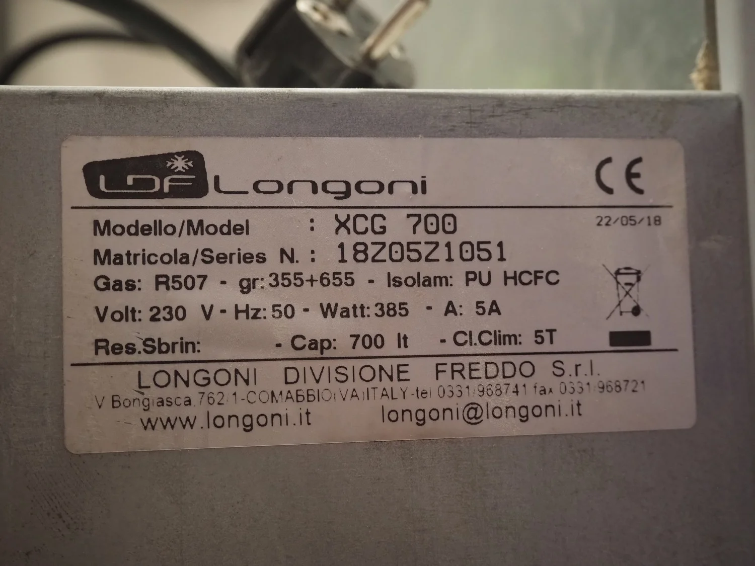 Longoni Divisione Freddo S.r.l. freezer, model: XCG 700, serial number: 18Z05Z1051, year of construction: 2018, 230 V, 50 Hz, 5 A, 385 W, refrigerant: R507/355+655 g, 5 floors plates, dimensions: (5x) 650 mm x 530 mm, total dimensions: 800 mm x 700 mm x 2020 mm.