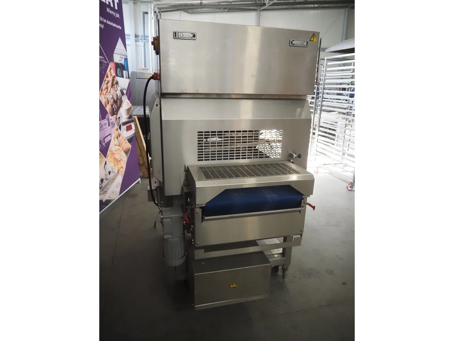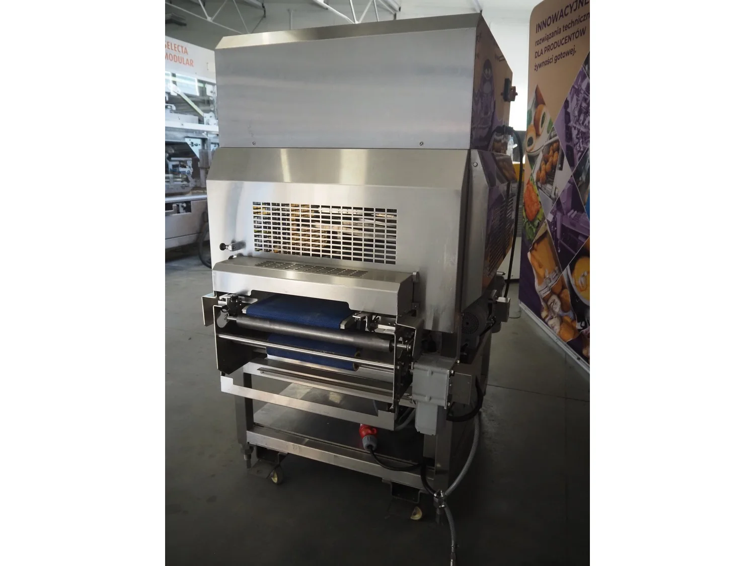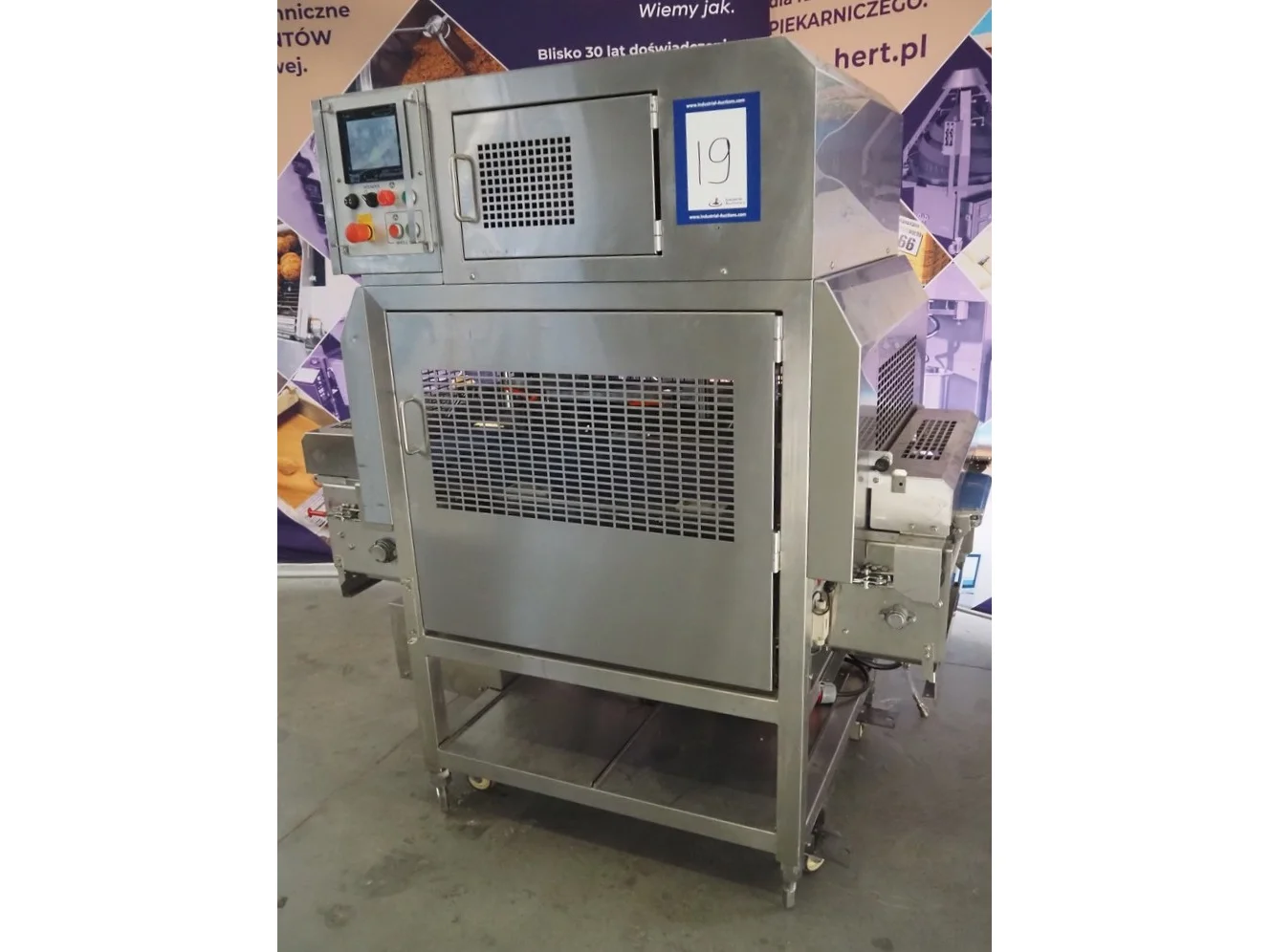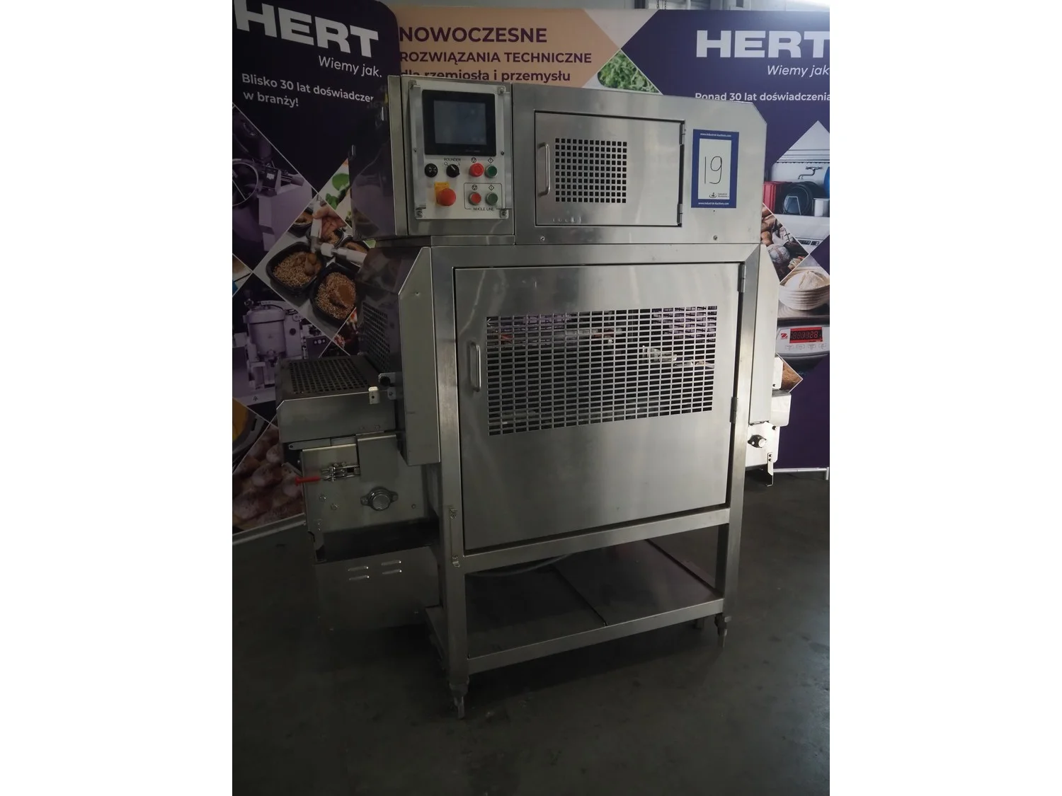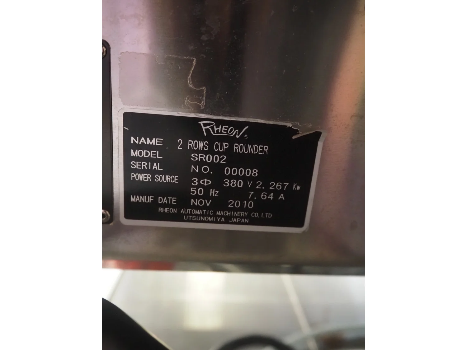 Rheon mobile 2 rows cup rounder, model: SR002, serial number: 00008, year of construction: 2010, 380 V, 3 Ph, 50 Hz, 7.64 A, 2267 W, plastic belt, belt width: 500 mm, 300 mm, clearance: 320 mm x 45 mm, dimensions dye: ø 85 mm, ø 155 mm, 175 mm x 175 mm, total dimensions: 1560 mm x 1020 mm x 1650 mm.