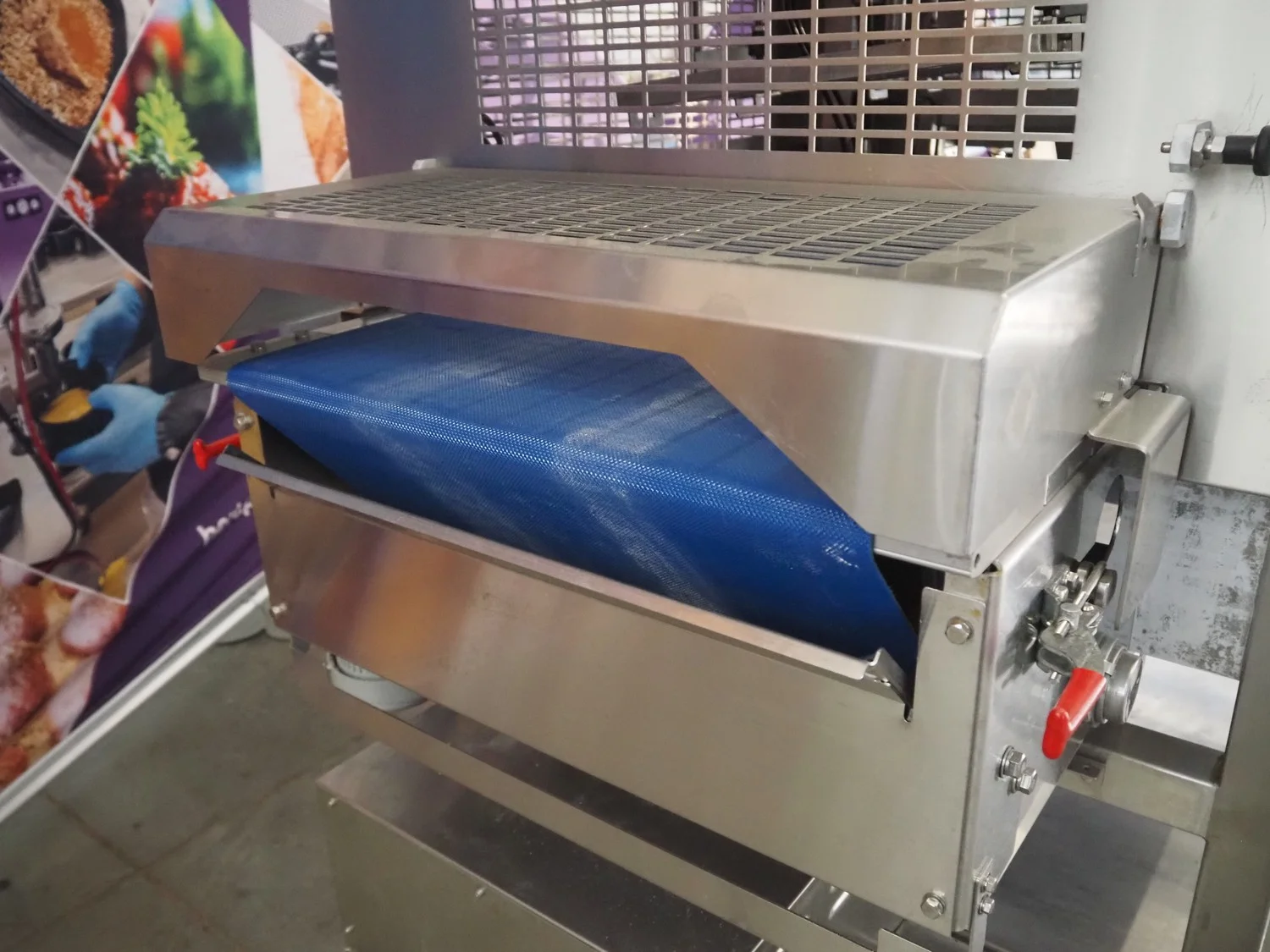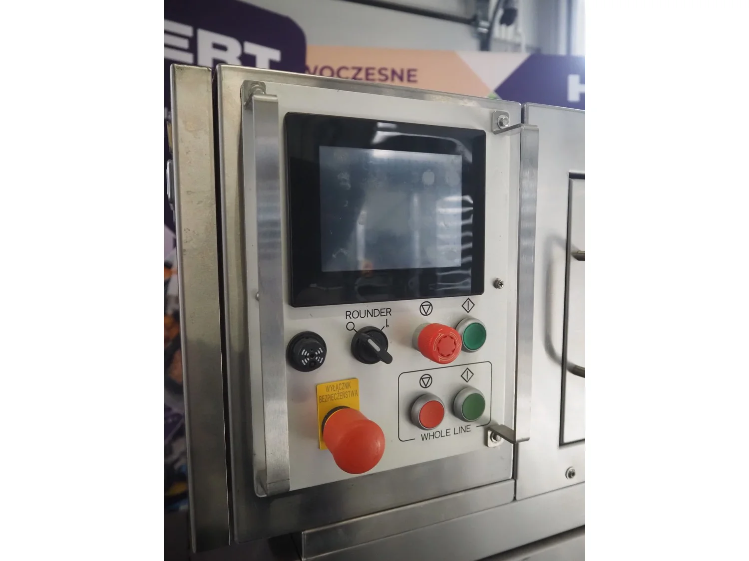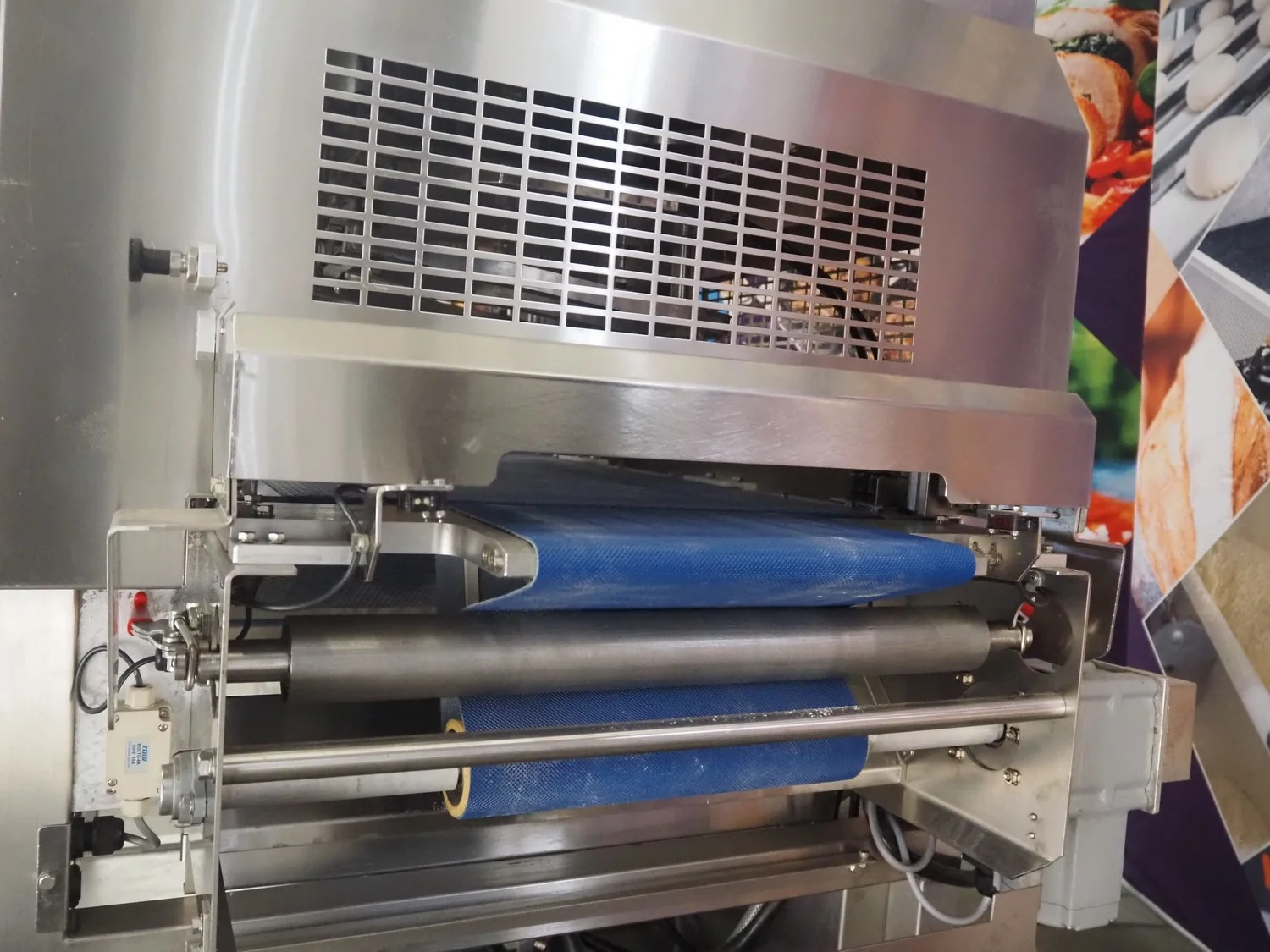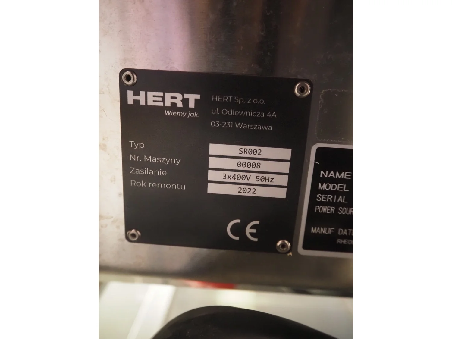 Rheon mobile 2 rows cup rounder, model: SR002, serial number: 00008, year of construction: 2010, 380 V, 3 Ph, 50 Hz, 7.64 A, 2267 W, plastic belt, belt width: 500 mm, 300 mm, clearance: 320 mm x 45 mm, dimensions dye: ø 85 mm, ø 155 mm, 175 mm x 175 mm, total dimensions: 1560 mm x 1020 mm x 1650 mm.