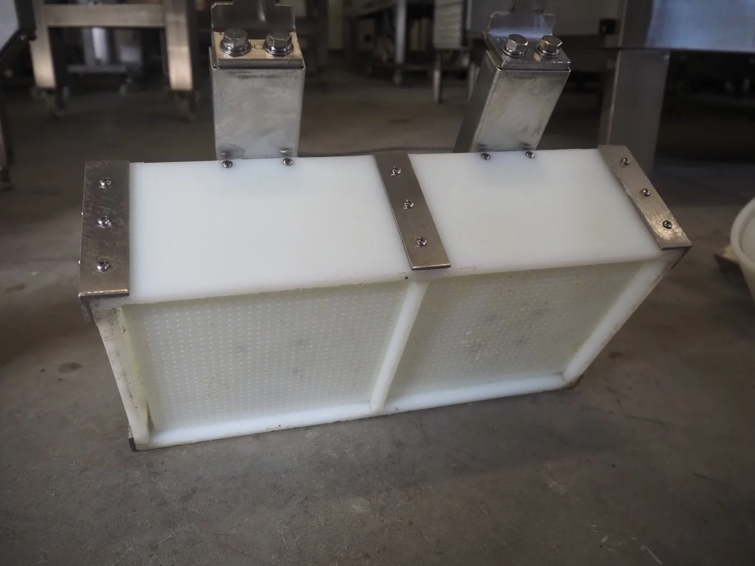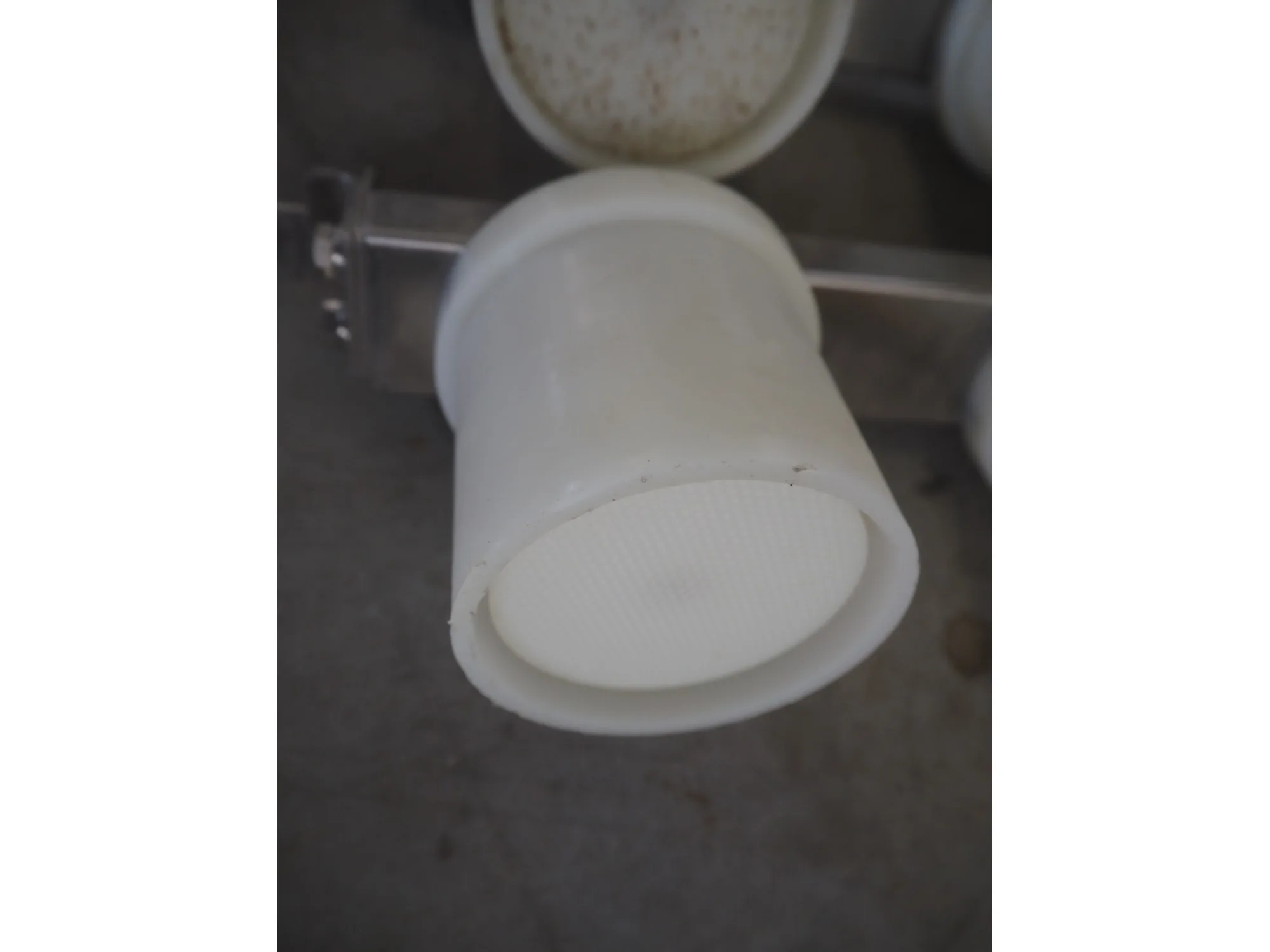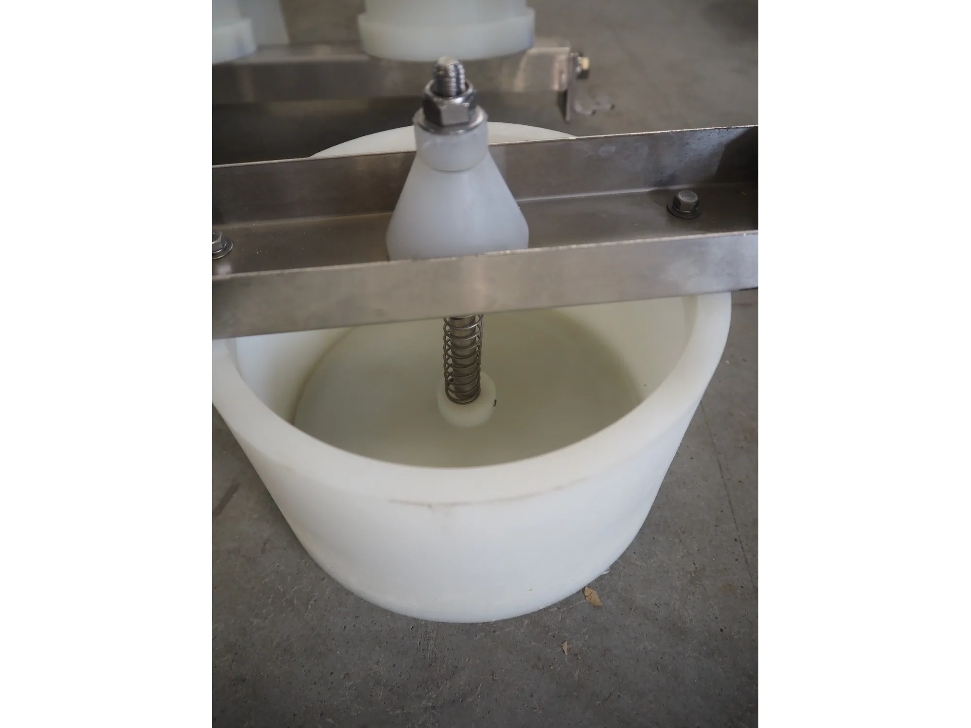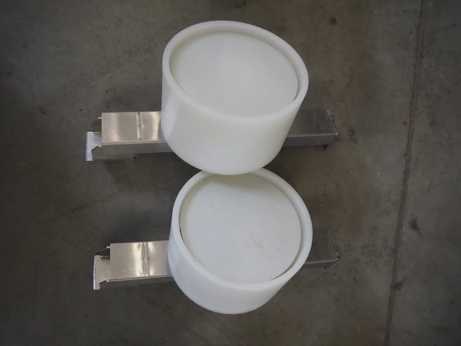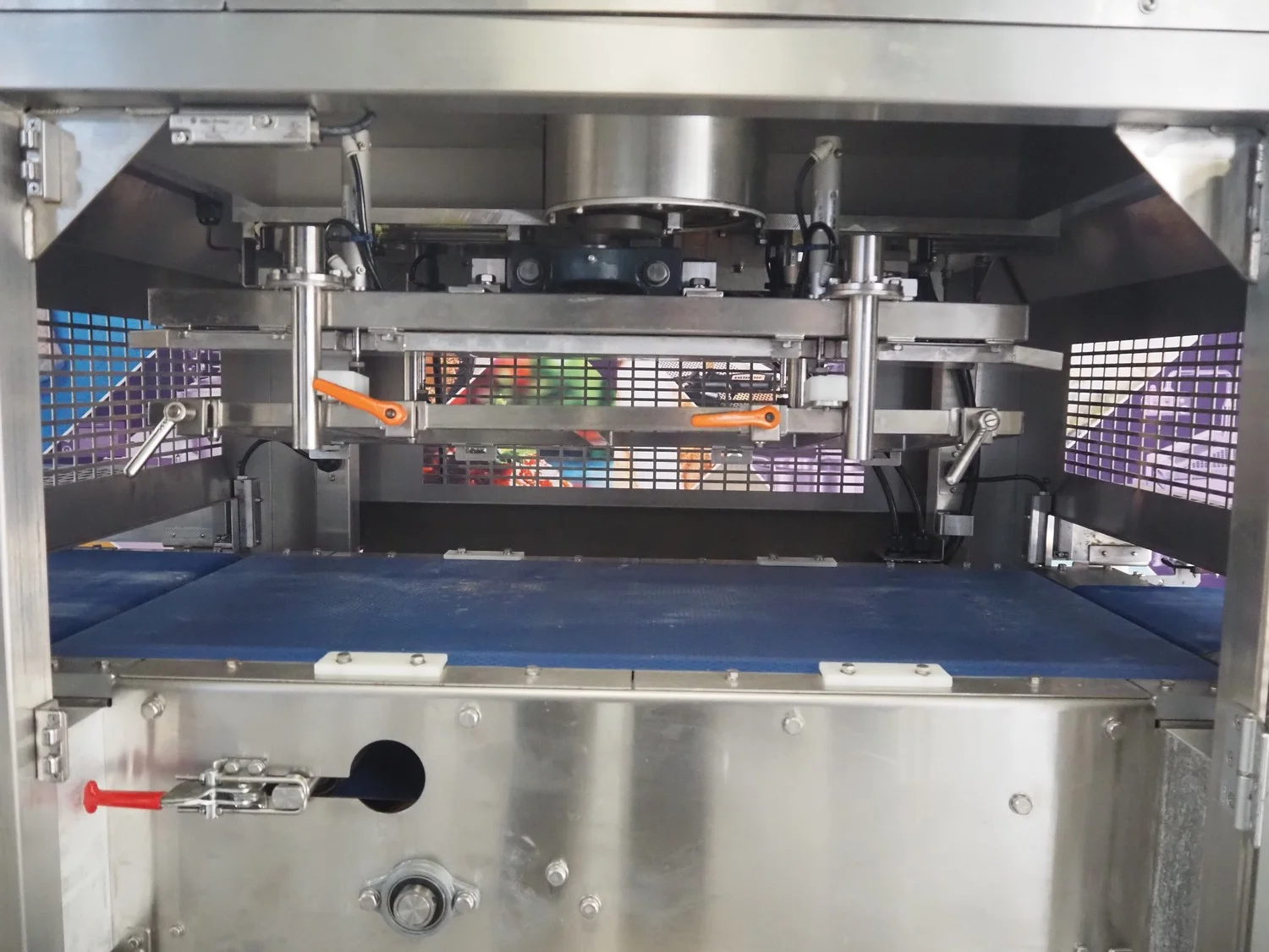 Rheon mobile 2 rows cup rounder, model: SR002, serial number: 00008, year of construction: 2010, 380 V, 3 Ph, 50 Hz, 7.64 A, 2267 W, plastic belt, belt width: 500 mm, 300 mm, clearance: 320 mm x 45 mm, dimensions dye: ø 85 mm, ø 155 mm, 175 mm x 175 mm, total dimensions: 1560 mm x 1020 mm x 1650 mm.