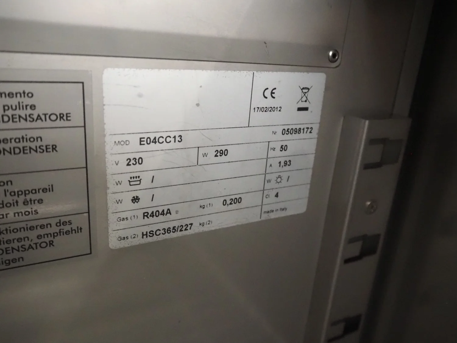 Mobile cooling cabinet, model: E04CC13, number: 05098172, year of construction: 2012, 230 V, 50 Hz, 290 W, refrigerant: R404a/0.200 kg, 3 doors, 6 plates, dimensions plates: 530 mm x 320 mm, dimensions: 1120 mm x 900 mm x 900 mm.
