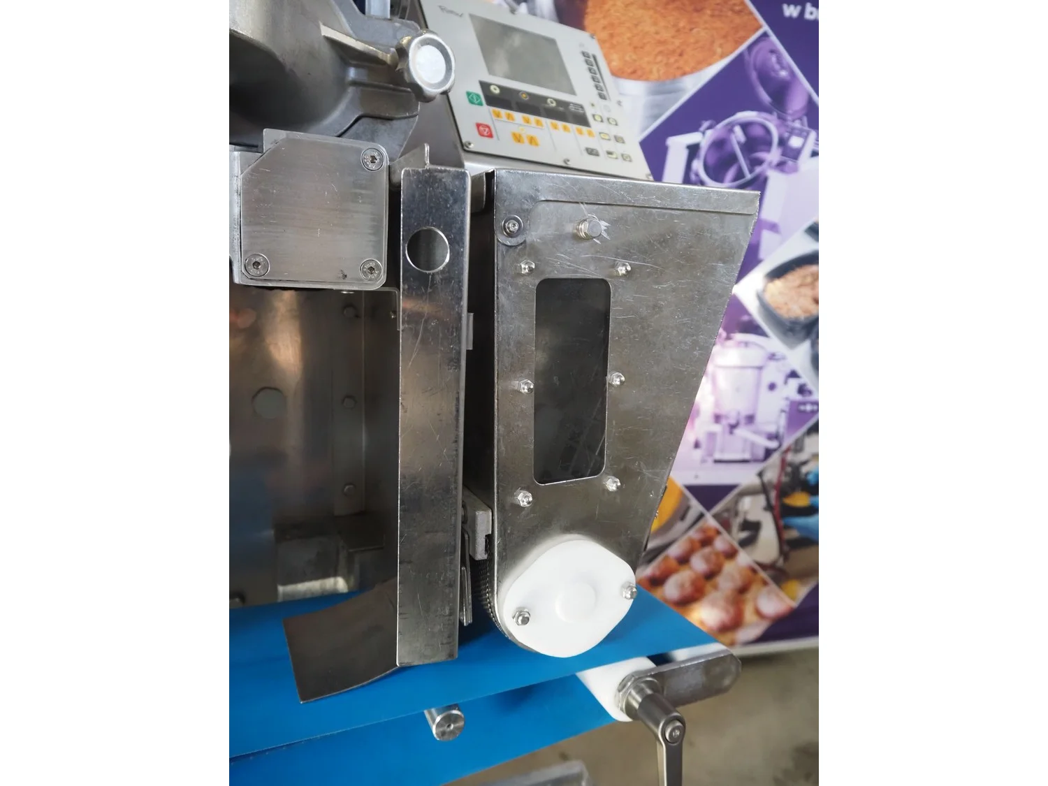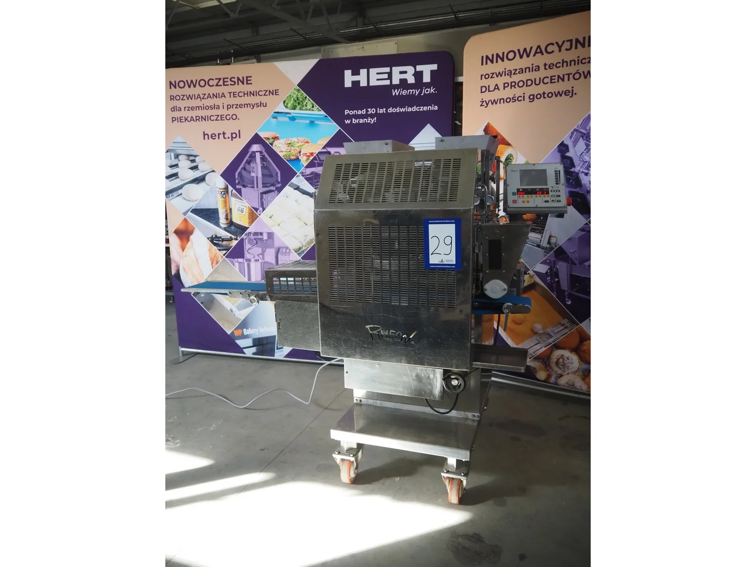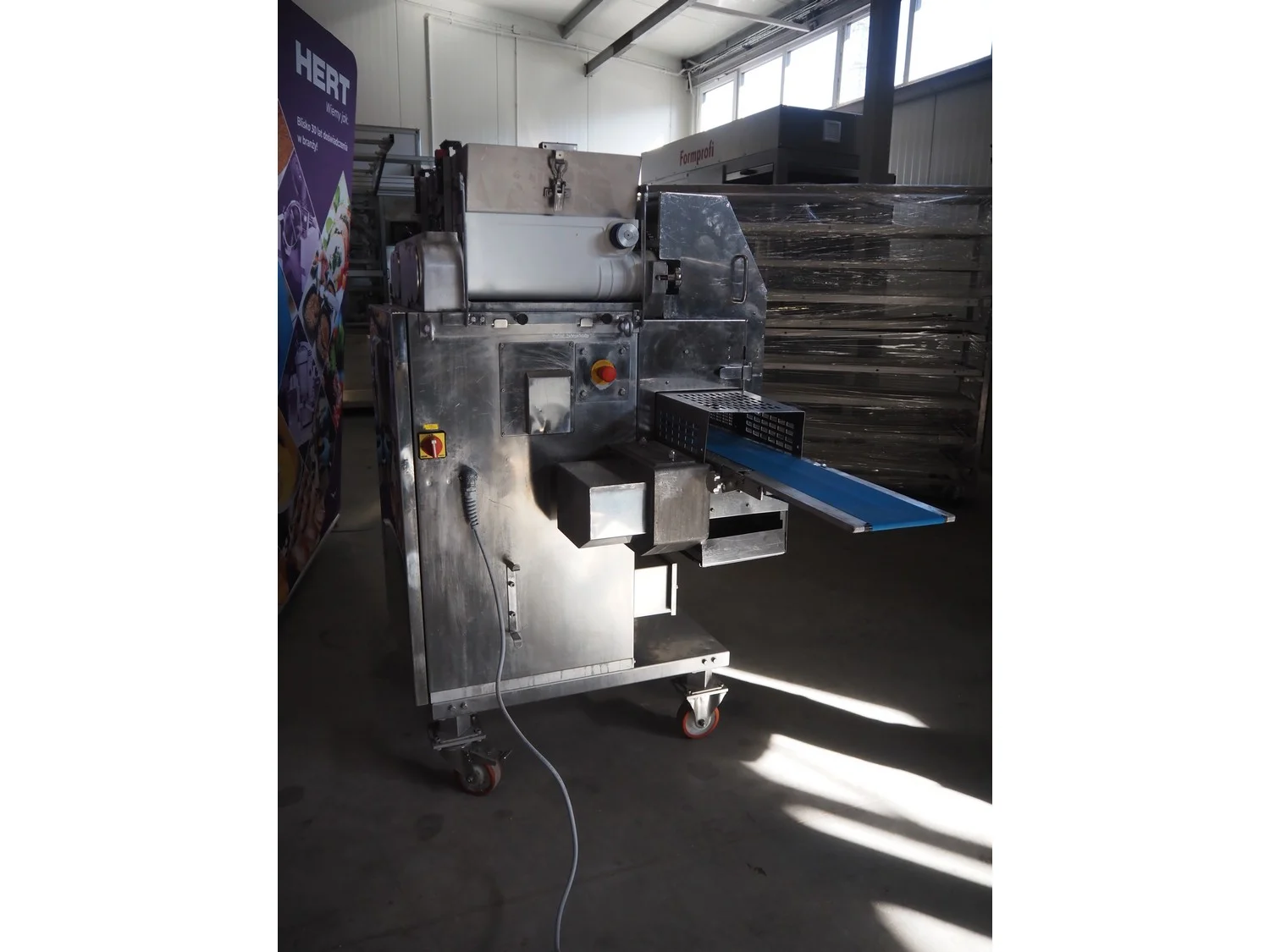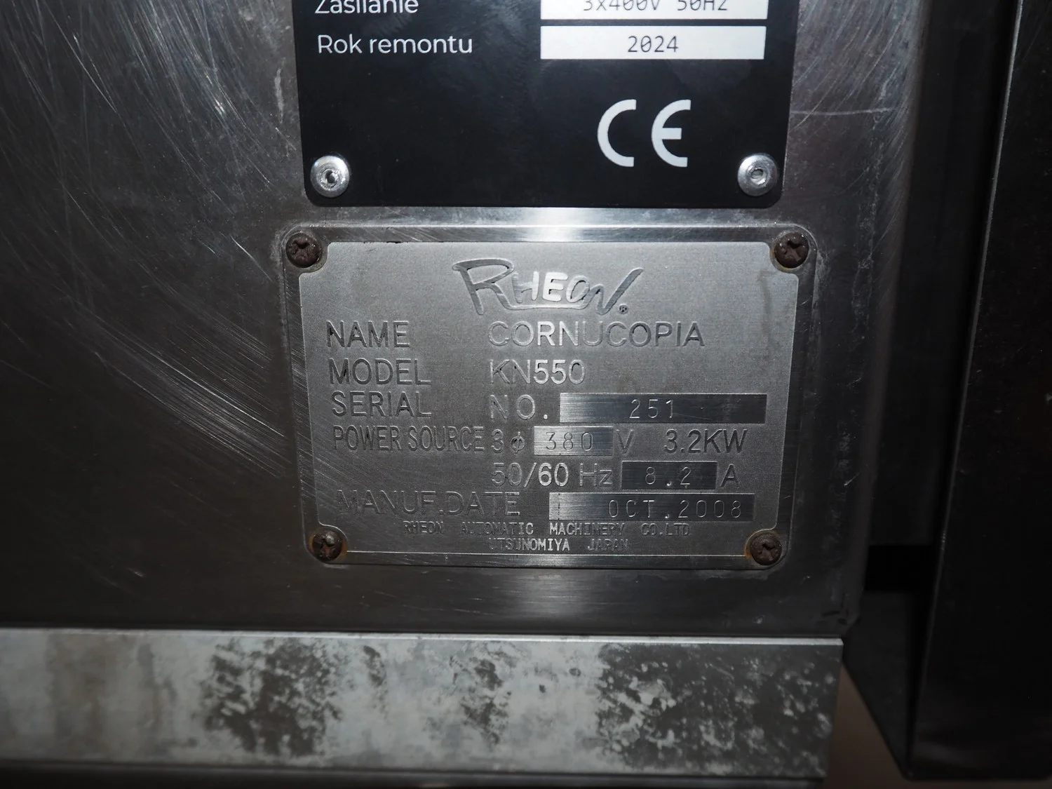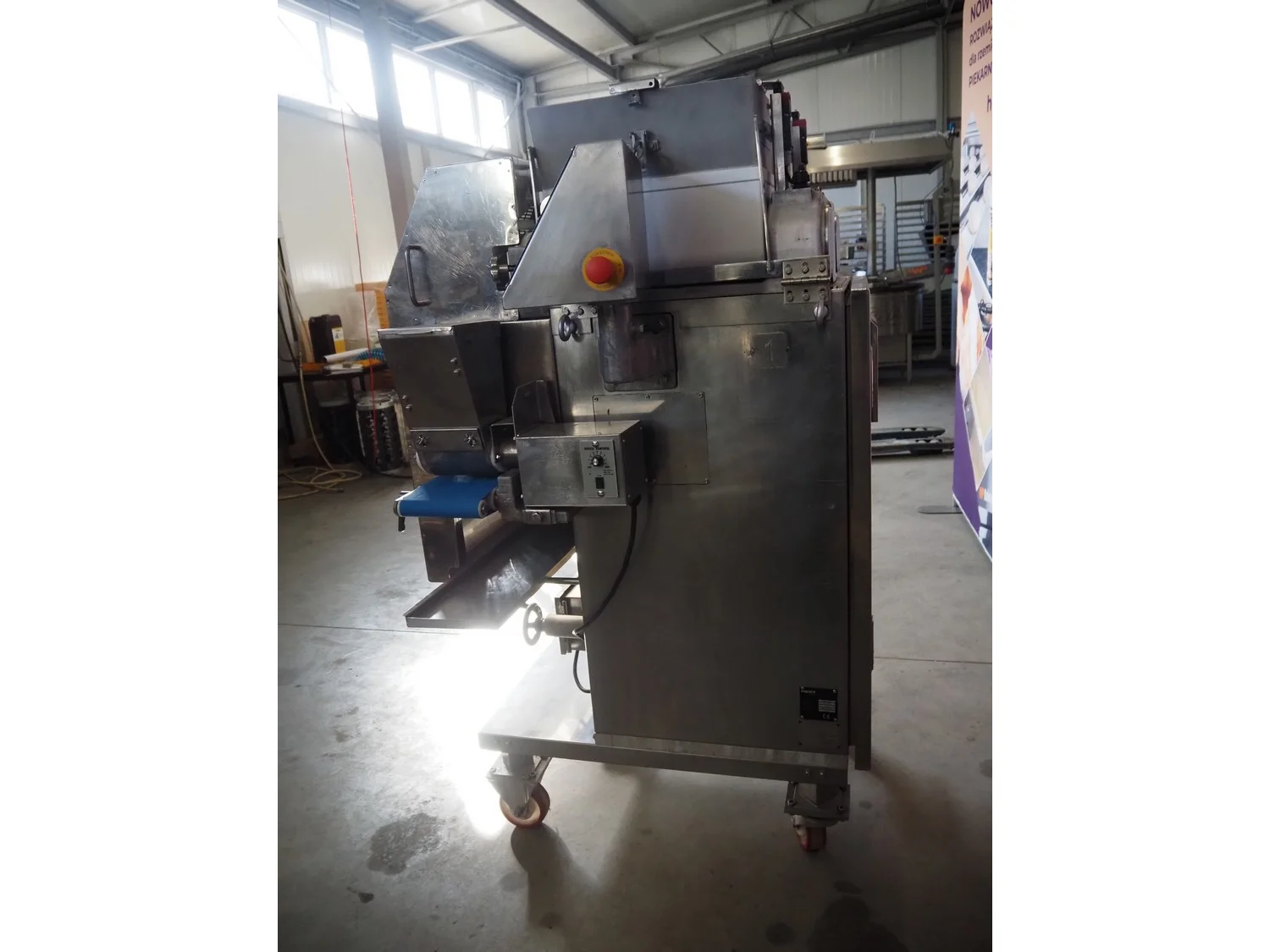Rheon mobile encrusting machine, name: Cornucopia, model: KN550, serial number: 251, year of construction: 2008, year of renovation: 2024, 380 V, 3 Ph, 50/60 Hz, 8.2 A, 3.2 kW, plastic belt, belt width: 160 mm, total dimensions: 1800 mm x 950 mm x 1600 mm.