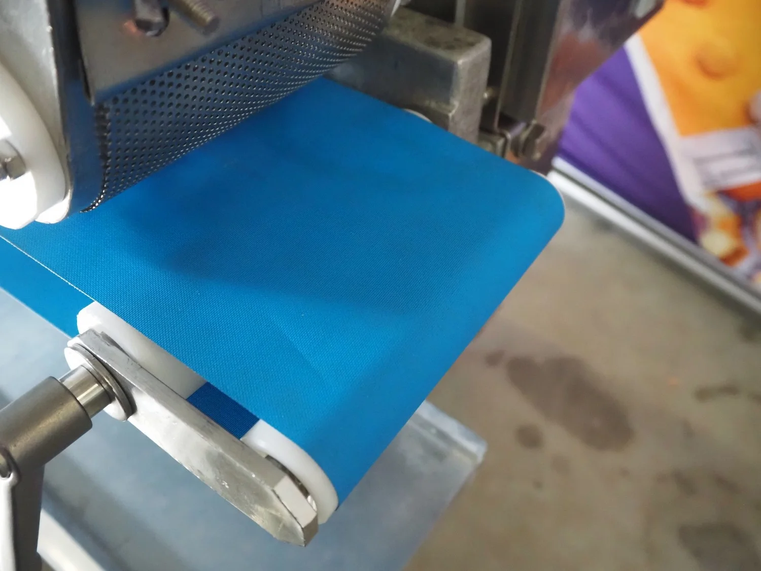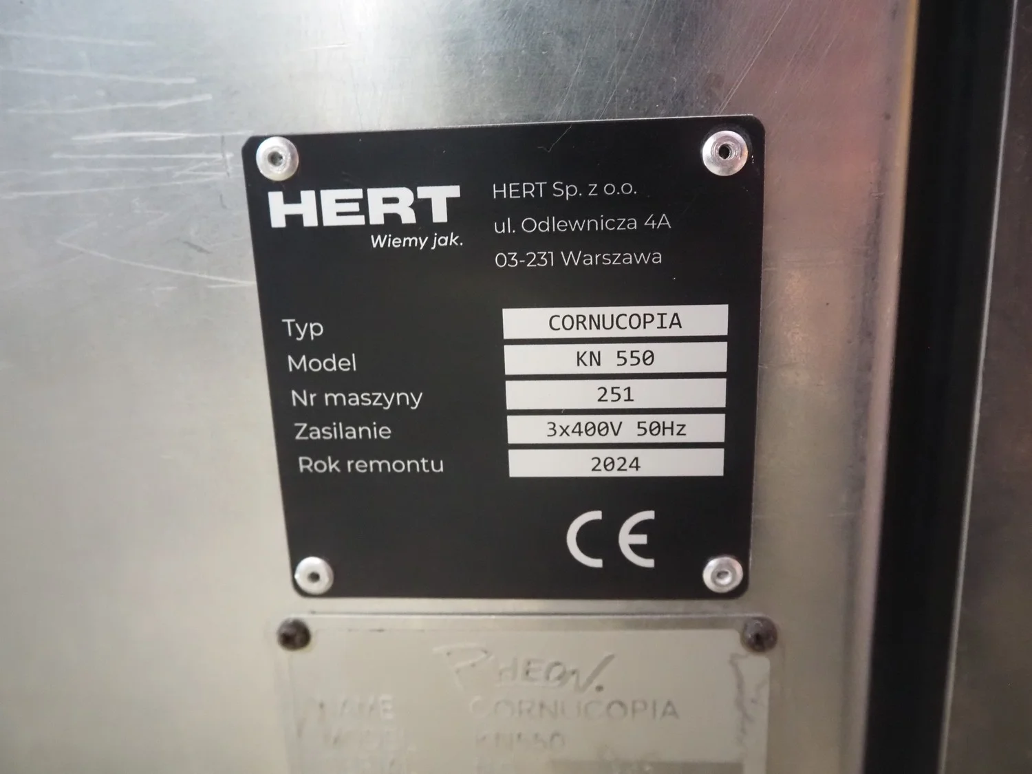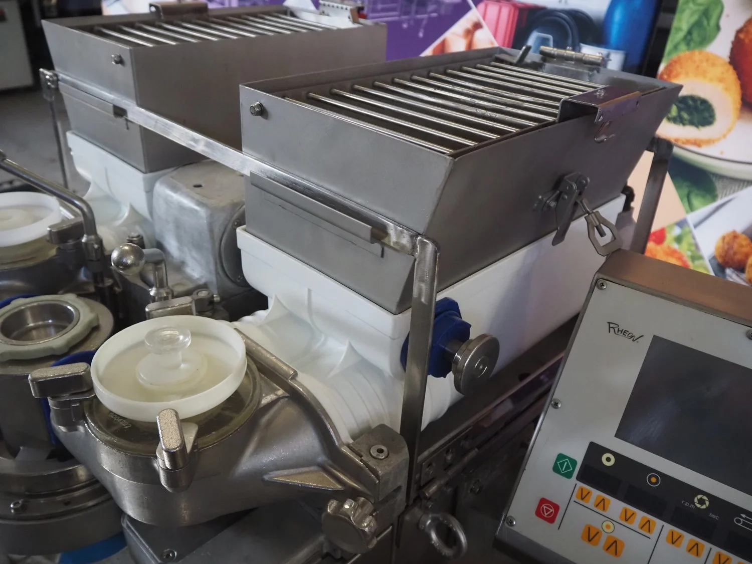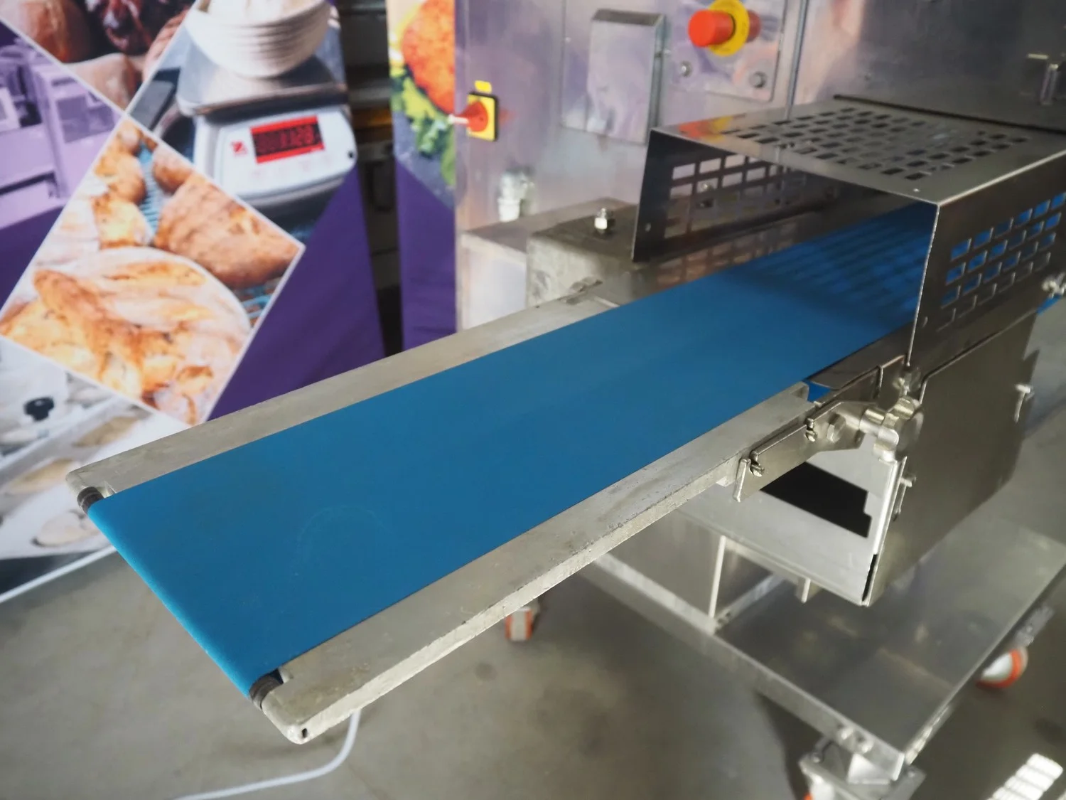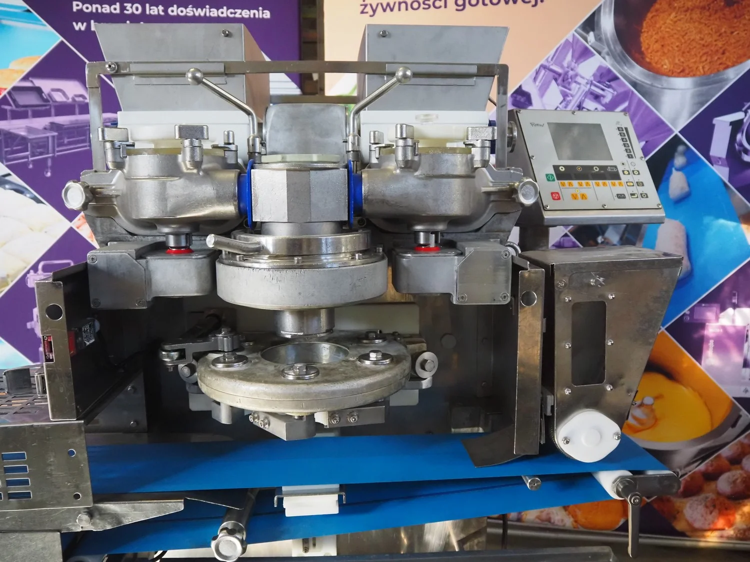 Rheon mobile encrusting machine, name: Cornucopia, model: KN550, serial number: 251, year of construction: 2008, year of renovation: 2024, 380 V, 3 Ph, 50/60 Hz, 8.2 A, 3.2 kW, plastic belt, belt width: 160 mm, total dimensions: 1800 mm x 950 mm x 1600 mm.