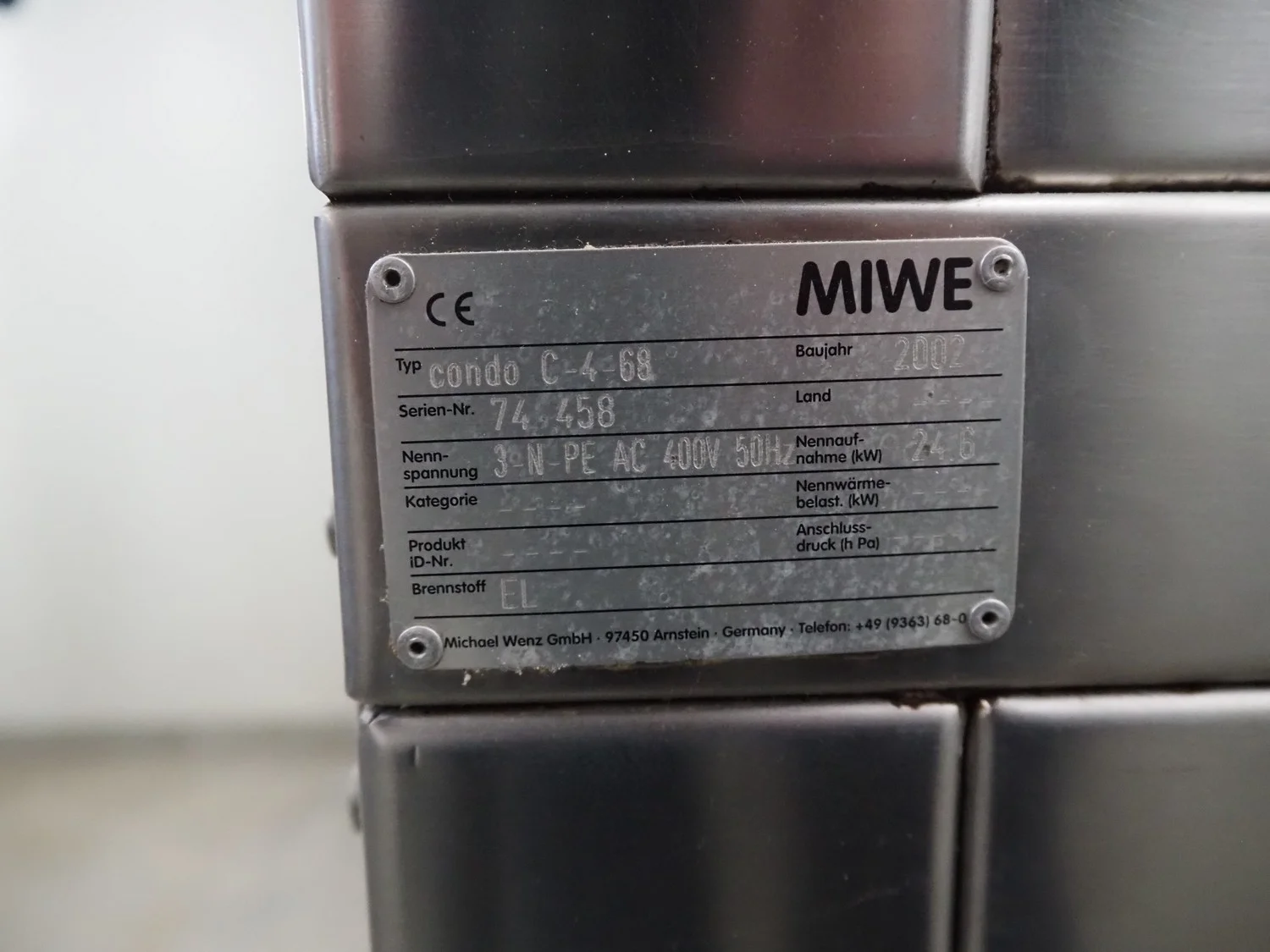 Miwe pizza oven, model: Condo, type: condo C-4 68, serial number: 74 458, year of construction: 2002, 400 V, 50 Hz, 3 Ph, 24.6 kW, 4 floors, electric heated, dimensions floors: (2x) 870 mm x 600 mm x 220 mm, (2x) 870 mm x 600 mm x 170 mm, total dimensions: 1500 mm x 900 mm x 2050 mm.