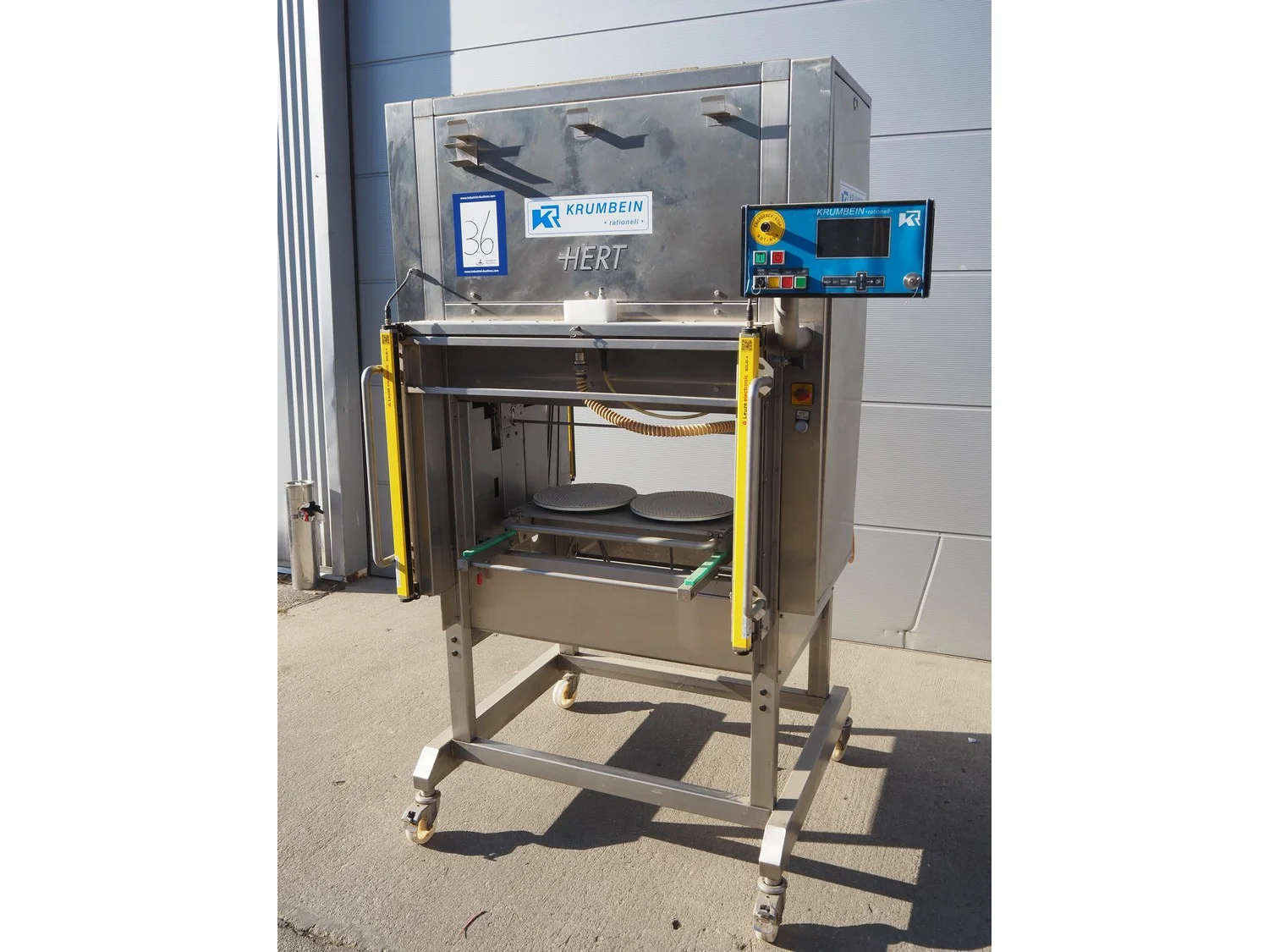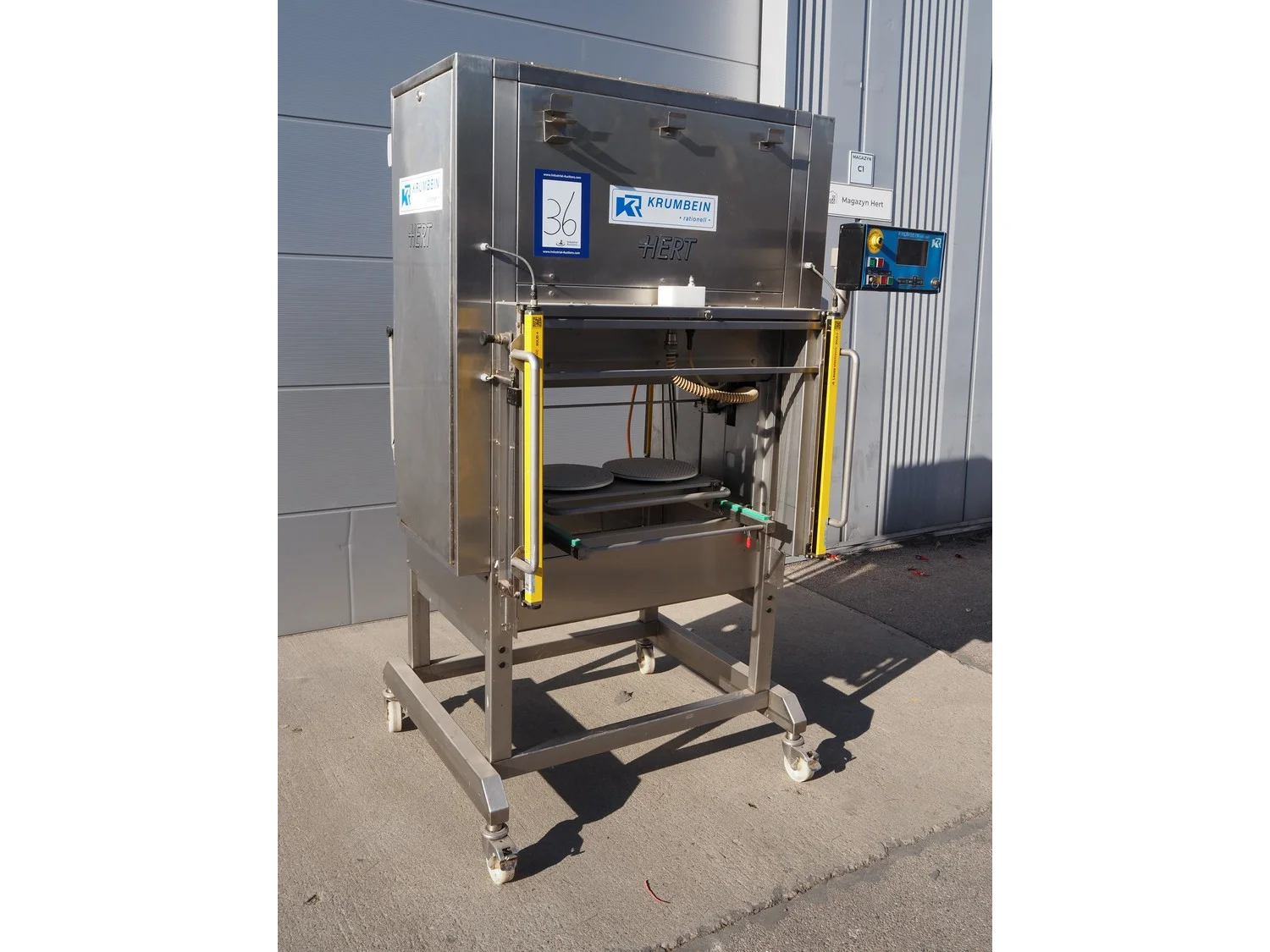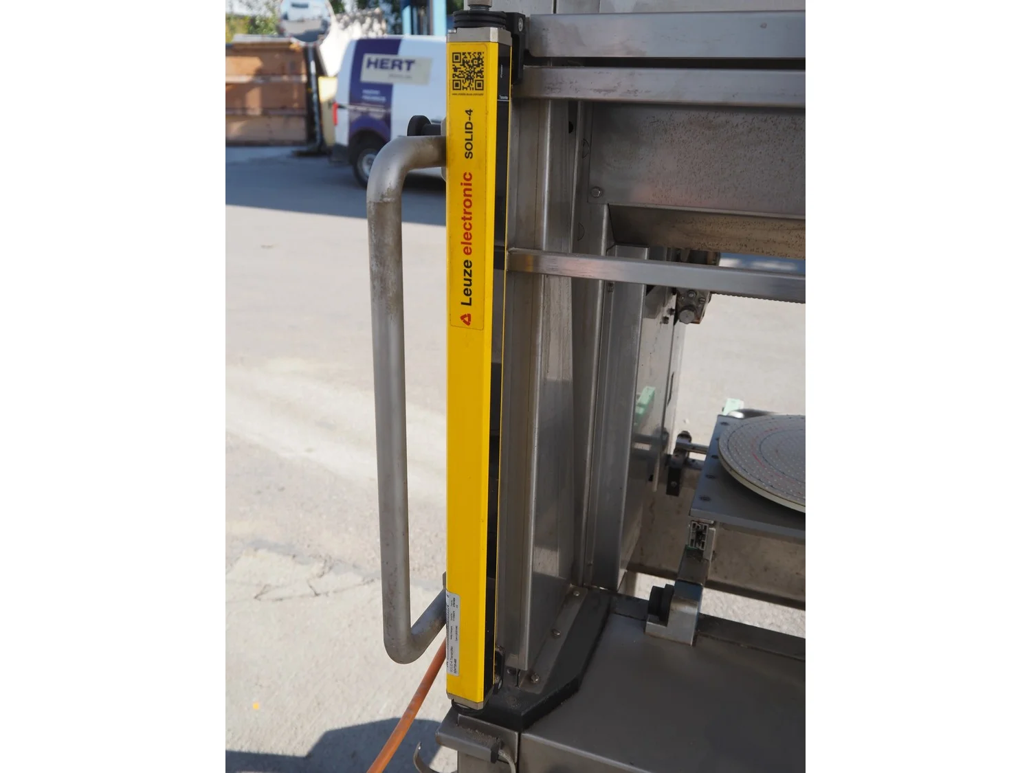 Krumbein cake and confection cutting machine, type: TKSM-R+L 620-OLM-LV, serial number: S 241 6, year of construction: 2012, 400 V, 3 Ph, 50 Hz, 16 A, 2 plates, diameter: 285 mm, length knife: 860 mm, total dimensions: 1100 mm x 1300 mm x 1930 mm.
