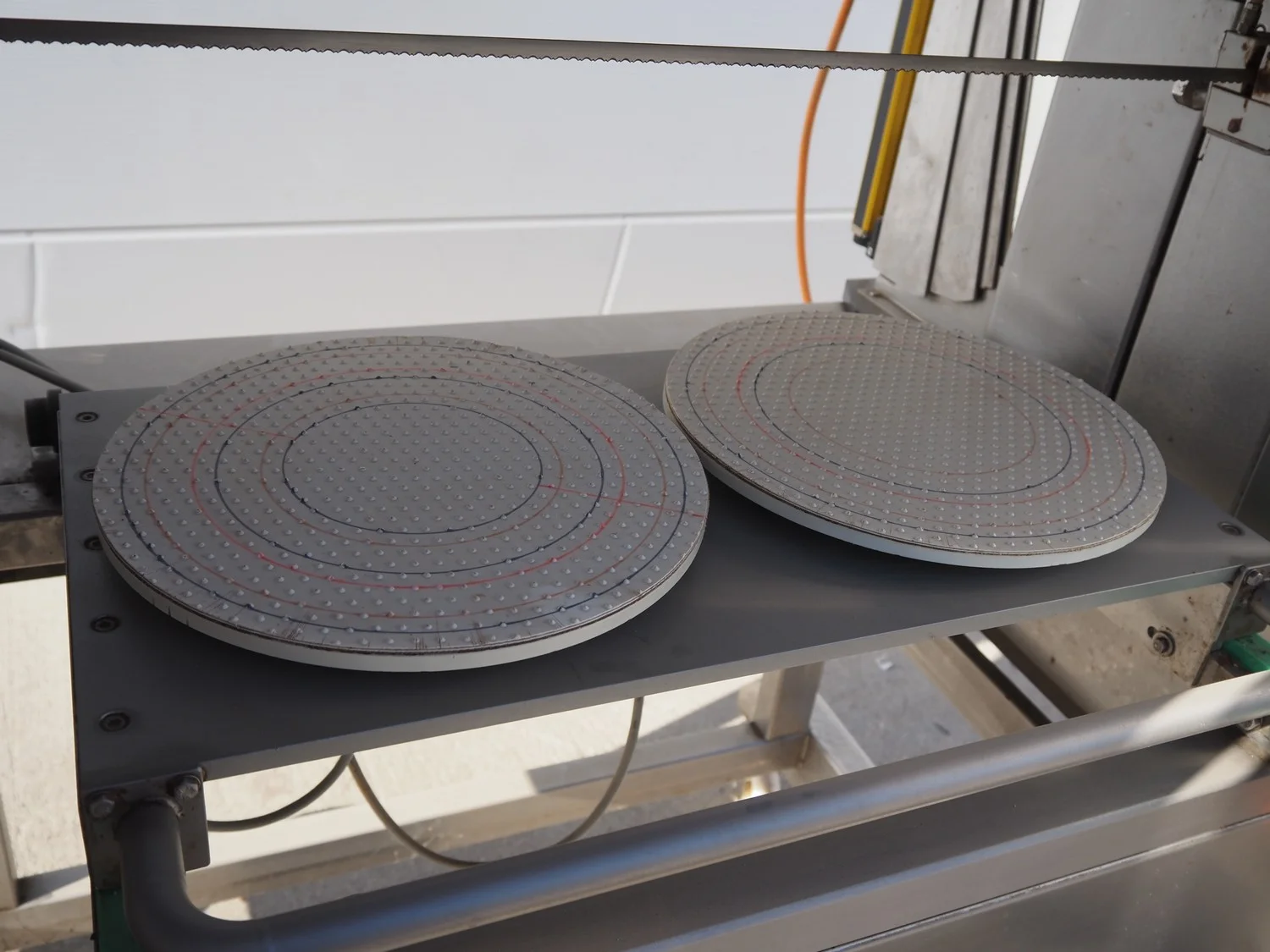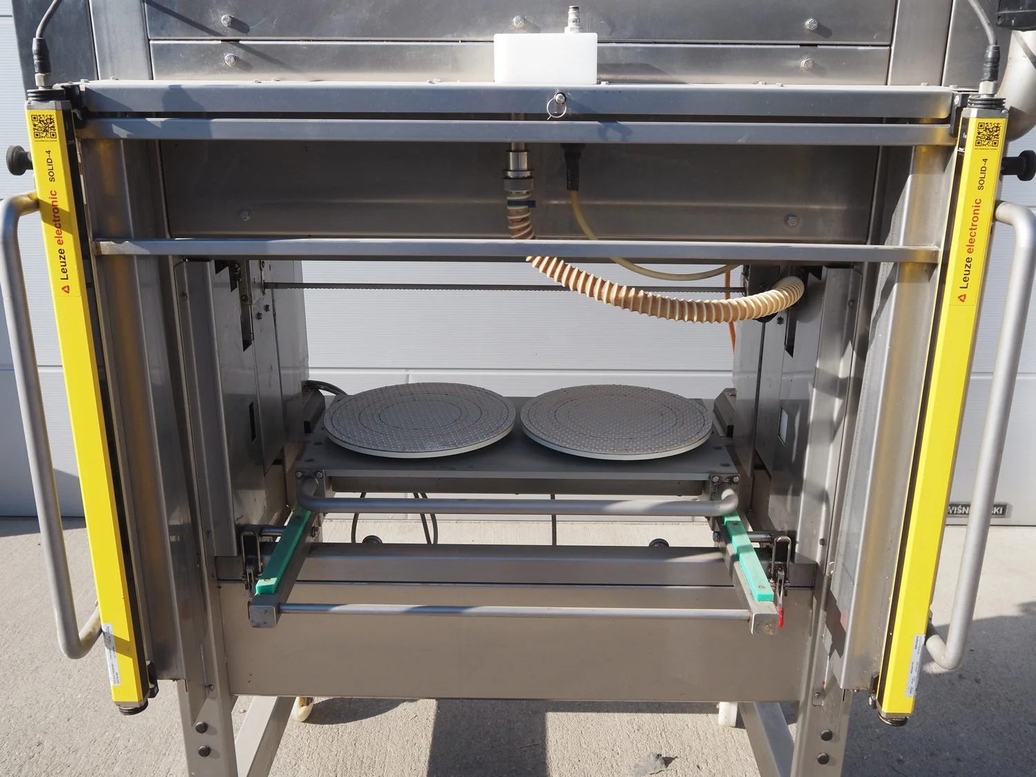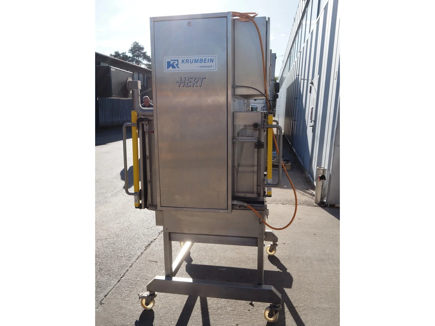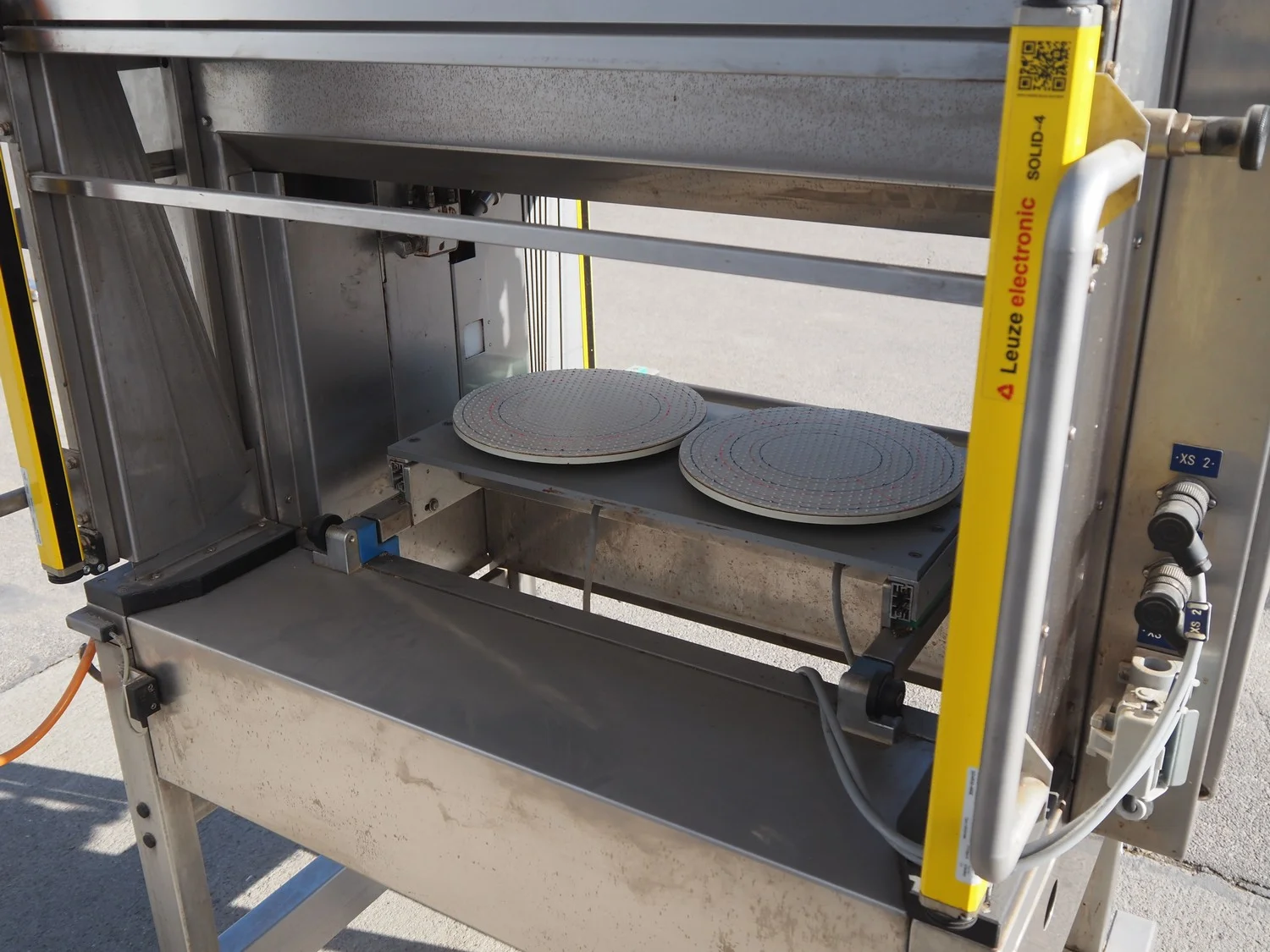 Krumbein cake and confection cutting machine, type: TKSM-R+L 620-OLM-LV, serial number: S 241 6, year of construction: 2012, 400 V, 3 Ph, 50 Hz, 16 A, 2 plates, diameter: 285 mm, length knife: 860 mm, total dimensions: 1100 mm x 1300 mm x 1930 mm.