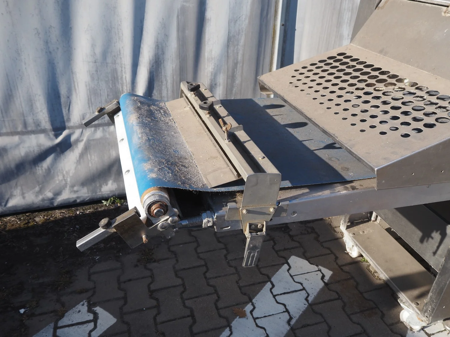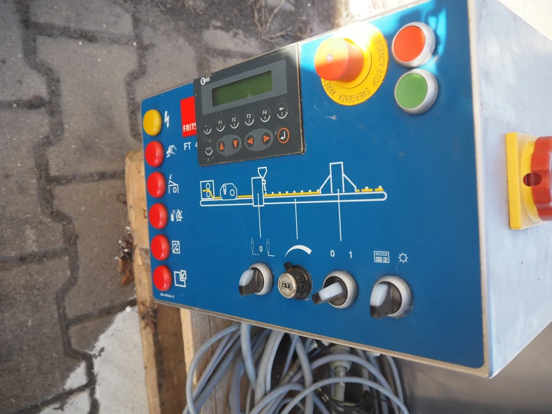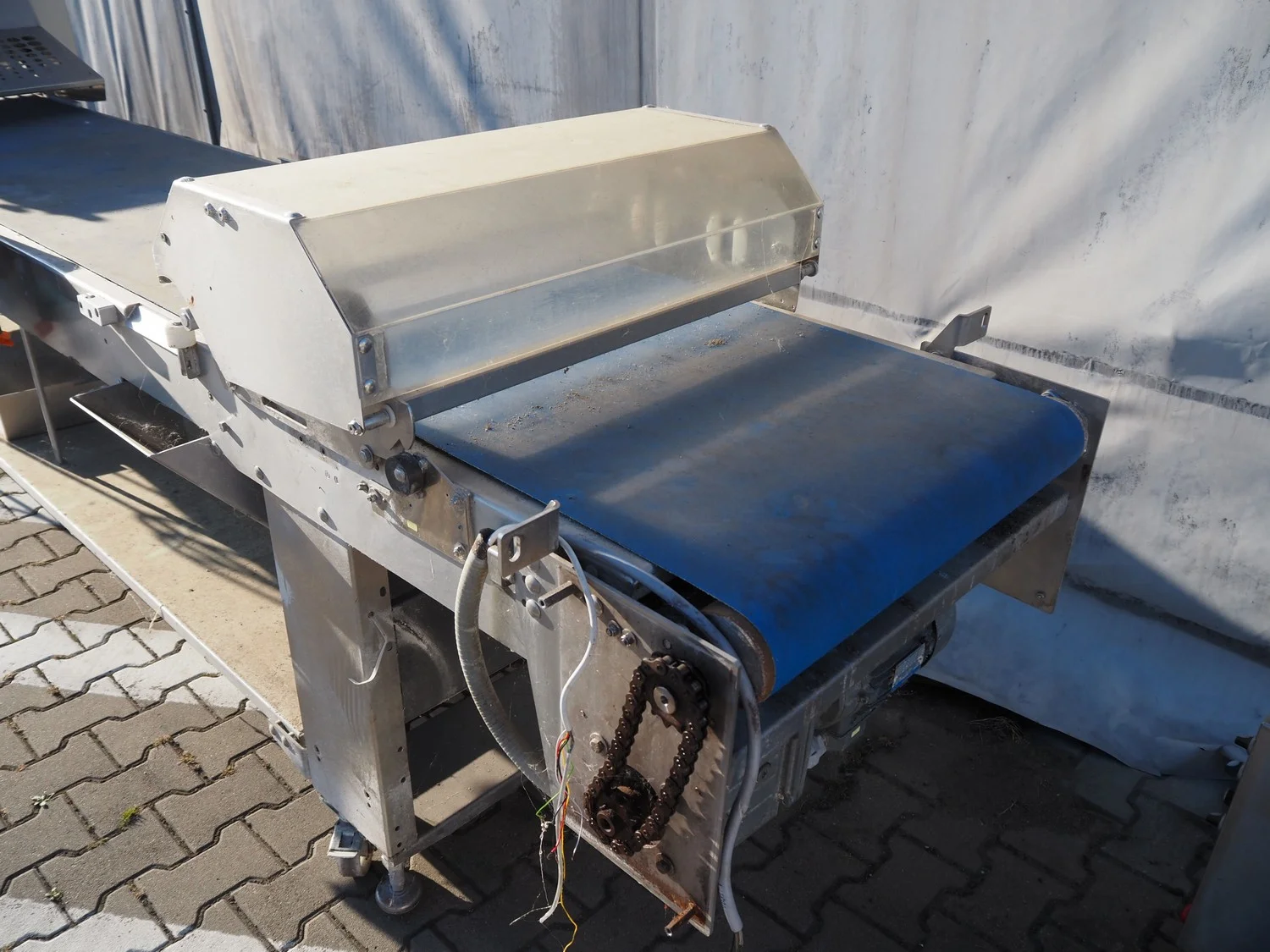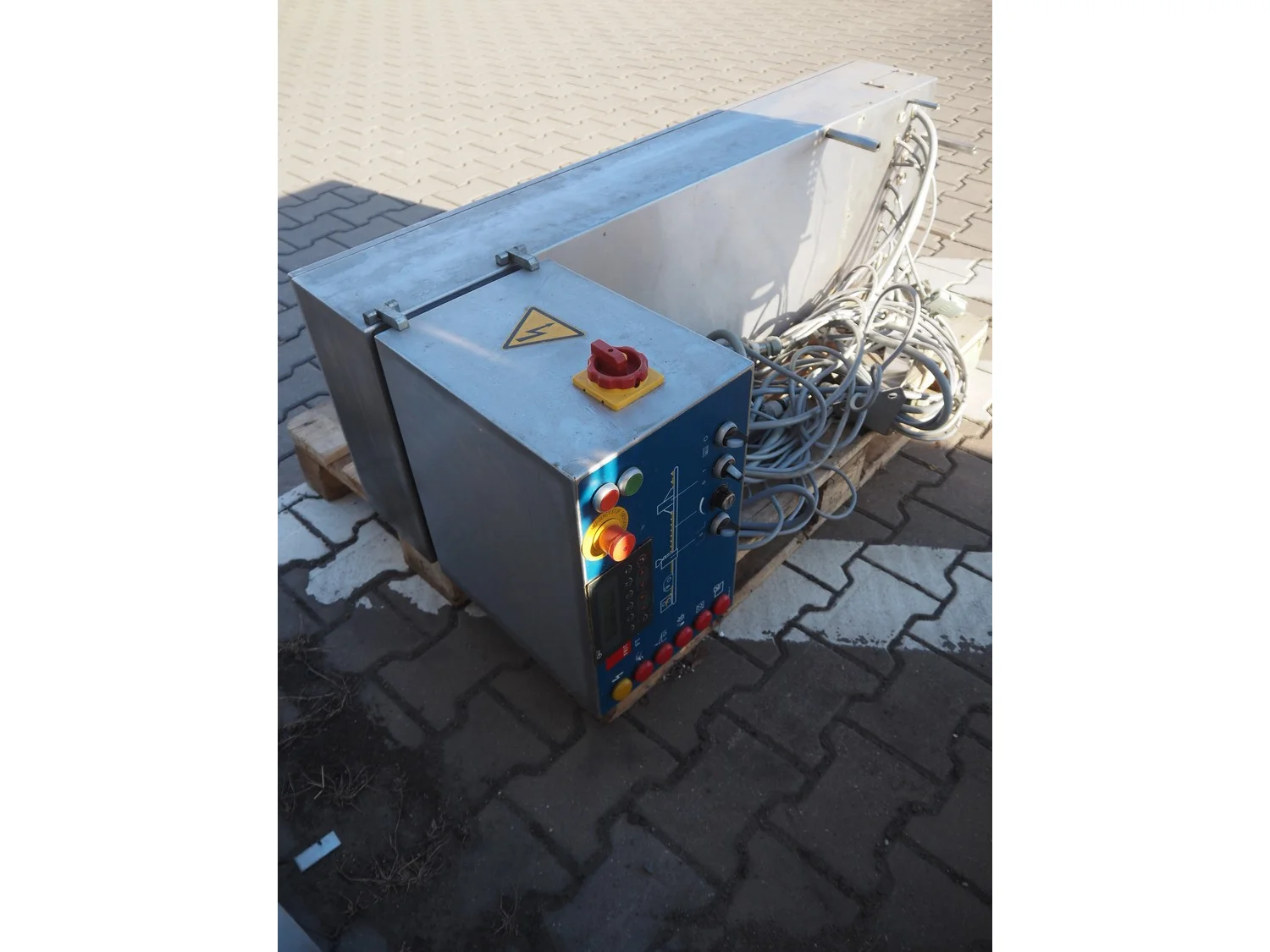 Fritsch laminating machine, plastic belt, belt width: 630 mm, total dimensions: 5000 mm x 1100 mm x 1540 mm. Incomplete.