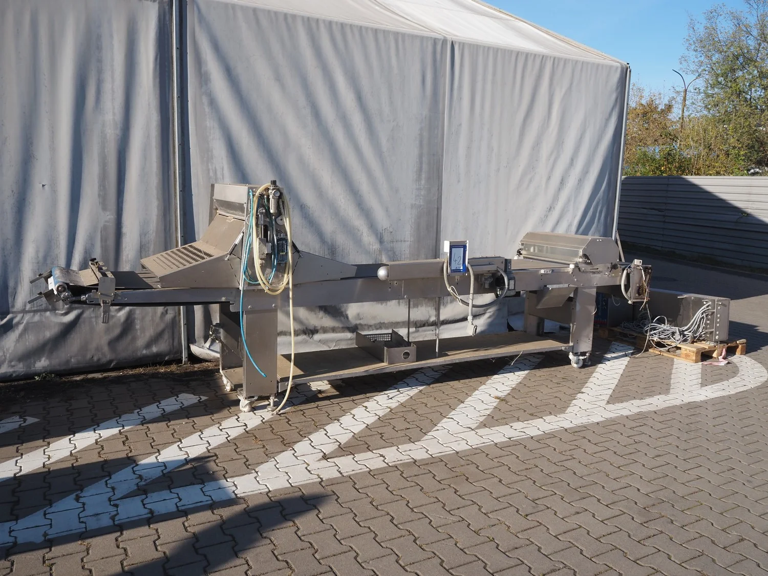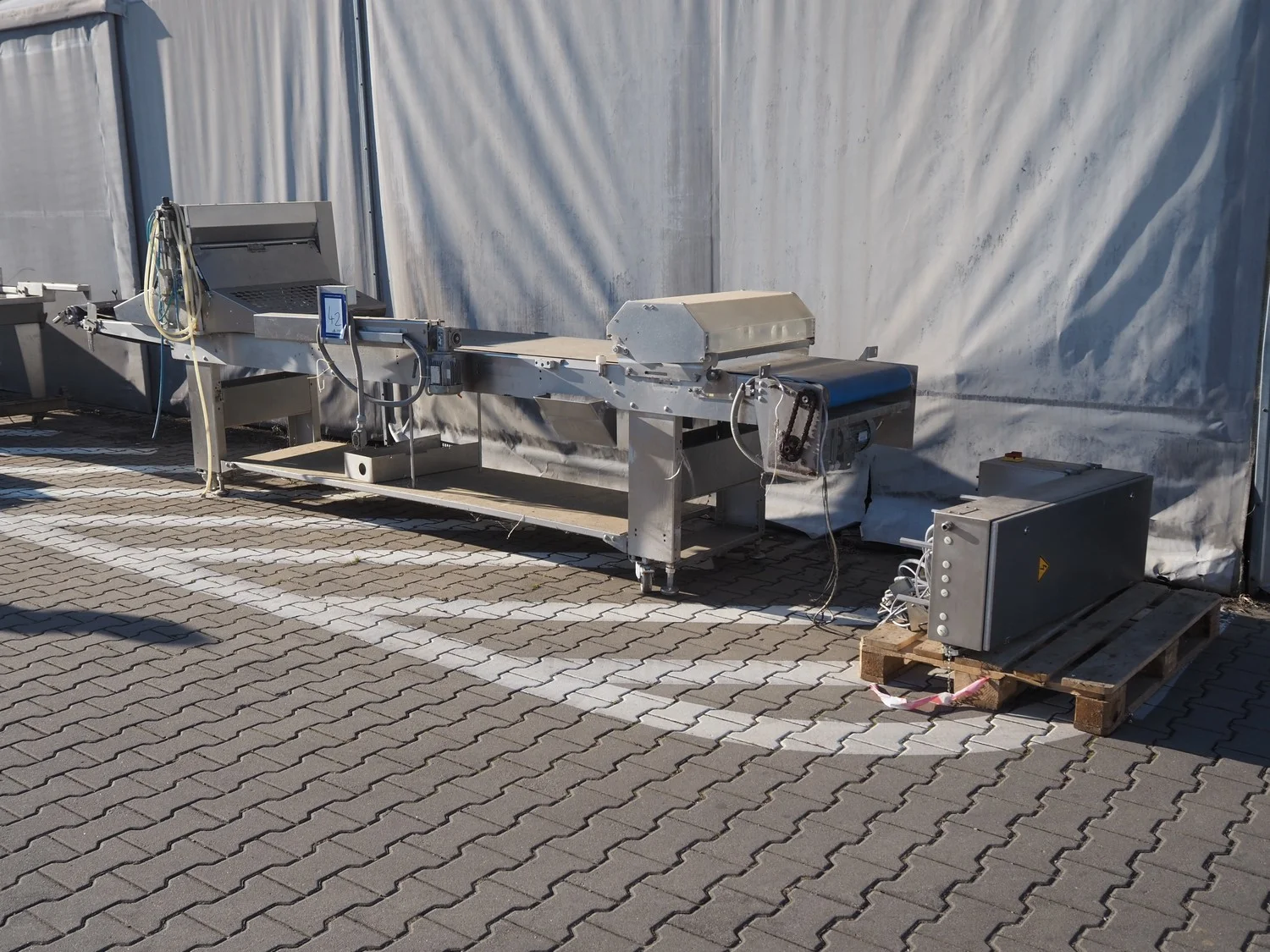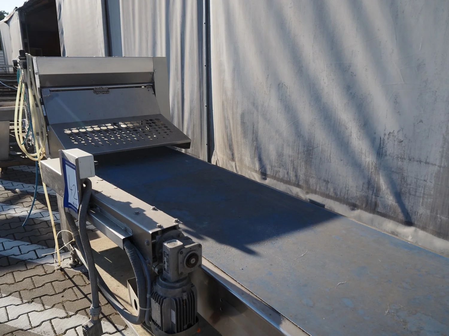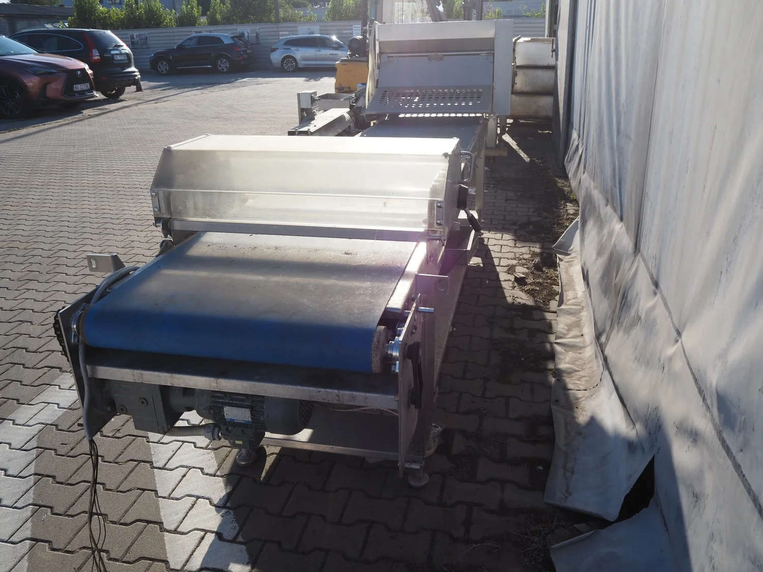 Fritsch laminating machine, plastic belt, belt width: 630 mm, total dimensions: 5000 mm x 1100 mm x 1540 mm. Incomplete.