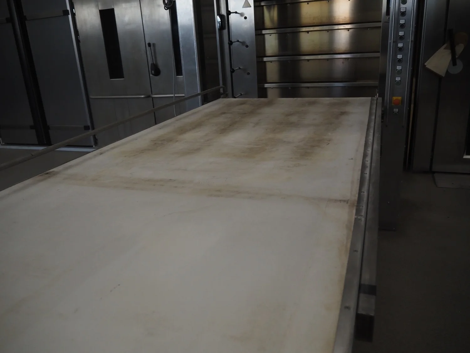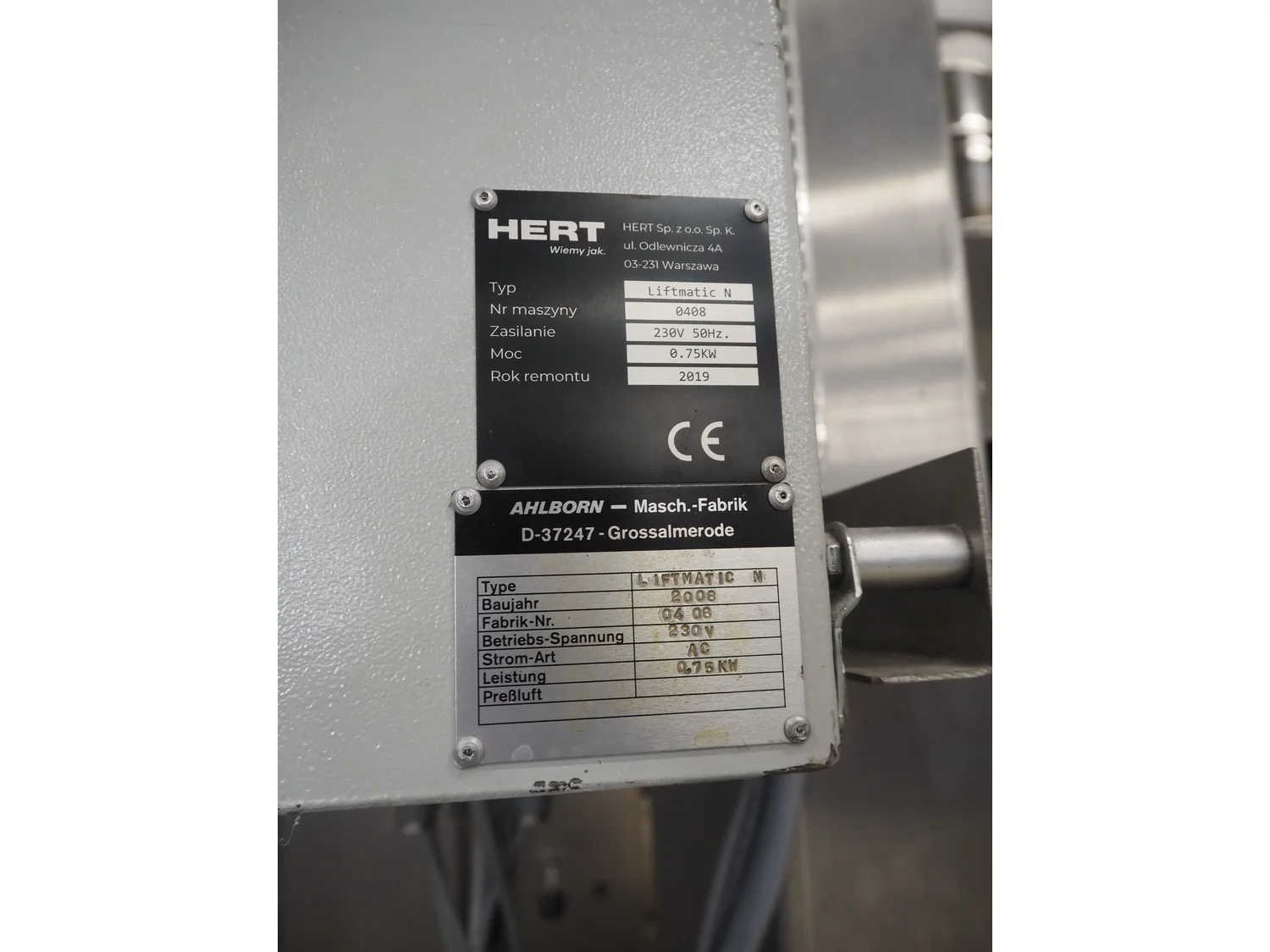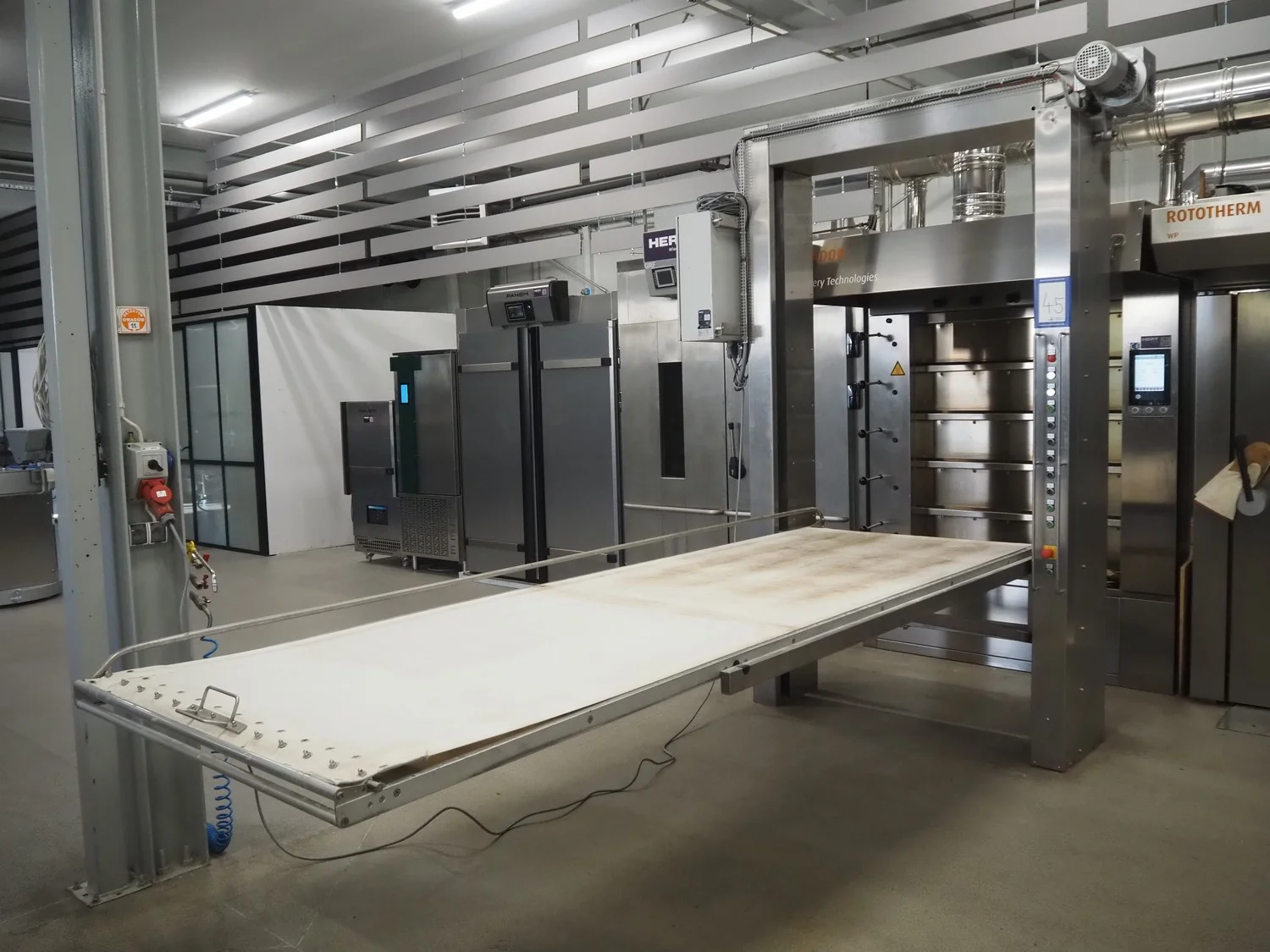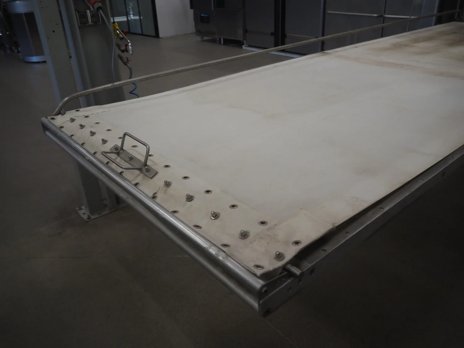 Ahlborn lifting oven loading belt, type: LIFTMATIC N, fabrication number: 04 08, year of construction: 2006, 230 V, 0.75 kW, cloth belt, belt width: 1120 mm, lifting height: 2400 mm, total dimensions: 3670 mm x 1880 mm x 2800 mm.