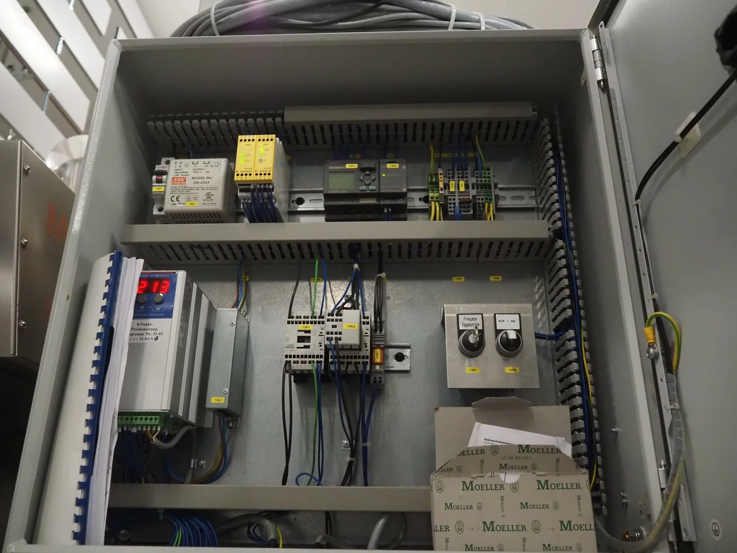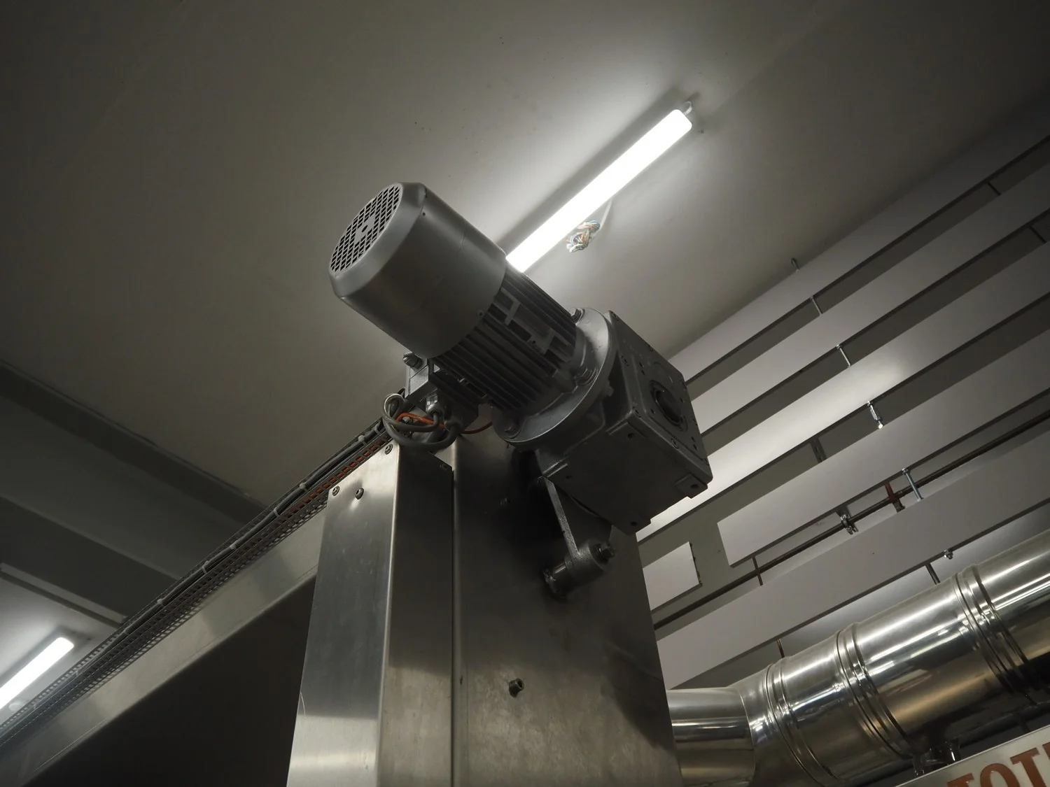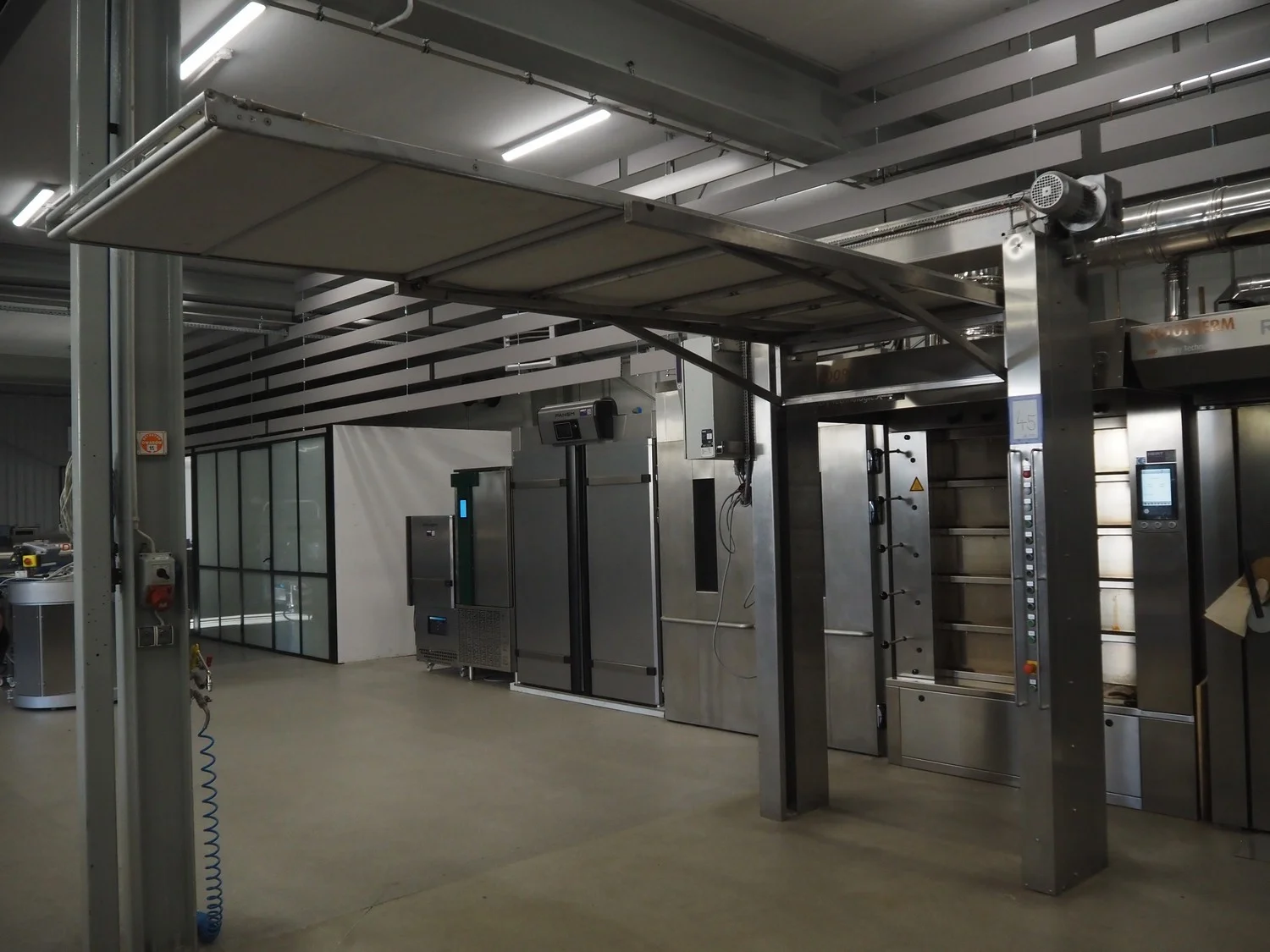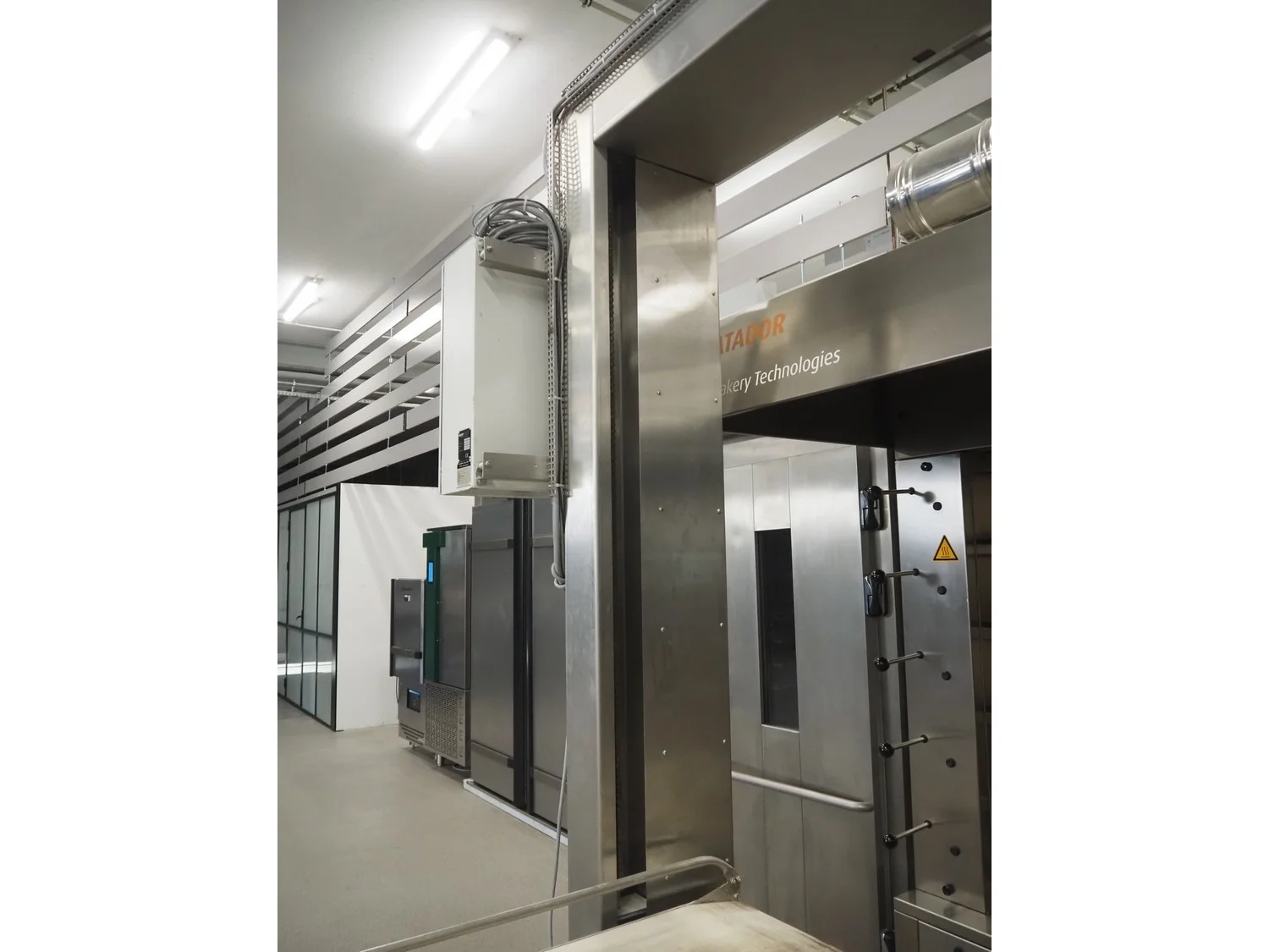 Ahlborn lifting oven loading belt, type: LIFTMATIC N, fabrication number: 04 08, year of construction: 2006, 230 V, 0.75 kW, cloth belt, belt width: 1120 mm, lifting height: 2400 mm, total dimensions: 3670 mm x 1880 mm x 2800 mm.