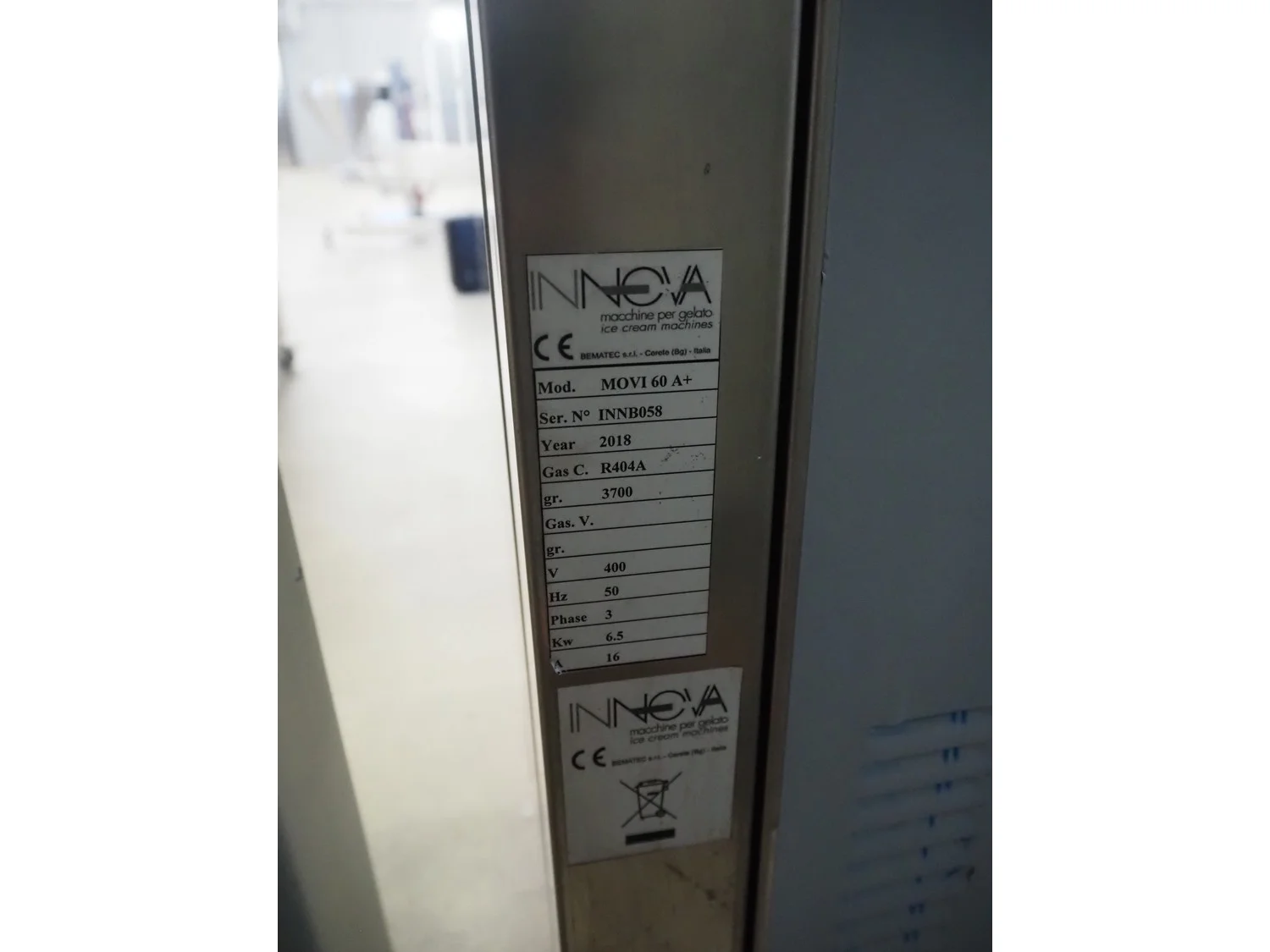 Innova ice cream machine, model: MOVI 60 A+, serial number: INNB058, year of construction: 2018, 400 V, 3 Ph, 50 Hz, 16 A, 6.5 kW, refrigerant: R404a/3700 g, dimensions: 850 mm x 610 mm x 1440 mm.