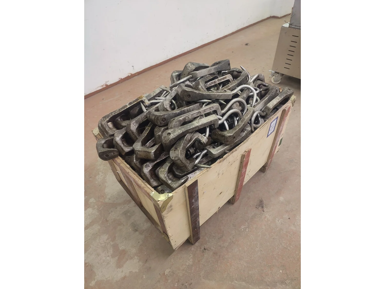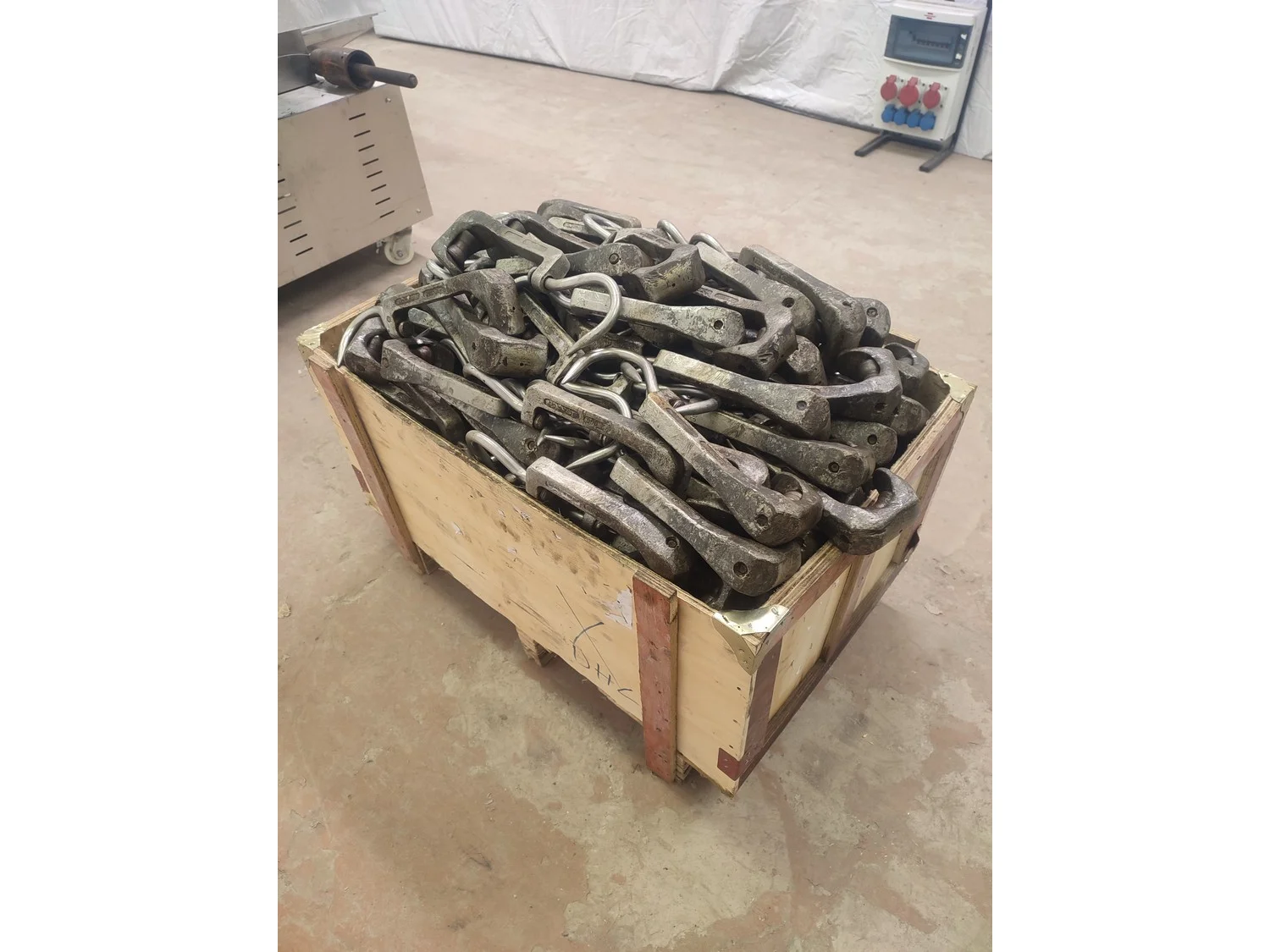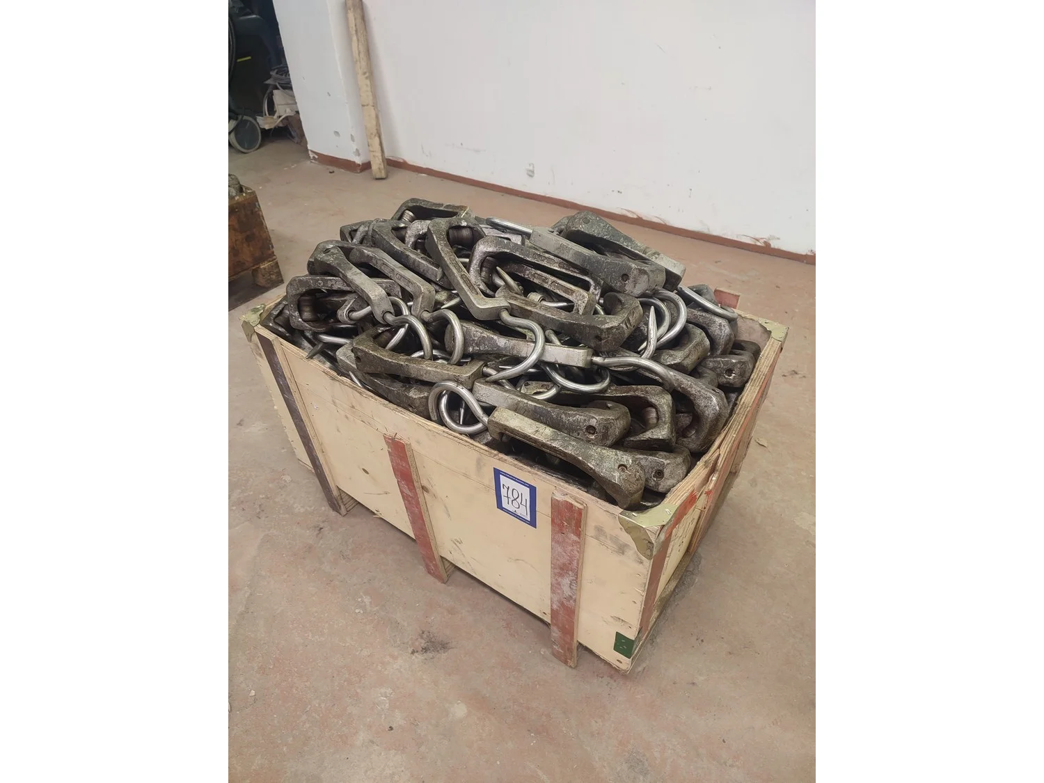 Wooden pallet box with 230 roller meat hooks, dimensions hooks: 360 mm x 115 mm x 50 mm, dimensions pallet box: 920 mm x 550 mm x 700 mm.